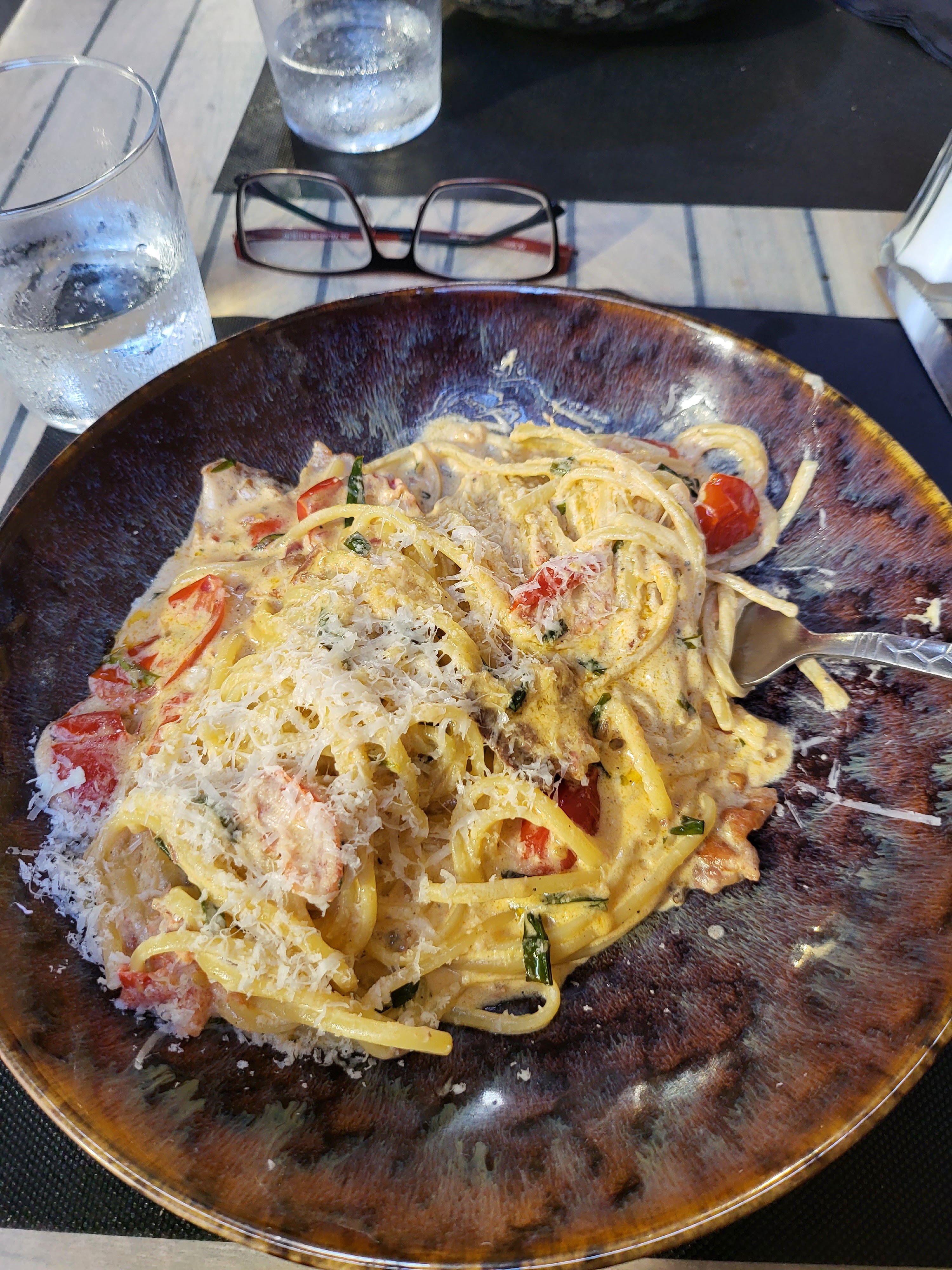 Superbe assiette de pâtes aux fruits de mer et carbo (la vraie). Serveur très sympathique mais si un peu tête en l’air ce soir 🤣. Prix très raisonnable pour la quantité et la qualité proposée!