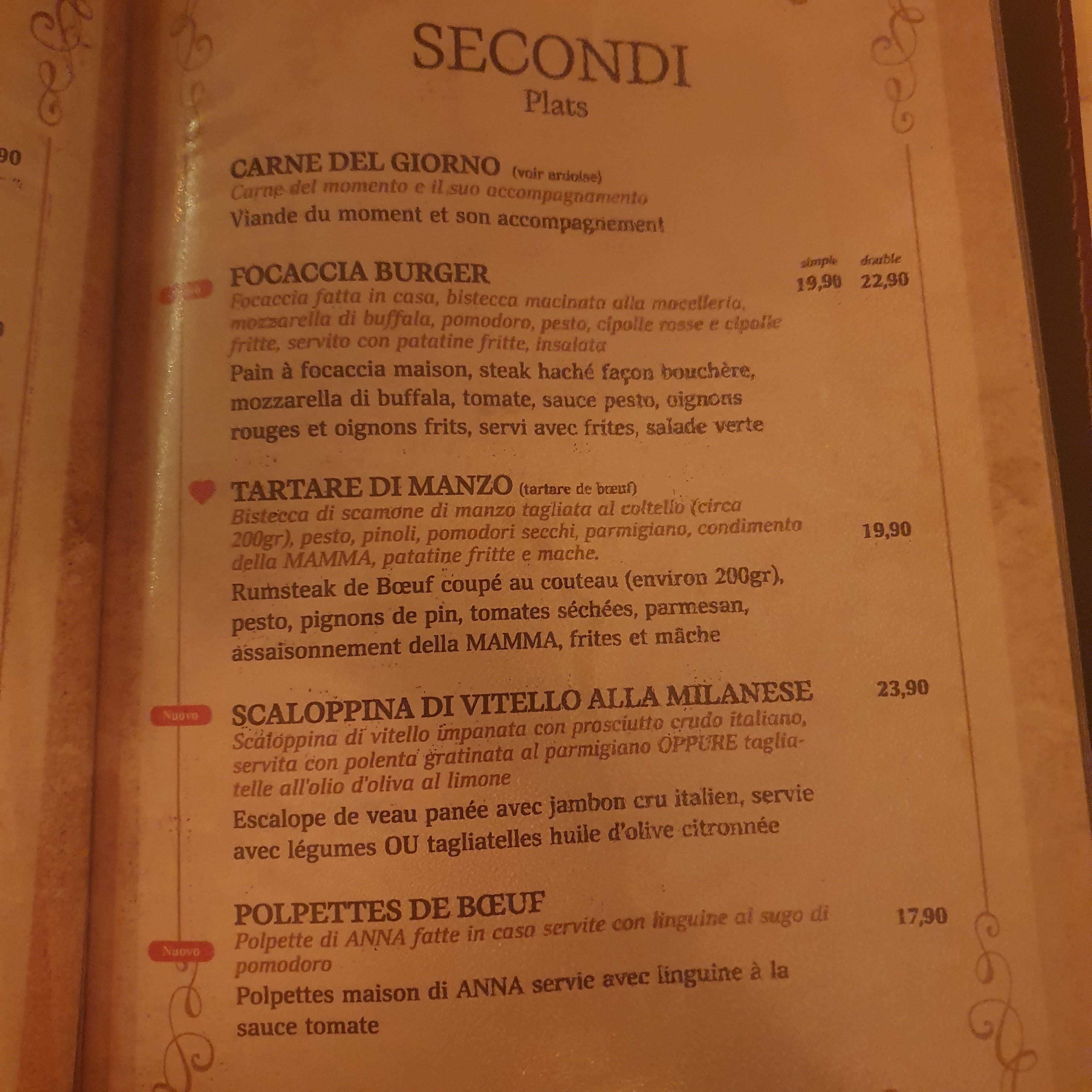 Première fois chez Anna trattoria, et vraiment pas déçu, la déco est sublime, musique italienne. Un super choix de spritz pour nous qui adorons ça. En entrée l'assiette qui se partage de fromage et charcuterie, heureusement que nous étions 4 sinon ça aurait fait trop pour deux, mais s'était un délice. Focaccias burger bonne mais je pensais que ça serait servi chaud. Nous avons adorés, et nous reviendrons avec plaisir pour manger des produits de qualités.