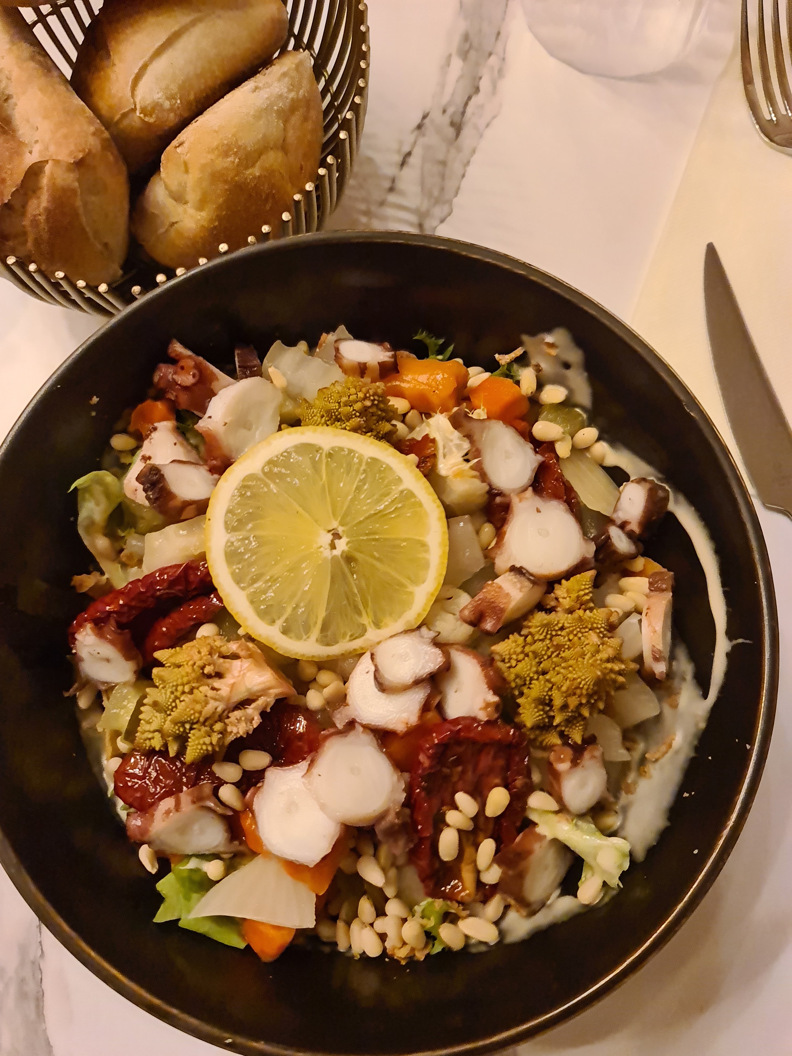 Votre steack tartare est unique avec l'ajout de tomates séchées. J'ai essayé le poulpe je n'ai pas eu le plaisir escompté. L'accompagnement avec les pointes d'asperger était amer et il n'y avait pas assez de citron pour équilibrer l'ensemble. C'était bon mais ce n'était pas aussi bon que ce que j'avais imaginé. Les desserts étaient beaux et bons avec un petit plus pour la vaisselle choisie pour les présenter. Le service était très bien, efficace, souriant et discret. Une très belle soirée, un petit avant goût des vacances.