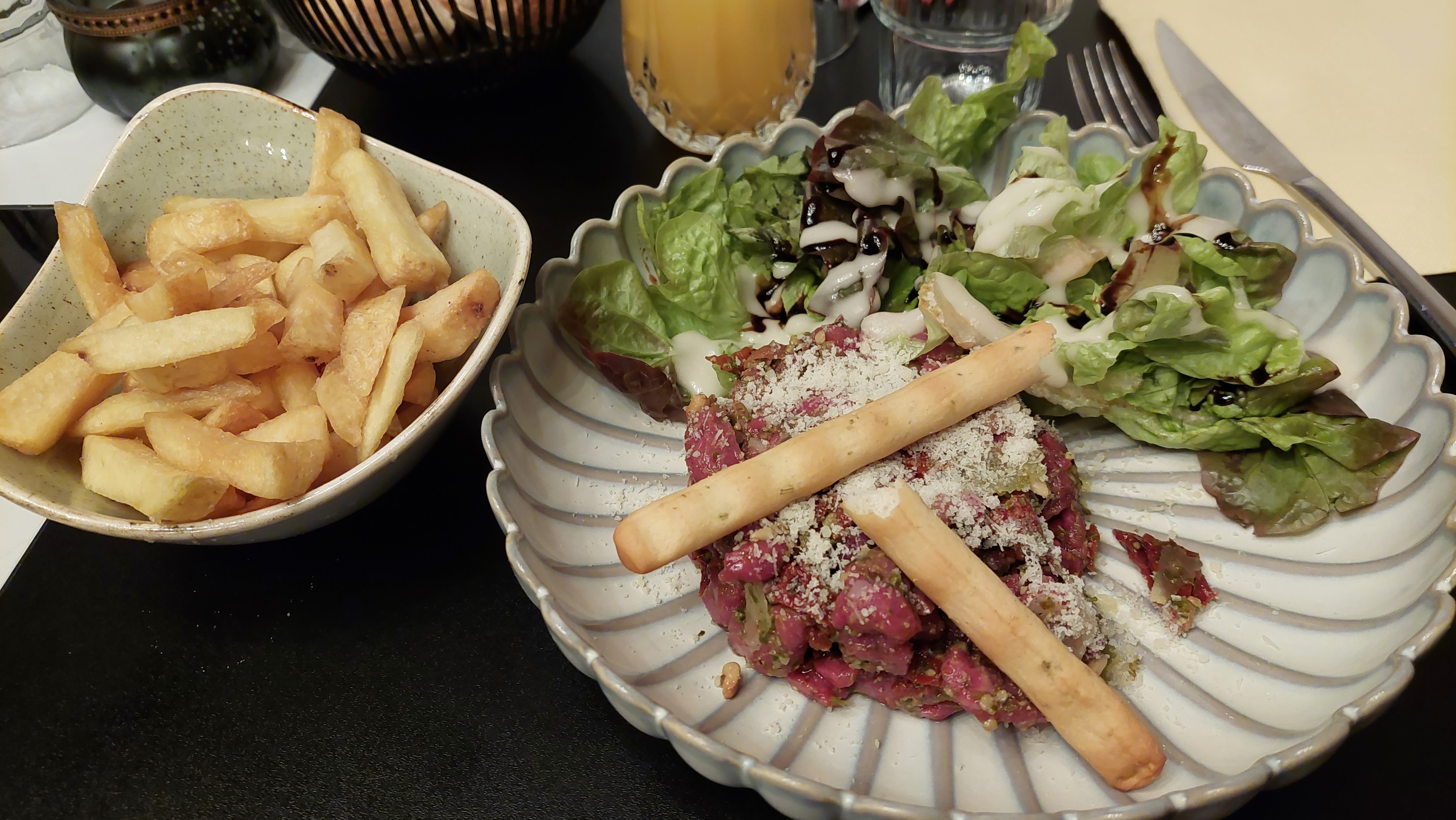 + : cadre très jolie avec une belle décoration ; un service impeccable, félicitations a notre serveur qui a été très rapide dans le service et très attentif ; enfin le burger, les pâtes au poulet, le tartare étaient très bons. Et les desserts étaient énormes et super bons !!! Malheureusement impossible de tout terminer... - : les pâtes à la truffes sont en petite quantité par rapport au prix. Le plat était bon, mais le goût de la truffe était très léger. Je ne le sentais qu'à peine. Pour avoir comparer plusieurs plats à base de truffe dans d'autres restaurants. Enfin c'est un petit - pour la chaleur dans la pièce, nous étions au dernier étage et il faisait assez chaud.