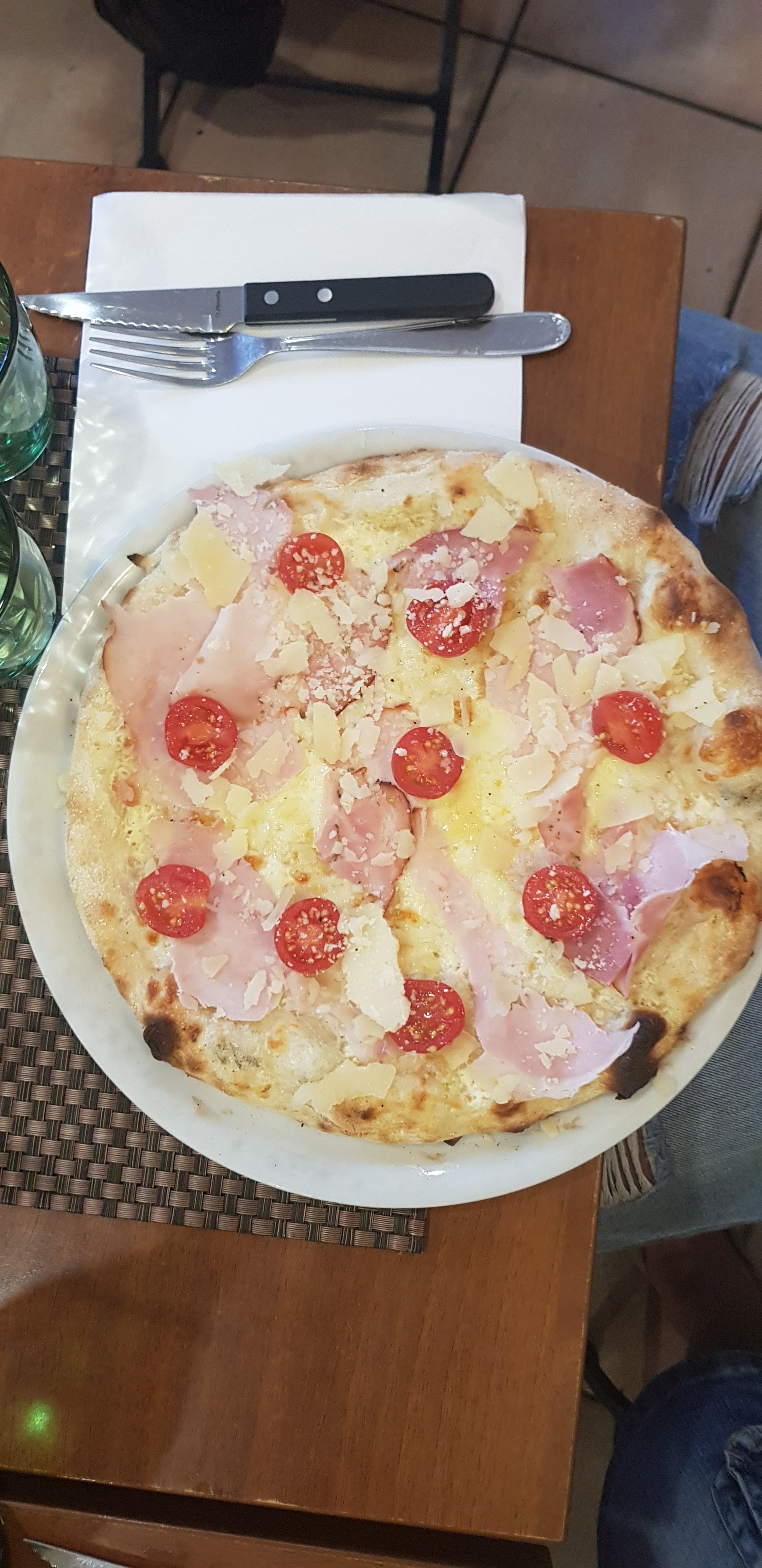 Les pizzas sont plutôt copieuses, à un tarif raisonnable pour le lieu (ils se rattrapent un peu sur les boissons, mais c'est dans la norme de cette ville). Un des membres du staff était un peu envahissant...