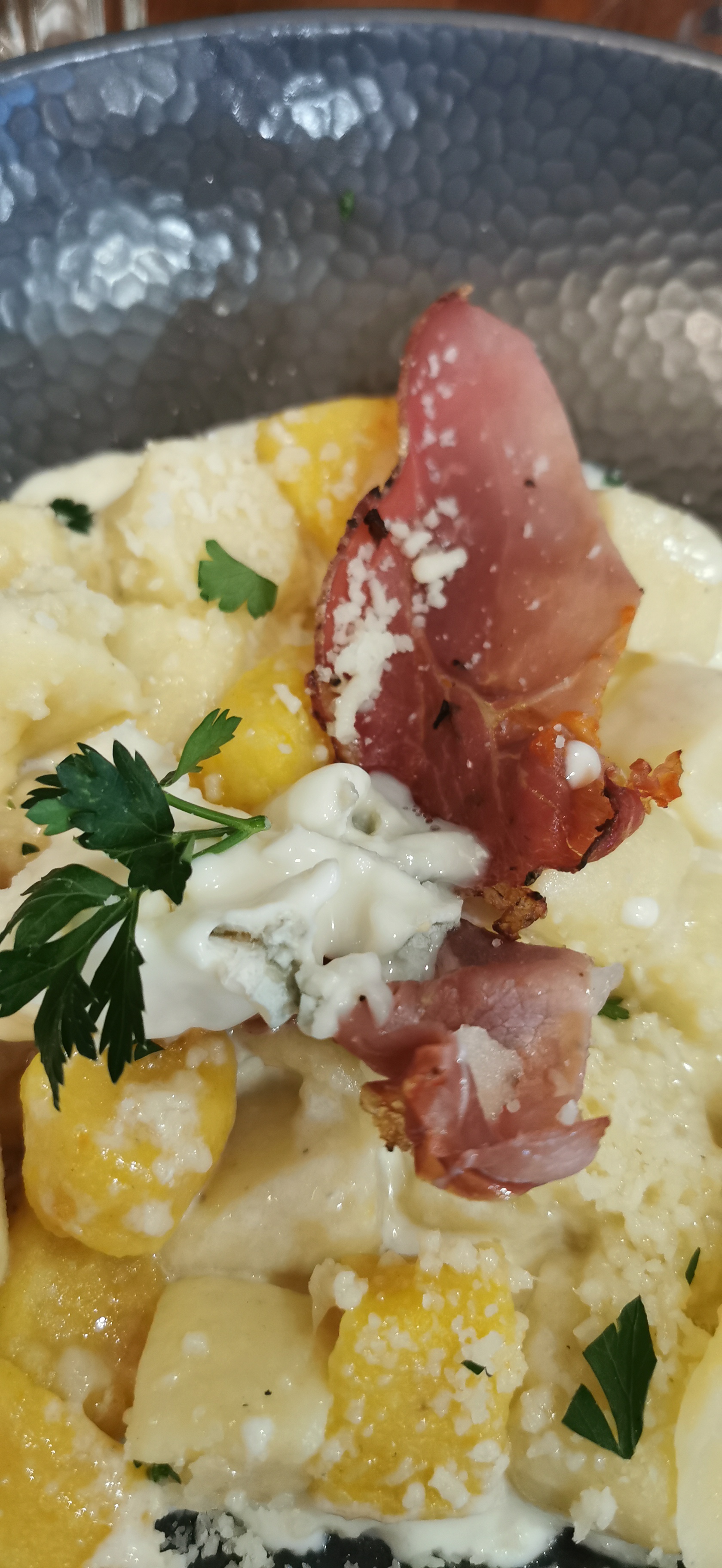 Encore un très bon repas en famille et pas déçu comme d'habitude. Aujourd'hui gnocchis au ragoût de veau et raviolis maison ricotta épinard et huile de noisettes en plat du jour et les spaghettis carbonara, juste succulent. Merci encore à bientôt