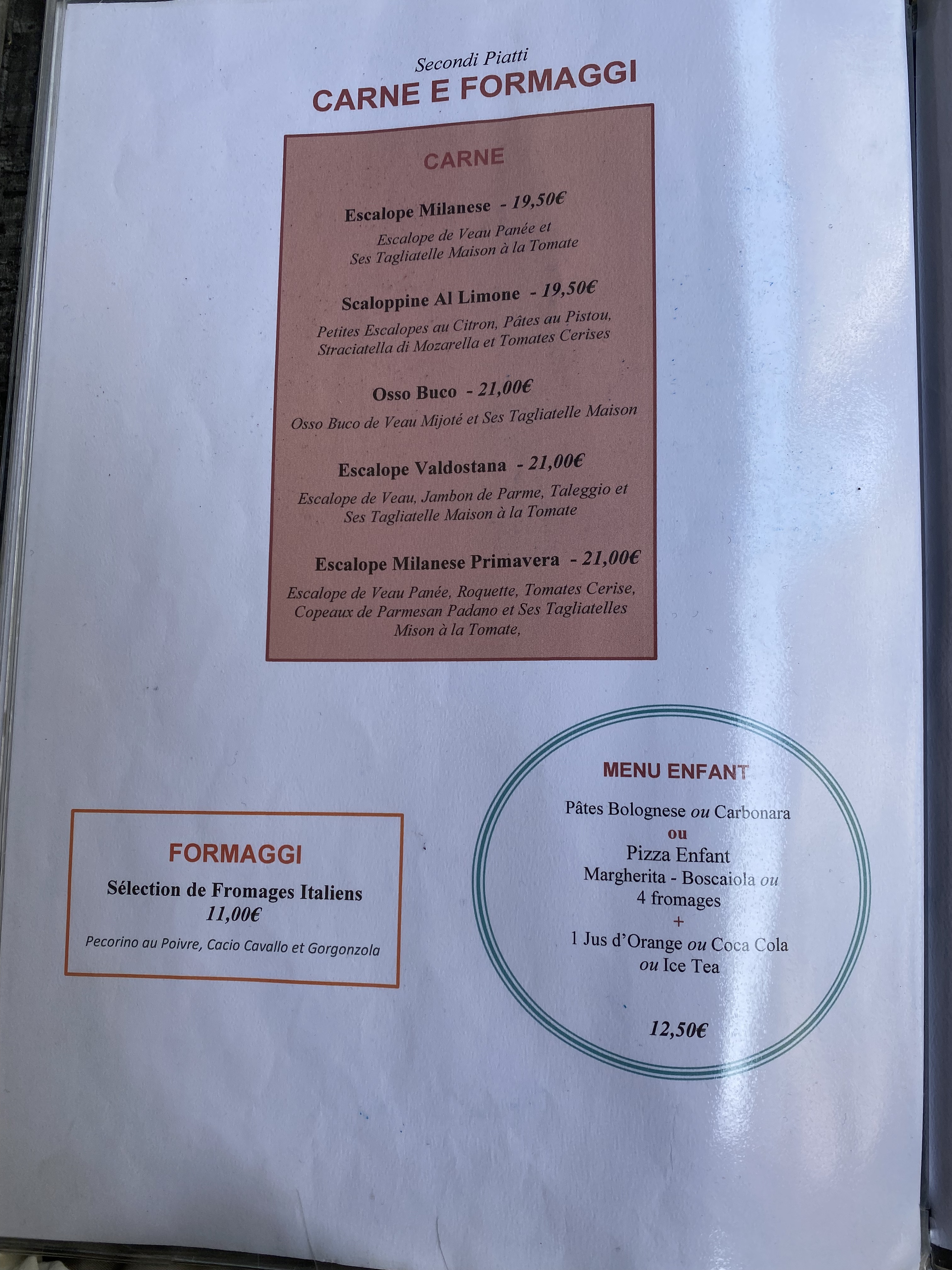 Le service l'accueil bien. L'ambiance et la chaleur du restaurant pas top. Les chaises pas terrible car se sont des lattes séparées et non une assise pleine. Le plat était bon. Le pain moyen. Escalope milanese et pâtes tomate bonnes. Serveuse adorable toujours le sourire. A mon avis restaurant esprit très très familiale. Ceux en terrasse étaient privilégié. Je l'ai remarqué donc n'aimant pas le manque d'impartialité... sinon convenable pour un passage rapide.