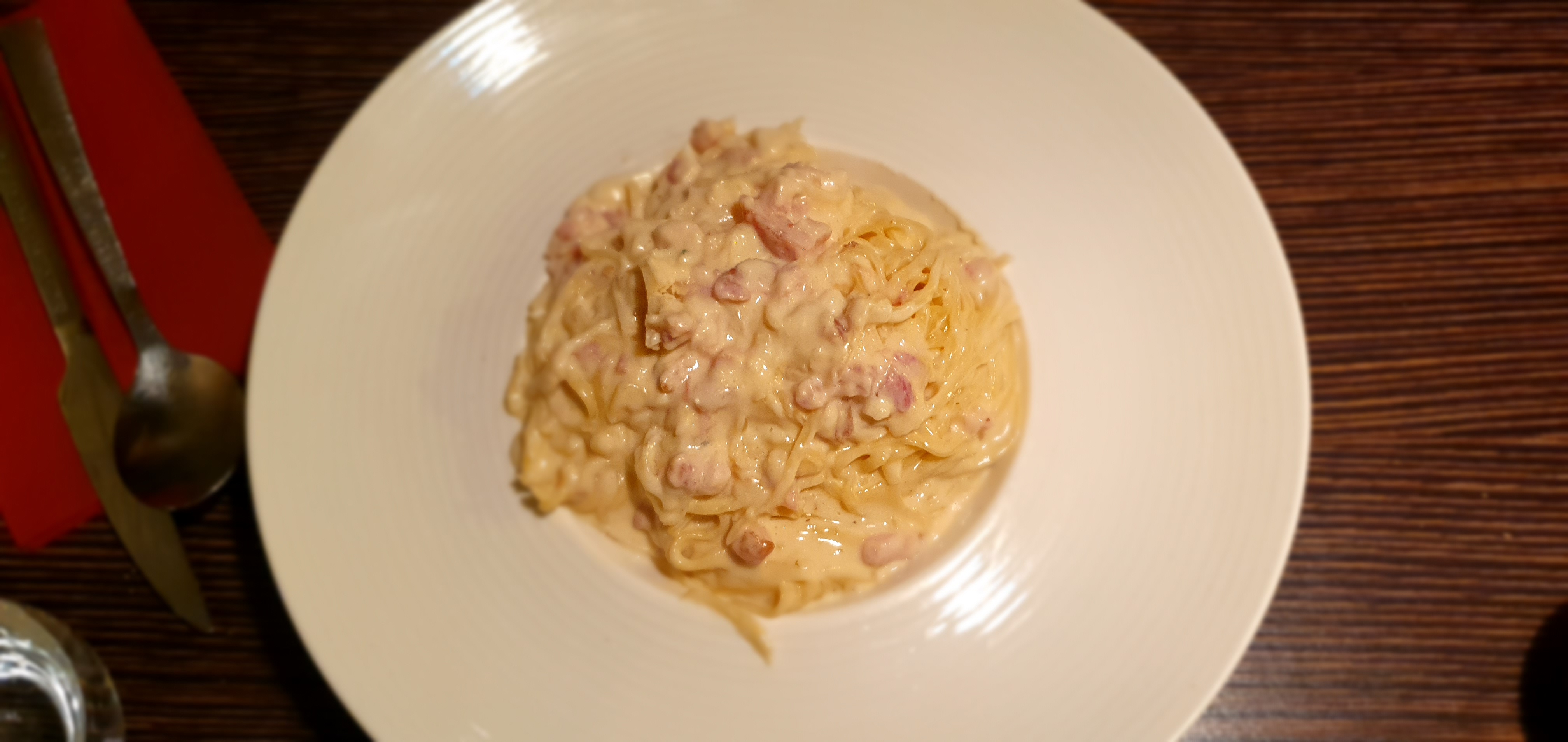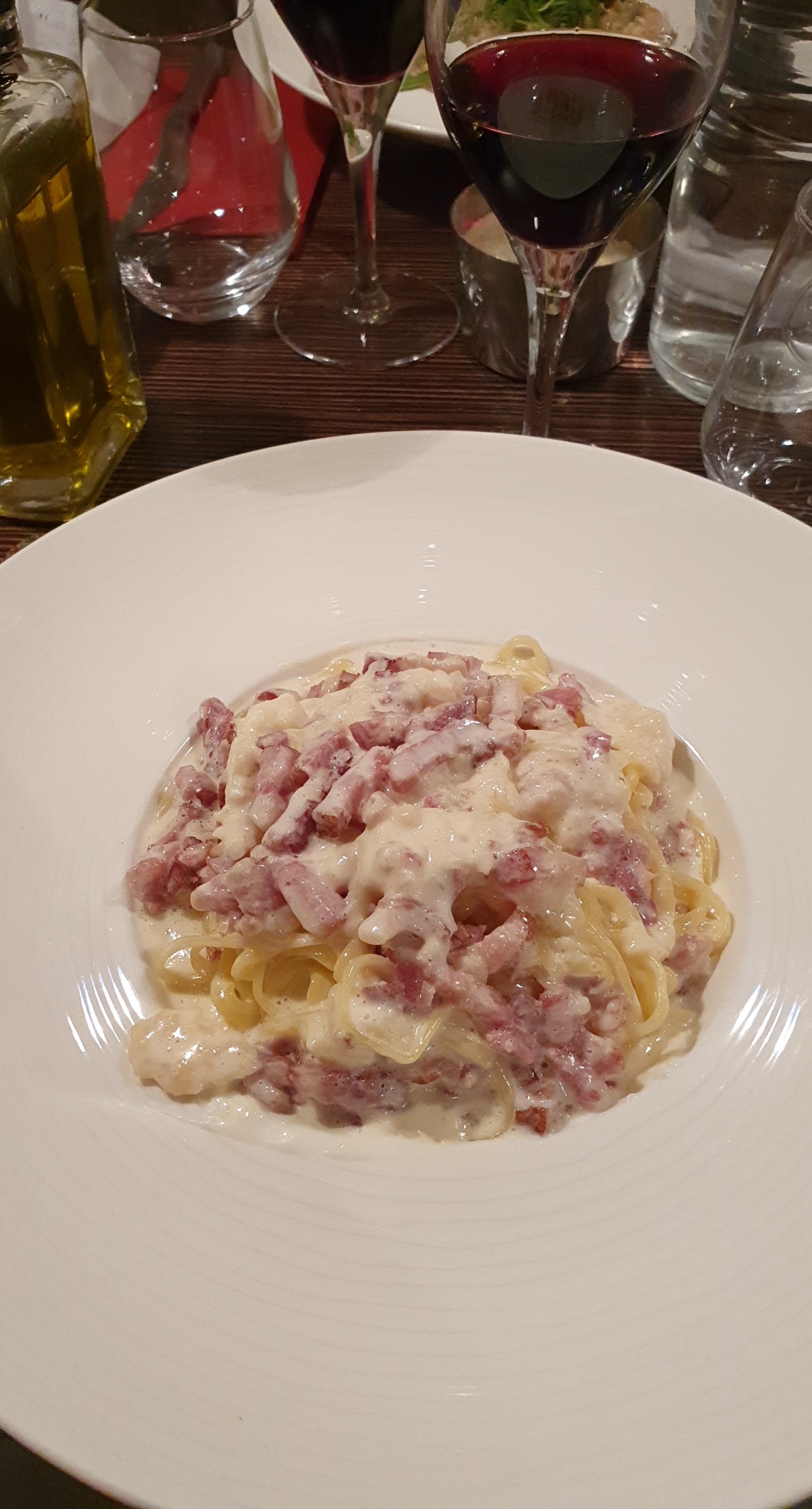 Repas familial tardif. Décor agréable, accueil sympathique. Les plats sont copieux mais rien d'extraordinaire. La carbonara dans la meule reste très folklorique. Merci de revoir lavraie recette ! Pas de lardons, et pas de crème, absence de poivre qui donne son nom au plat!. L'escalope milanaise servie à la verticale autour de grosses pâtes était très raide. Le bar était bien cuit mais là aussi tout était fade. Heureusement, très bon vin vénitien. Expérience très mitigée.