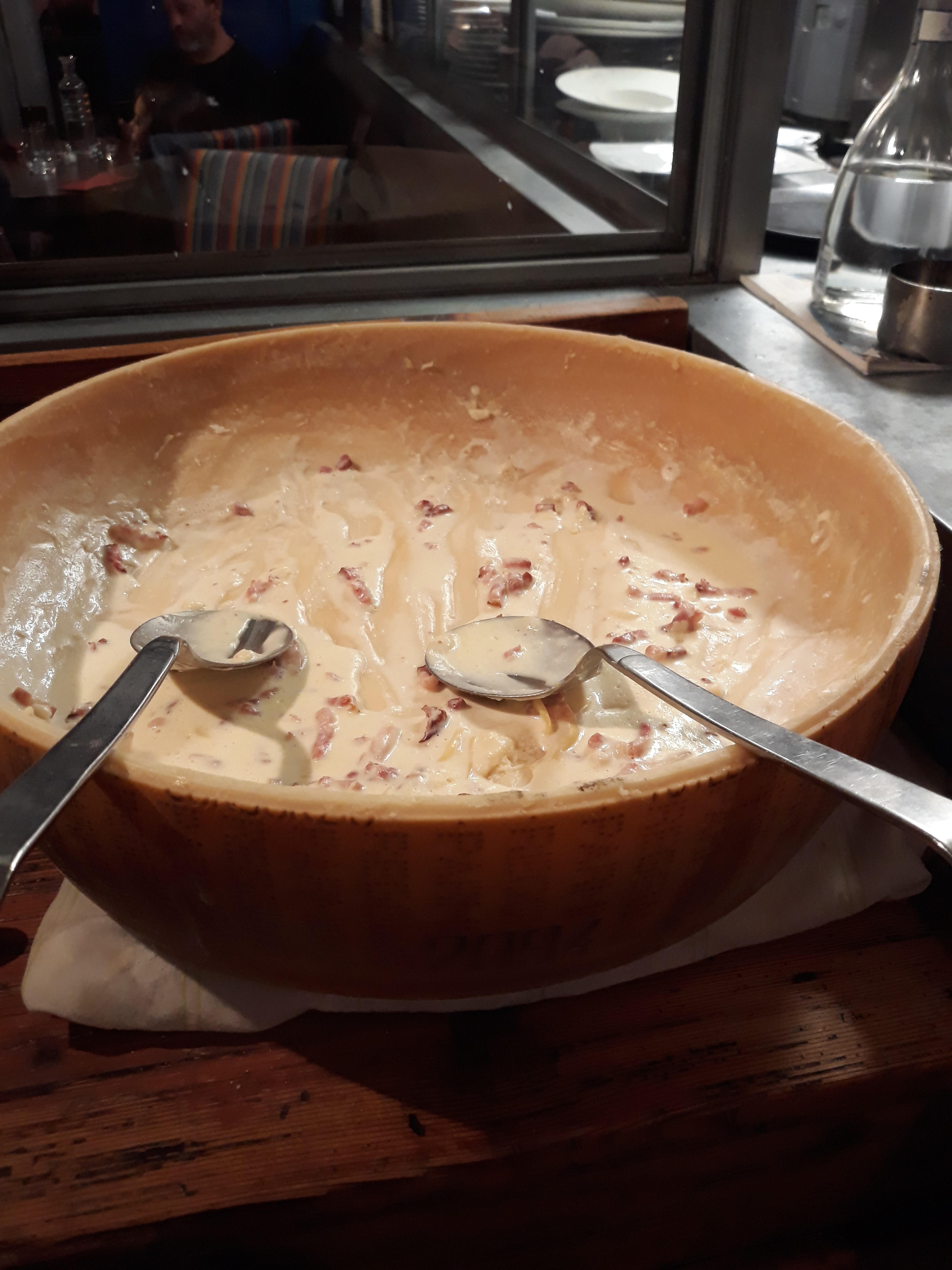 Petit restaurant italien préparant d'excellentes linguines à la carbonara préparées directement dans la meule de parmesan C'est excellent !