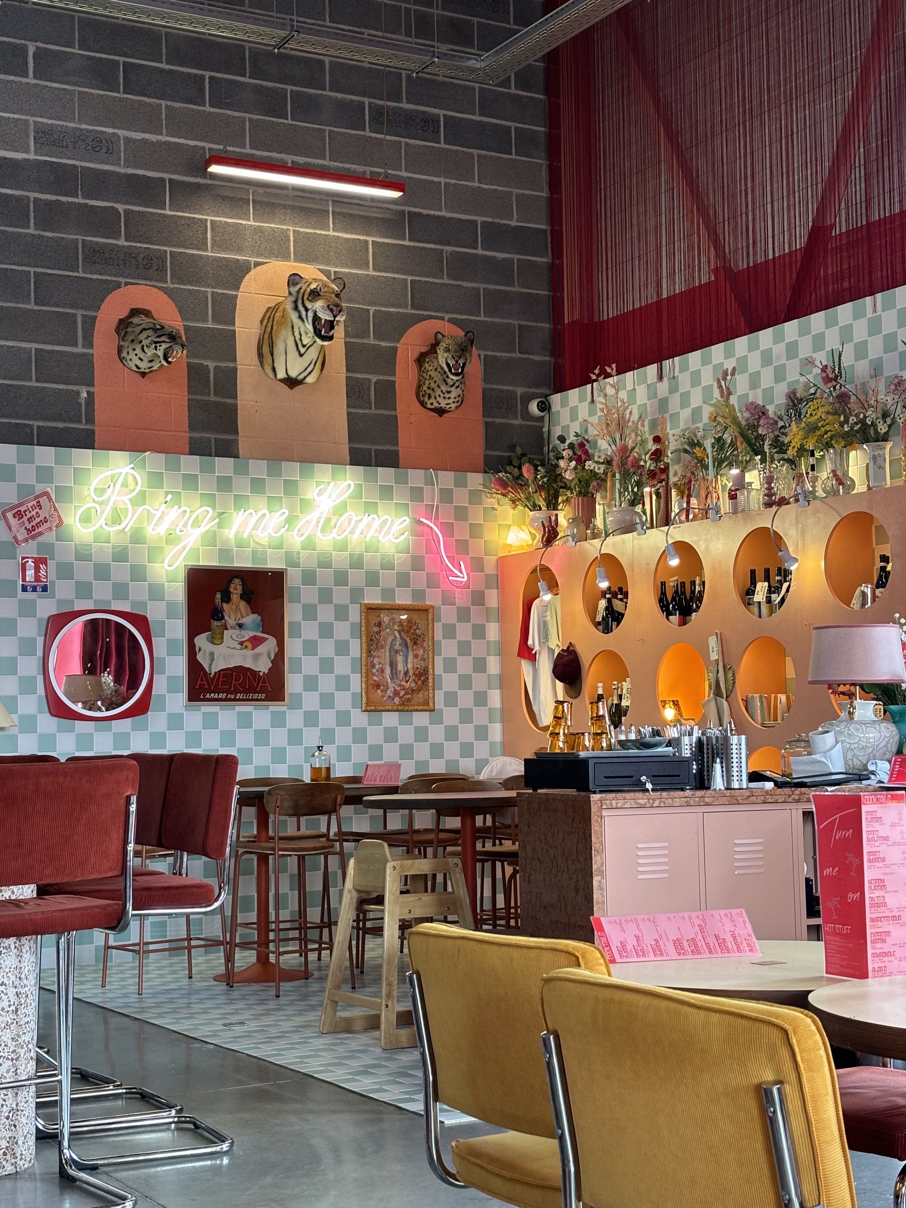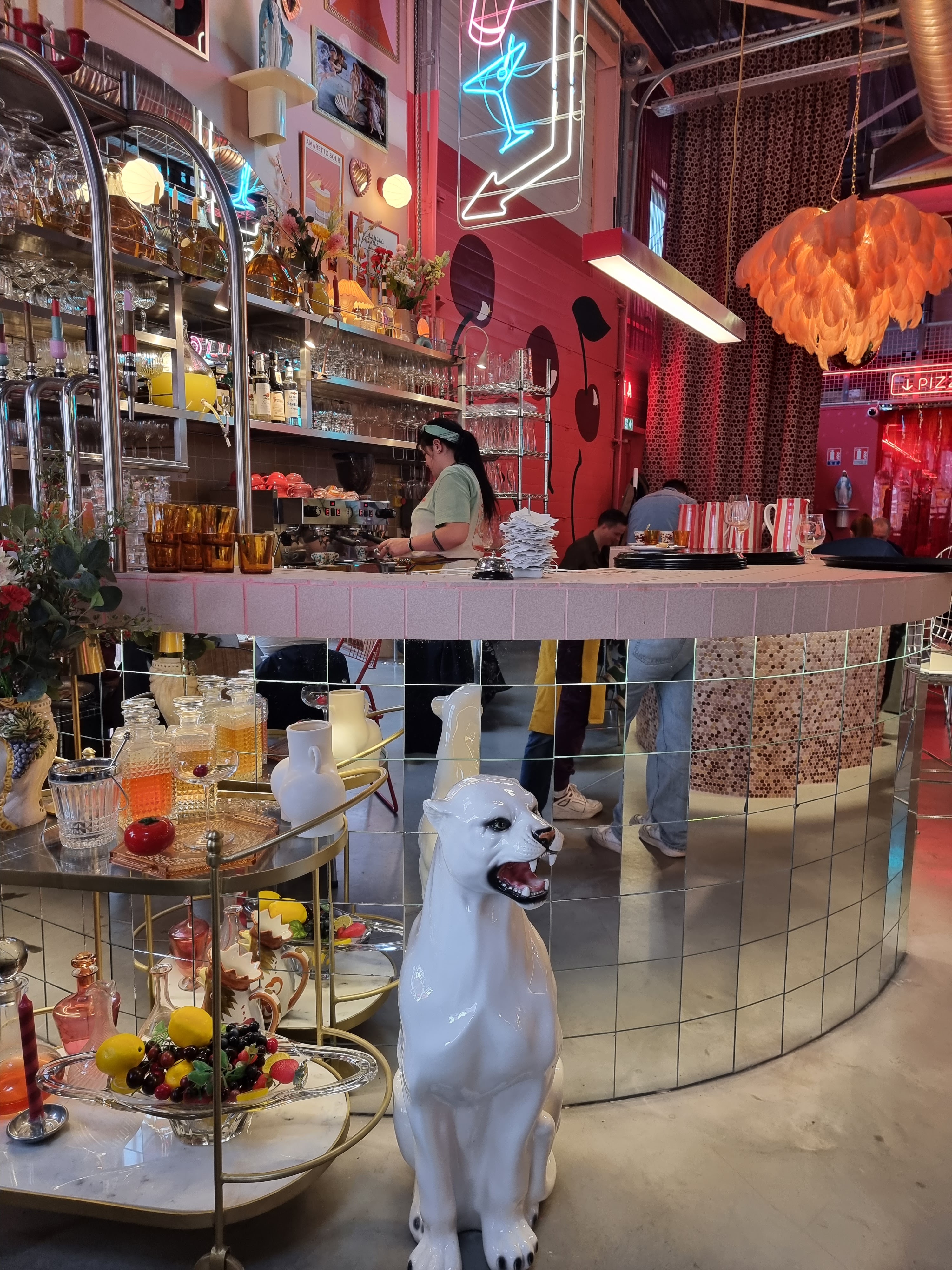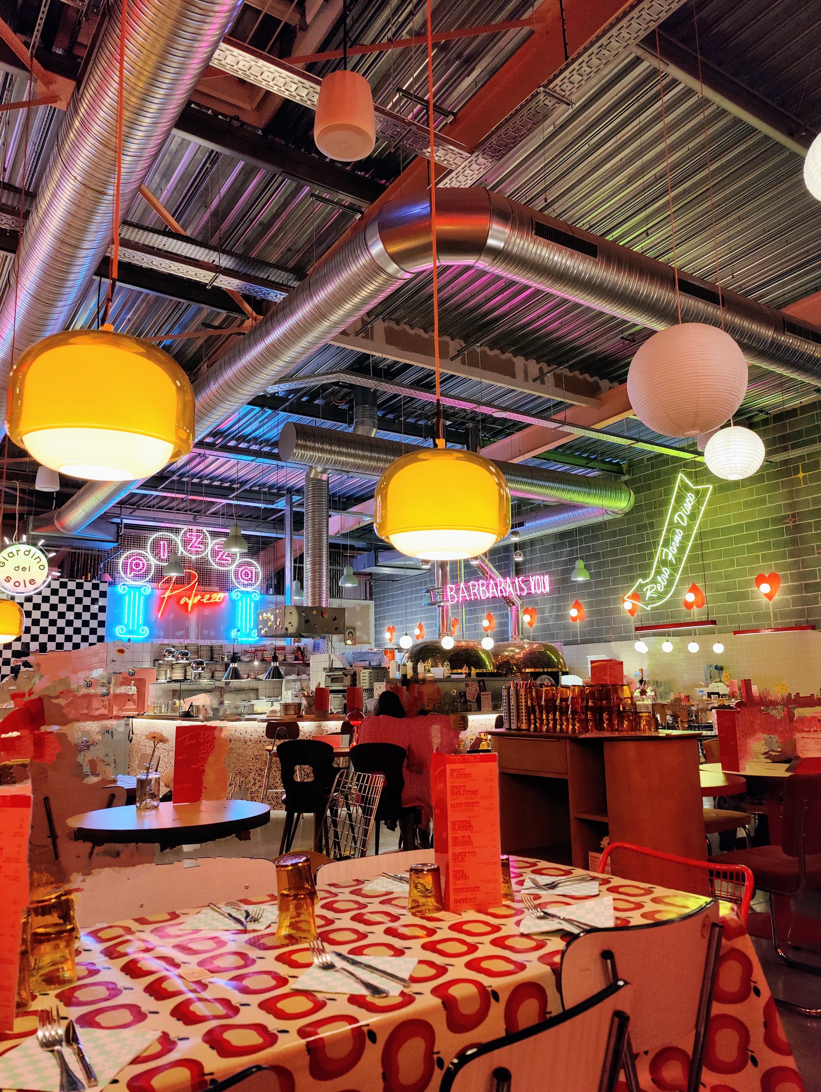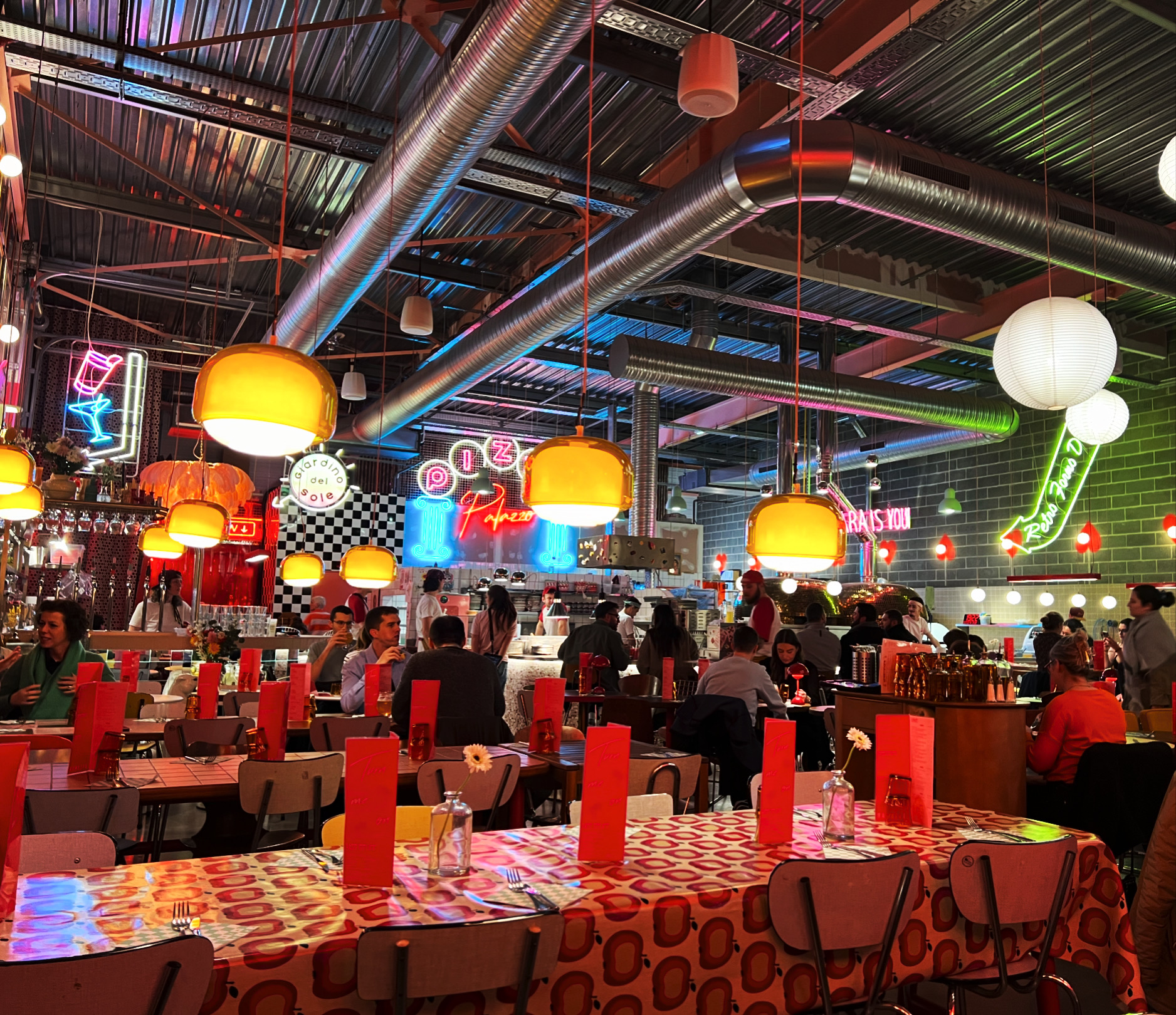 Restaurant avec un décor hyper unique et assez design. Les touches 60's, 70's... Les néons etc franchement il n'y a rien à redire. Je suis un peu déçu de la qualité de la cuisine. Les pizzas étaient assez liquides et n'ont pas spécialement beaucoup de goût. C'est comme si on mangeait des pizzas à l'eau. Aussi la carte avec du texte en rouge est assez difficile à lire (la combinaison de la couleur et de la quantité de texte). A noter que le personnel est vraiment top et super accueillant.