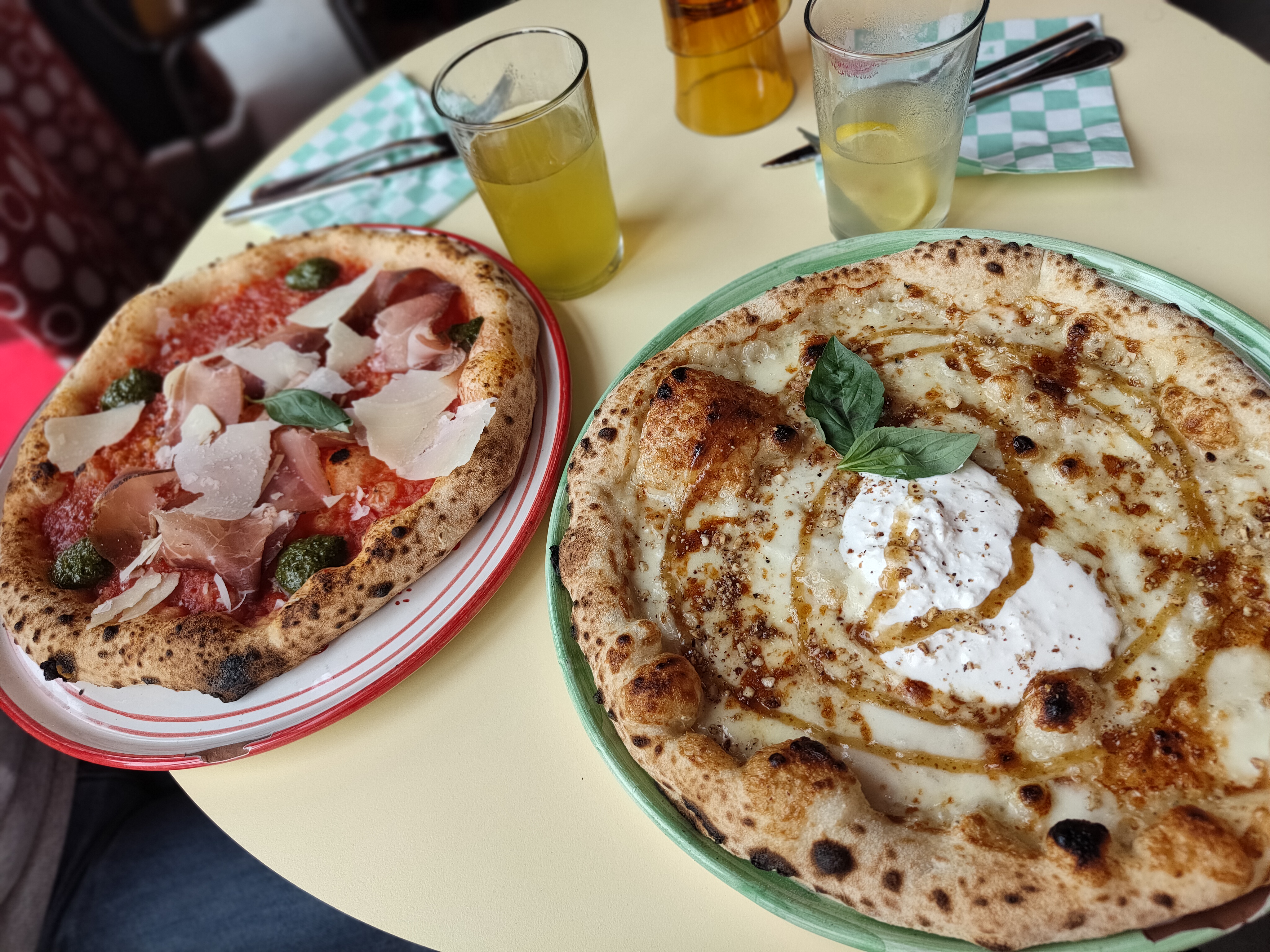 Décoration des années 60 au top! Ambiance festive! Personnel très agréable et aux petits soins malgré les serveurs(es) débordés par le succès du lieu, qu'il a fallu relancer à plusieurs reprises pour prendre notre commande de plats et desserts. Pizzas passion truffe supplément burrata et specktaculare supplément burrata très bonnes! Pour conclure: Super déco, ambiance familiale et bonnes pizzas! 😎