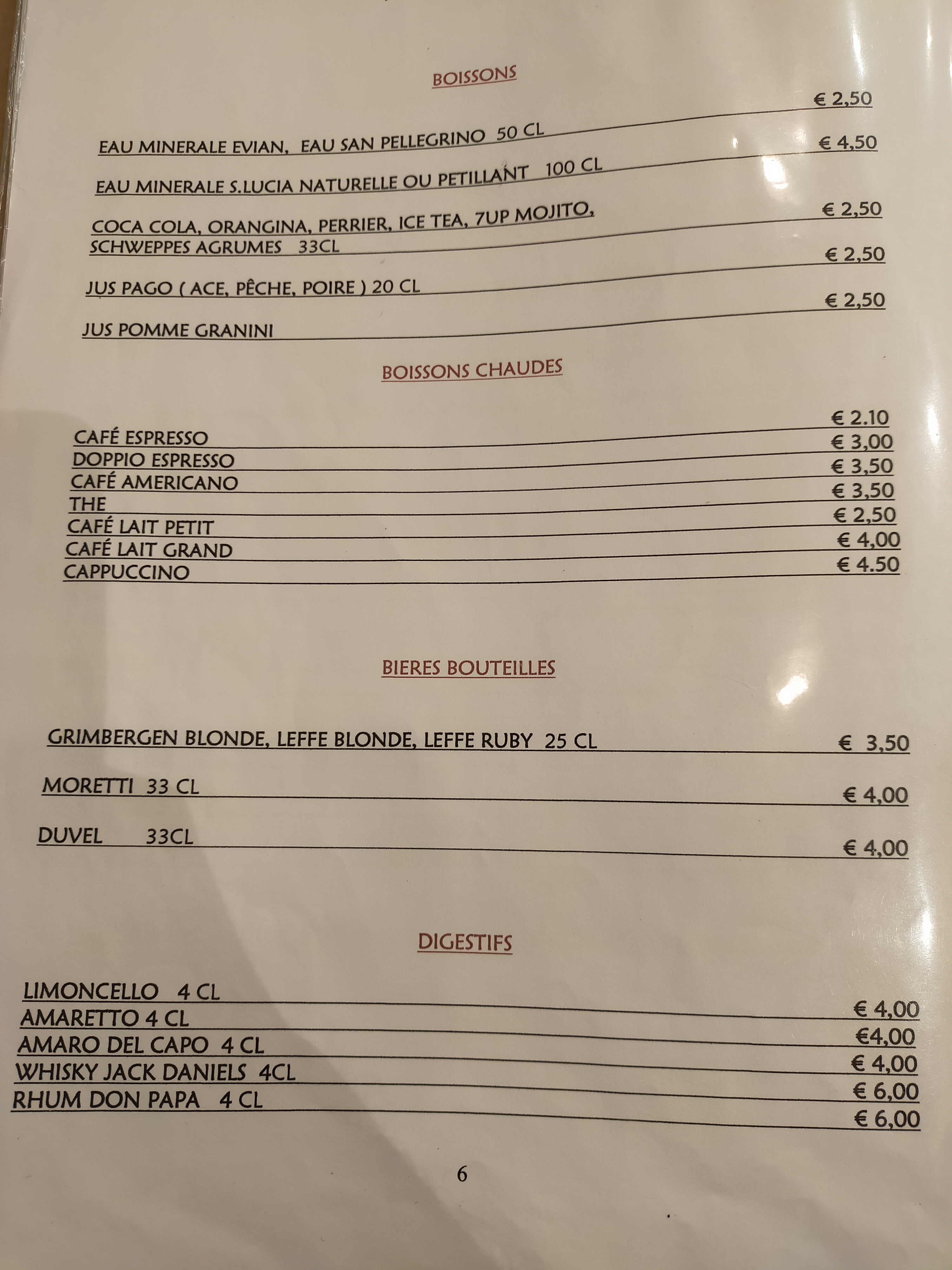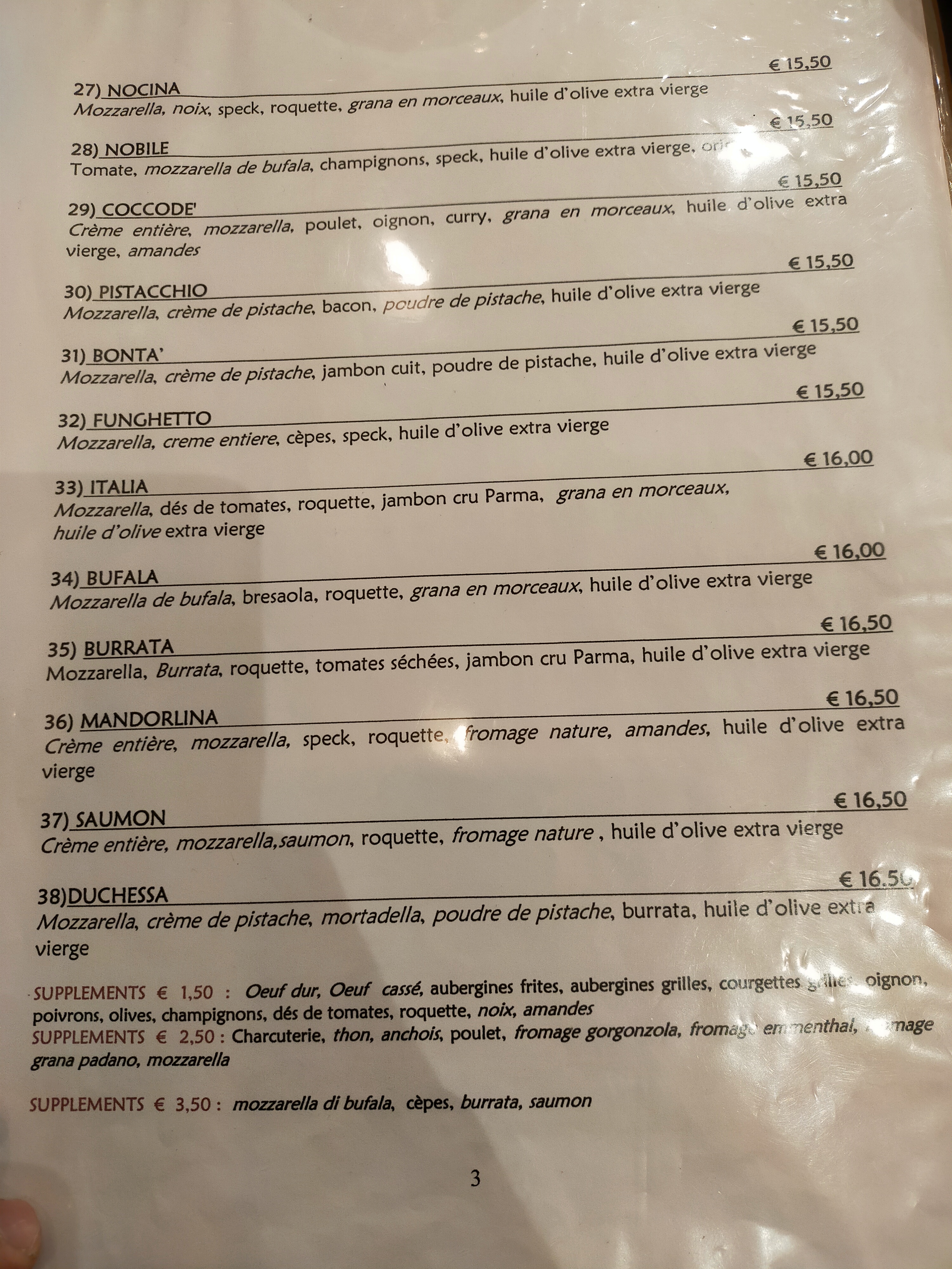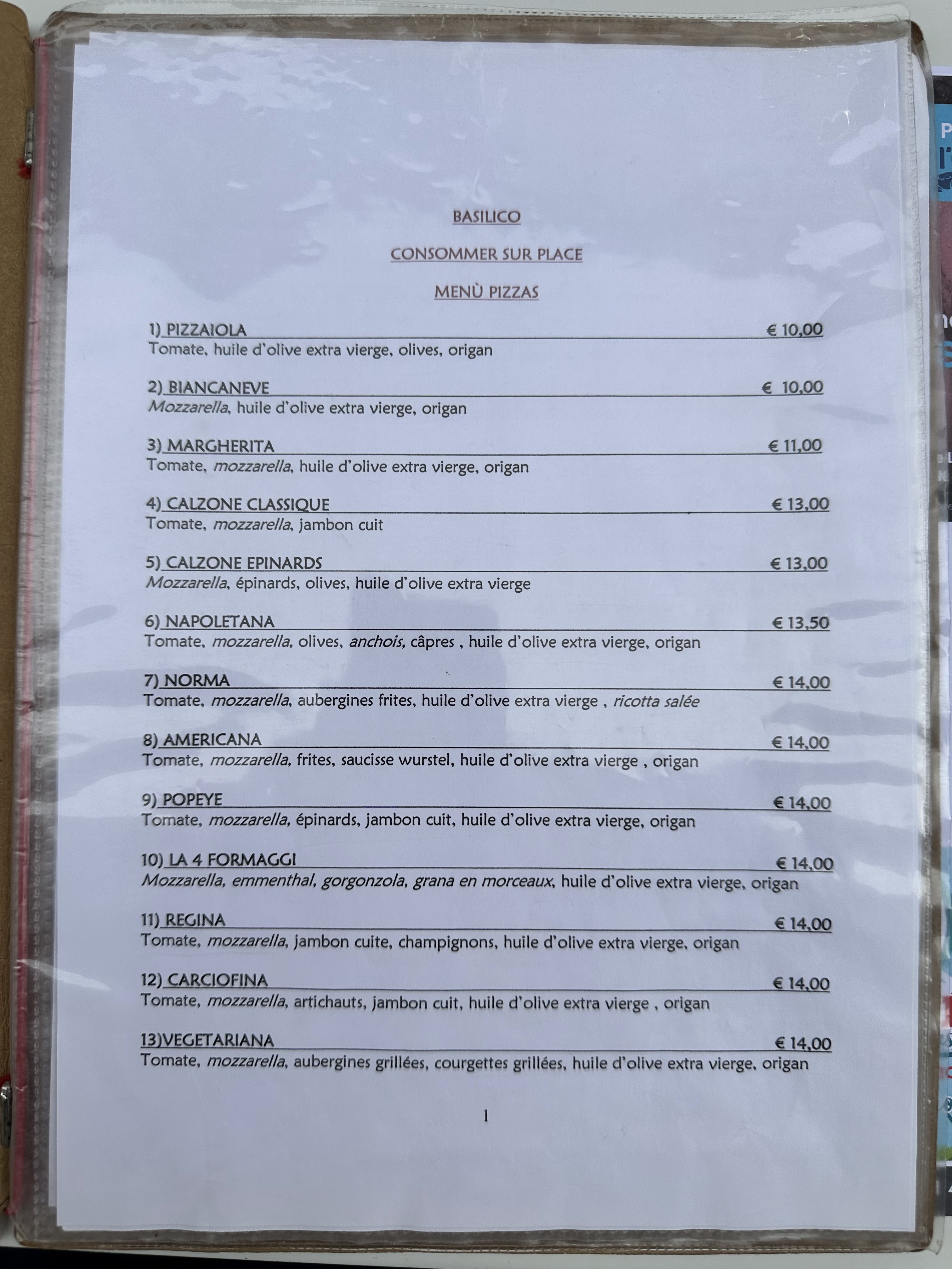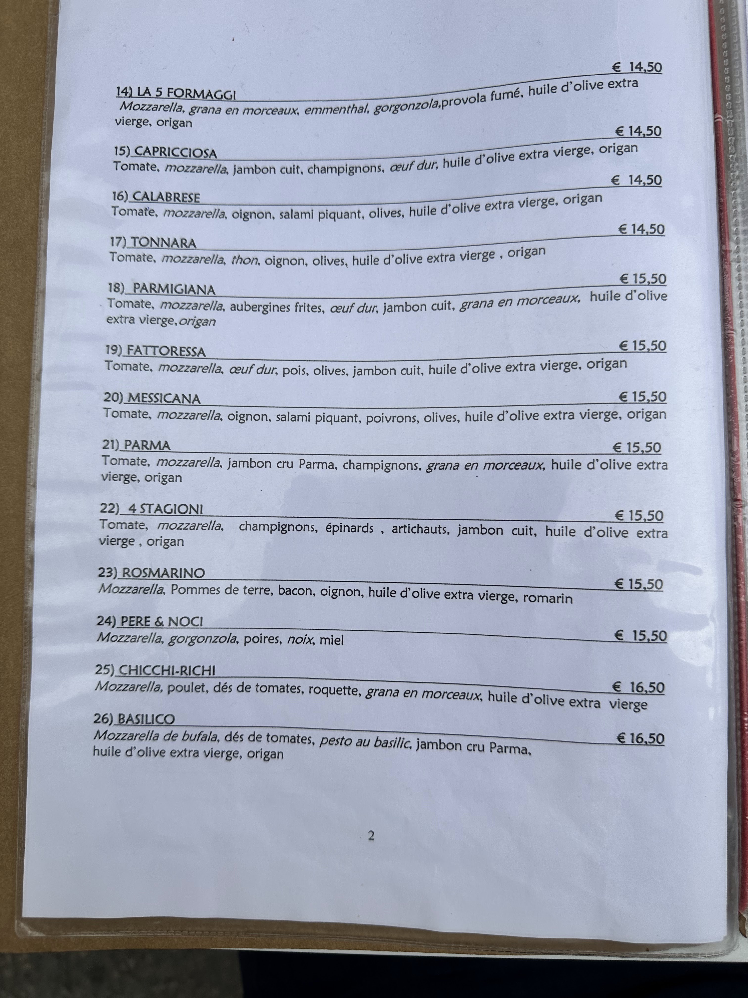 Accueil sympathique mais trés déçue par la pizza, anchois trop salés, pâte trop fine. Pourtant faite par des italiens.....!!