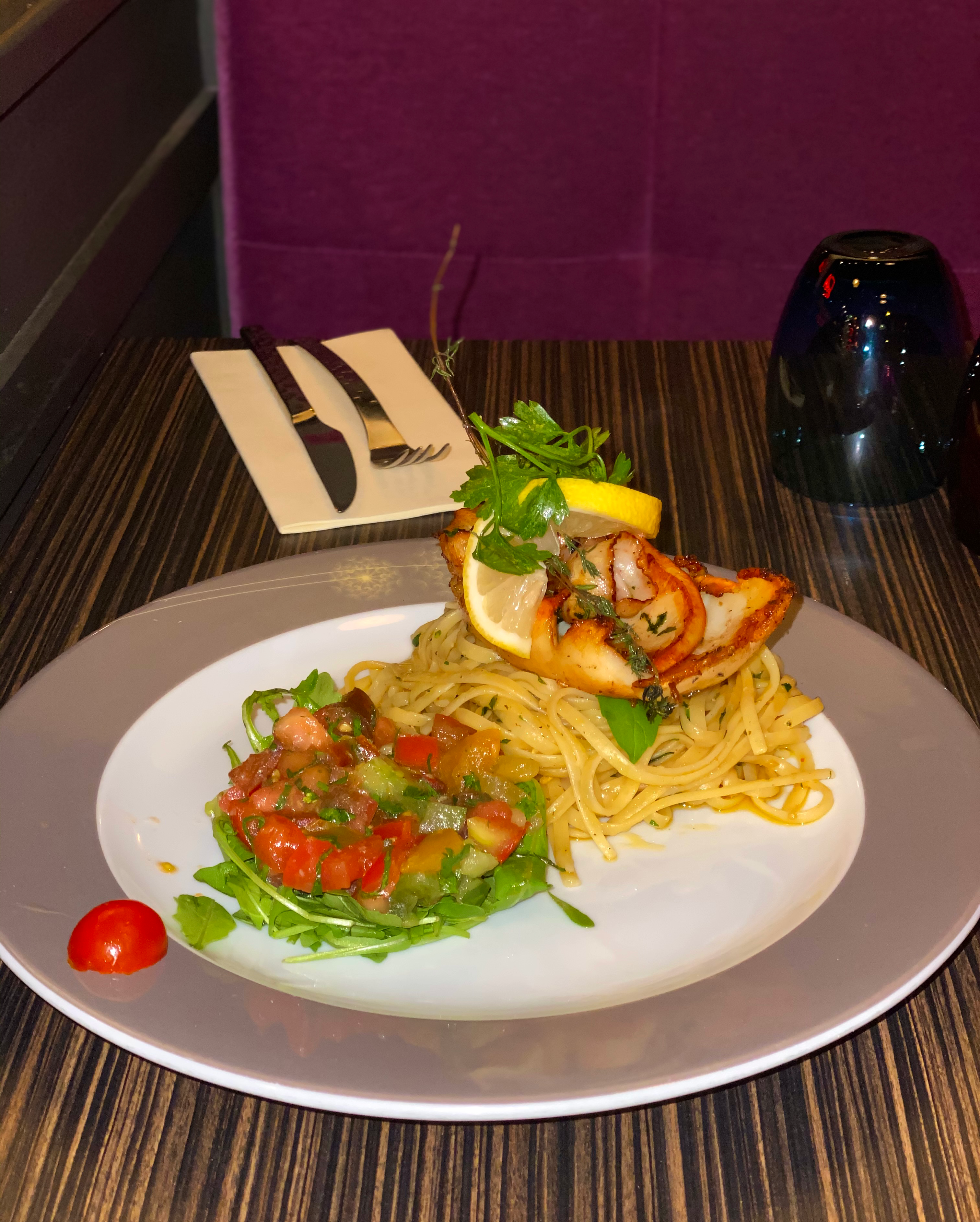 J'y ai pris des linguine à l'encre de seiche. Un délice. Ma compagne linguine primavera, sa mère une margherita, son père une pizza fruits de mer et tout le monde s'est régalé. Les desserts pas mal mais un peu en dessous des plats. Le service fut parfait: discret, efficace, à l'affût des attentes du client. Pour couronner le tout digestif offert. Bref, un sans faute.