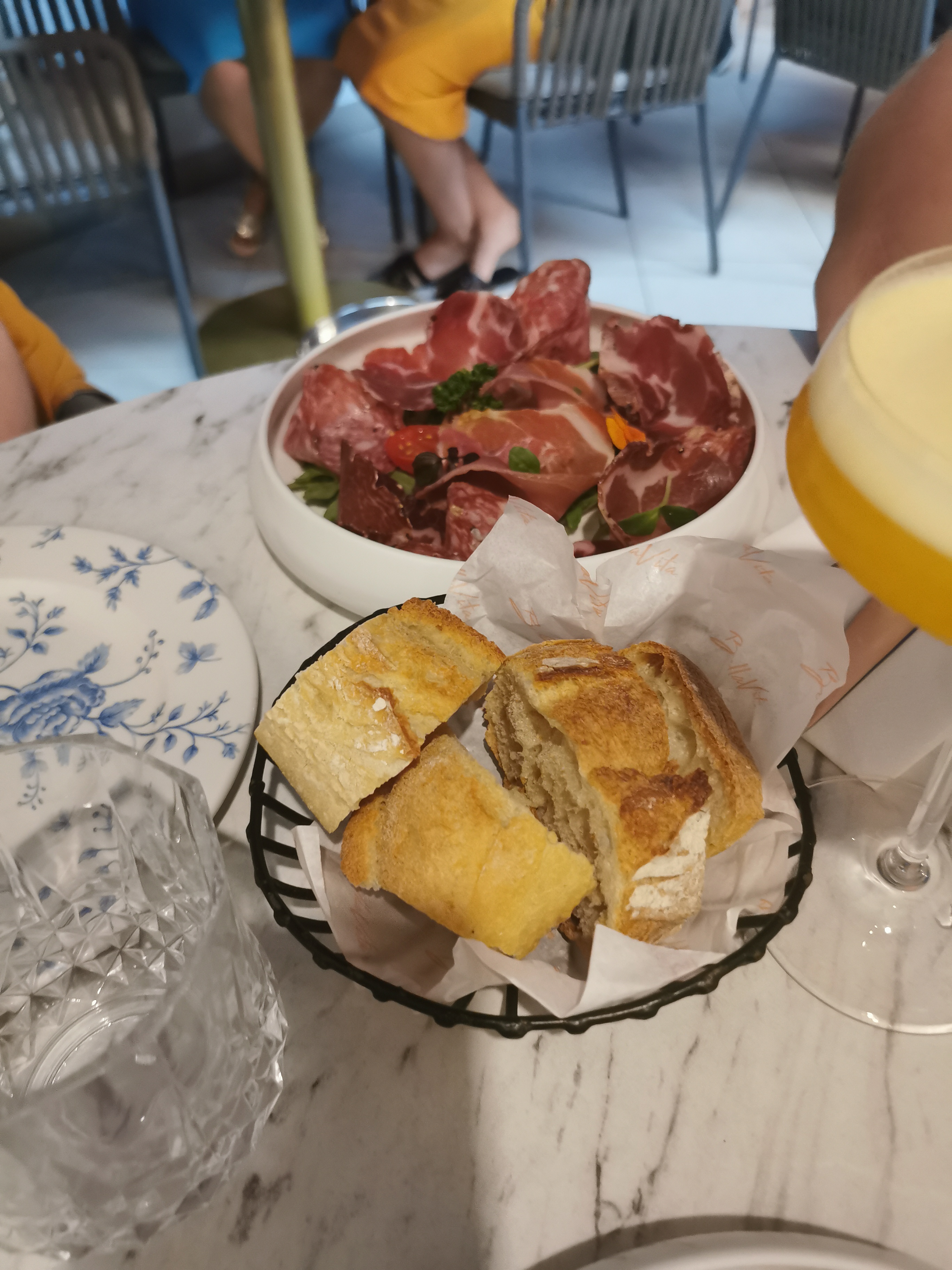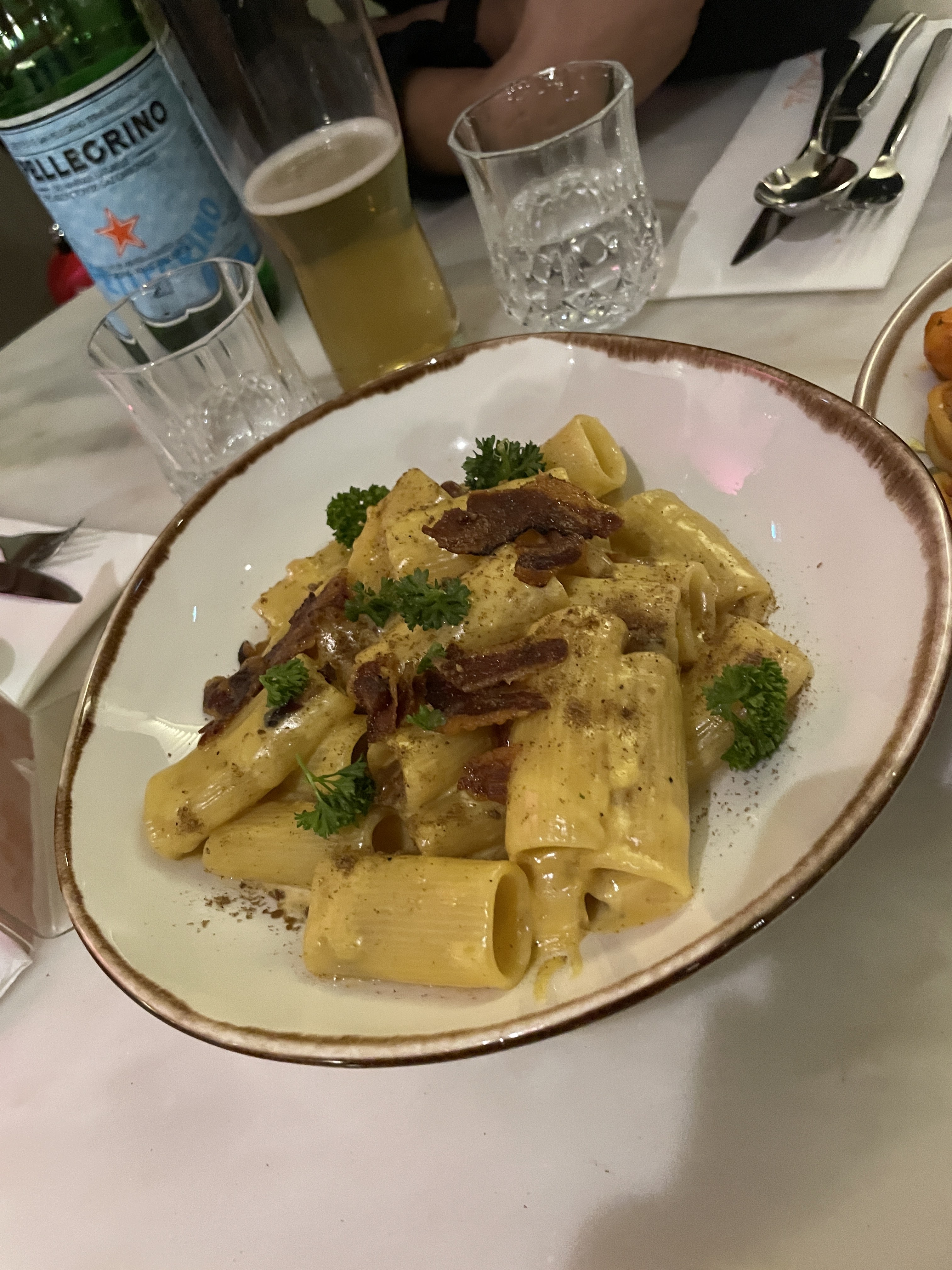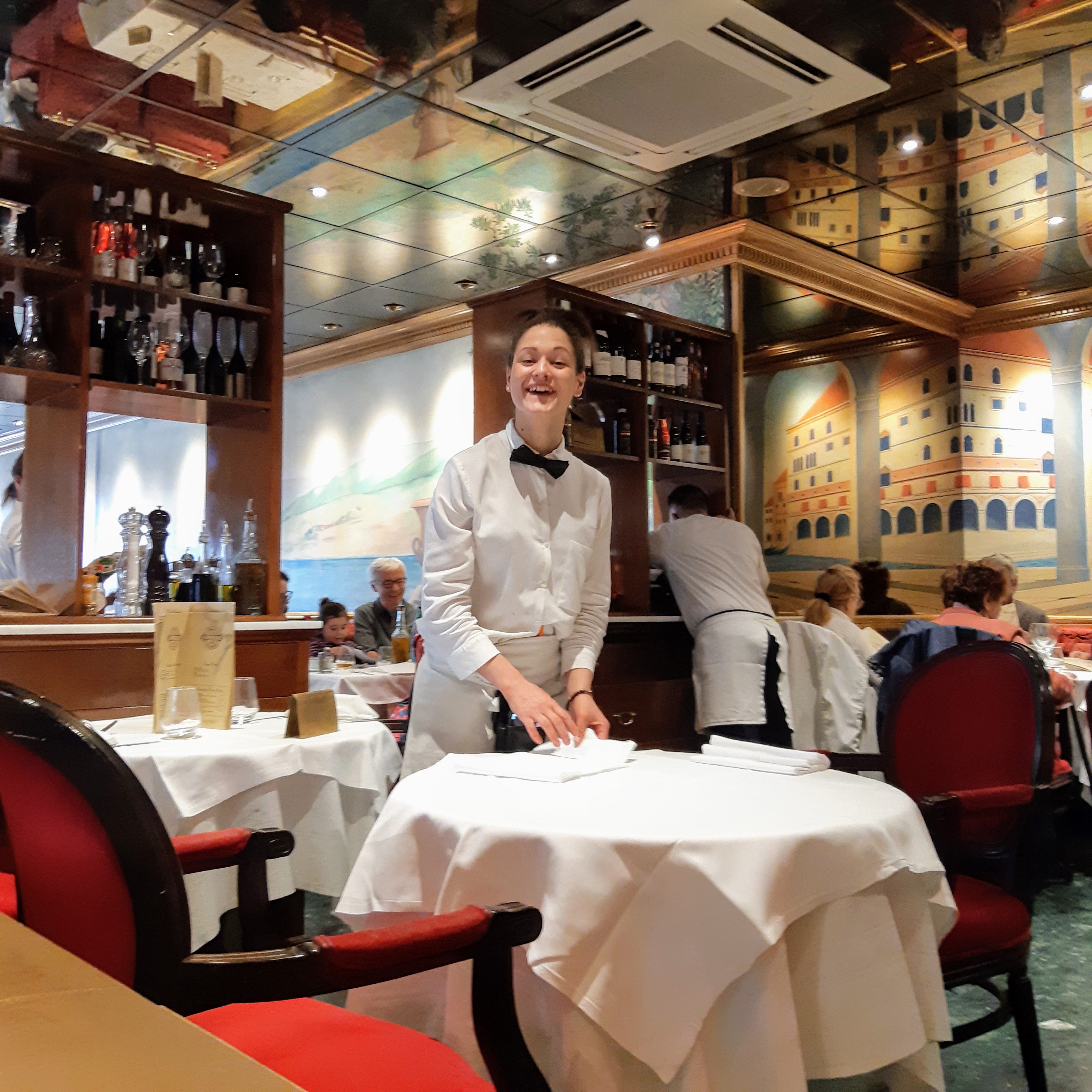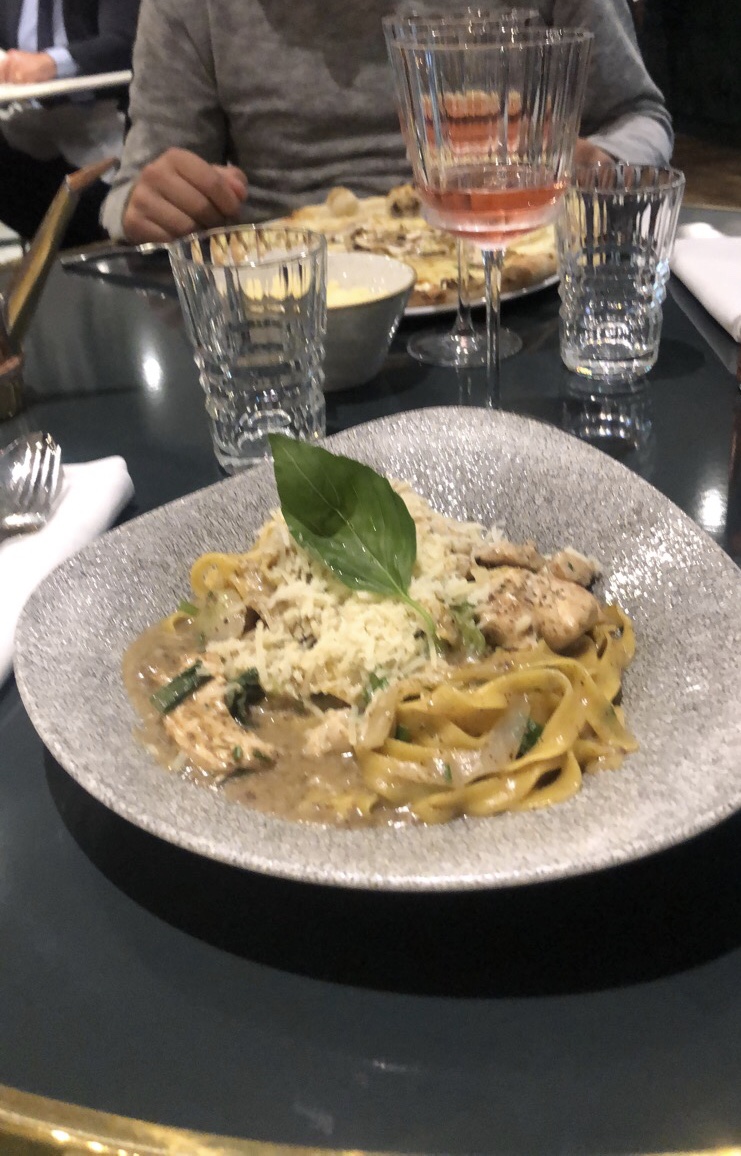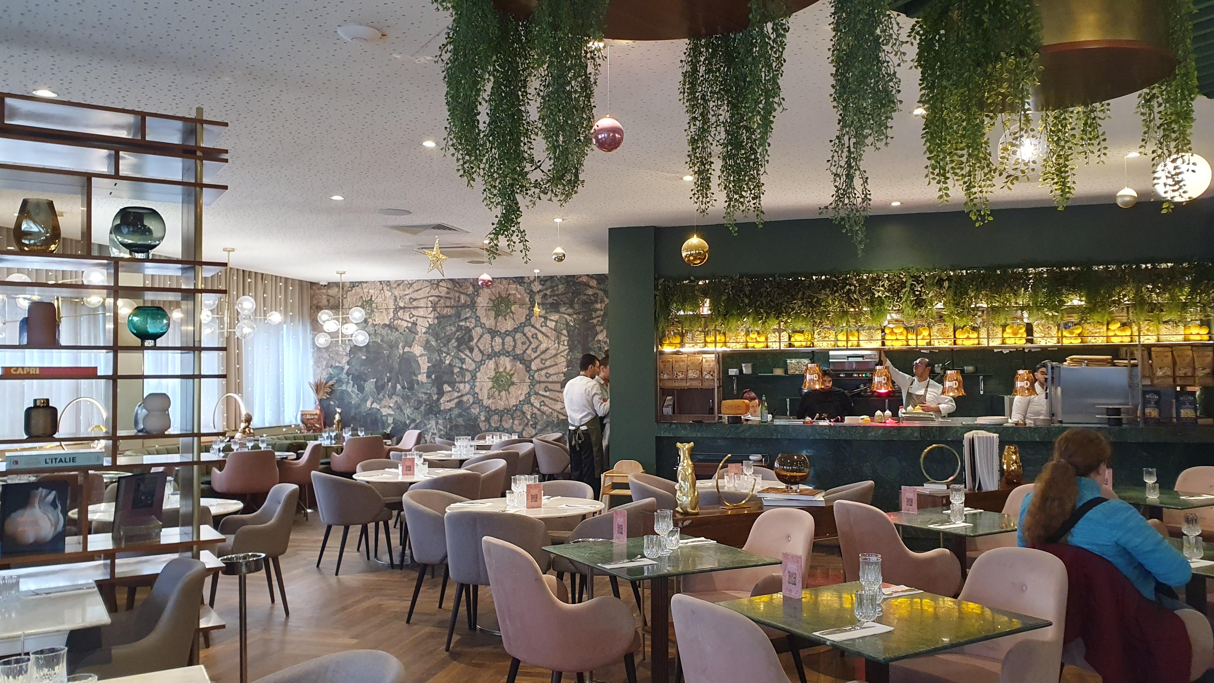 J'y suis allé pour la première fois avec des copines, un samedi midi. Il y a avais du monde sans bruit, le restaurant est calme, chic. Il est très très beau à l'intérieur. J'aime le côté italien du début à la fin, la carte est italienne-francaise, les serveurs parlent francais avec un fort accent italien, on se sent vraiment voyagé. La cuisine est excellente, le rosé italien est aussi très bon.