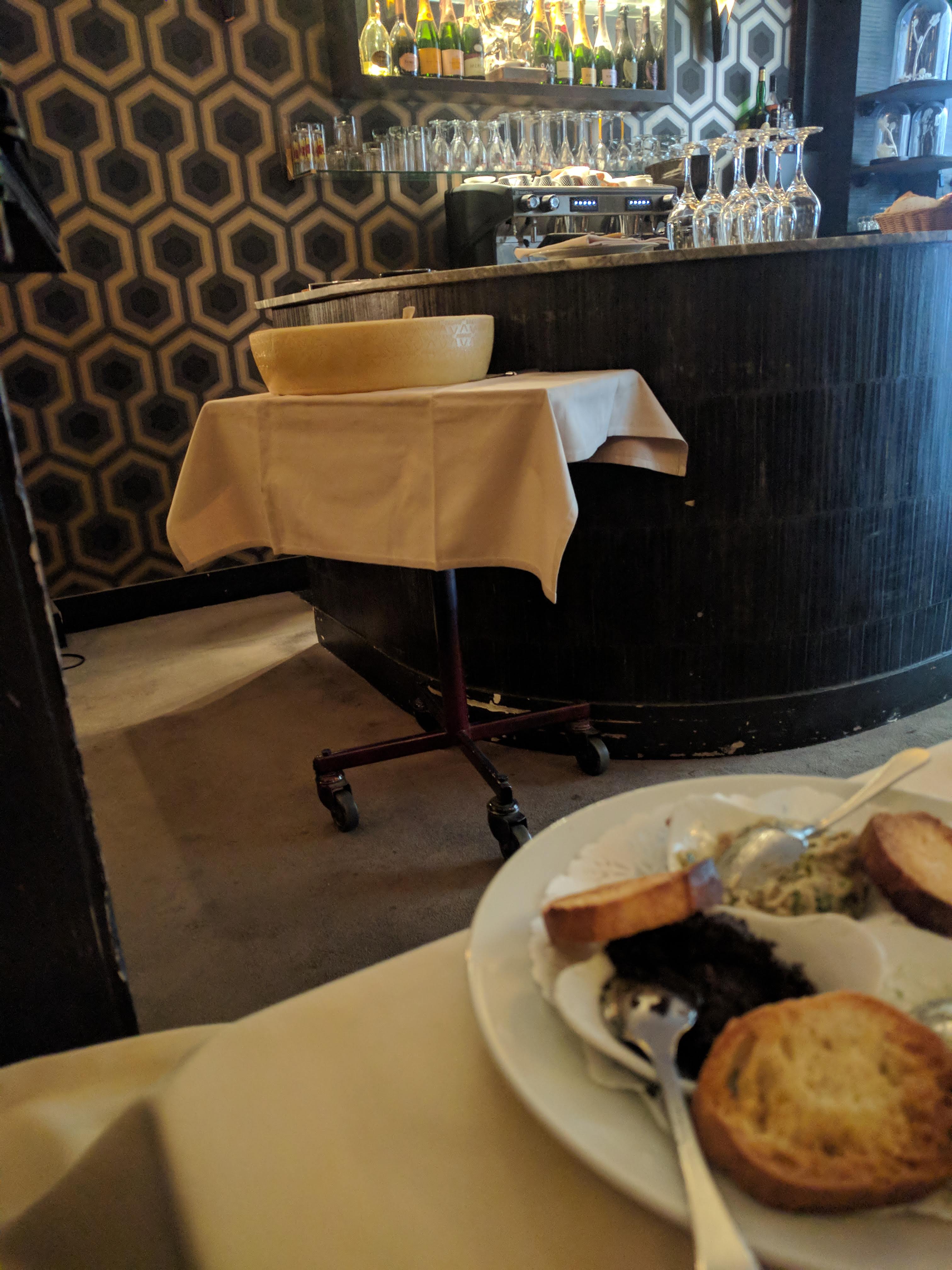 essayez le plat de pâtes préparé à l'intérieur d'une énorme meule de fromage. excellent italien dans ce quartier. vous souhaiterez que votre estomac puisse en contenir plus.