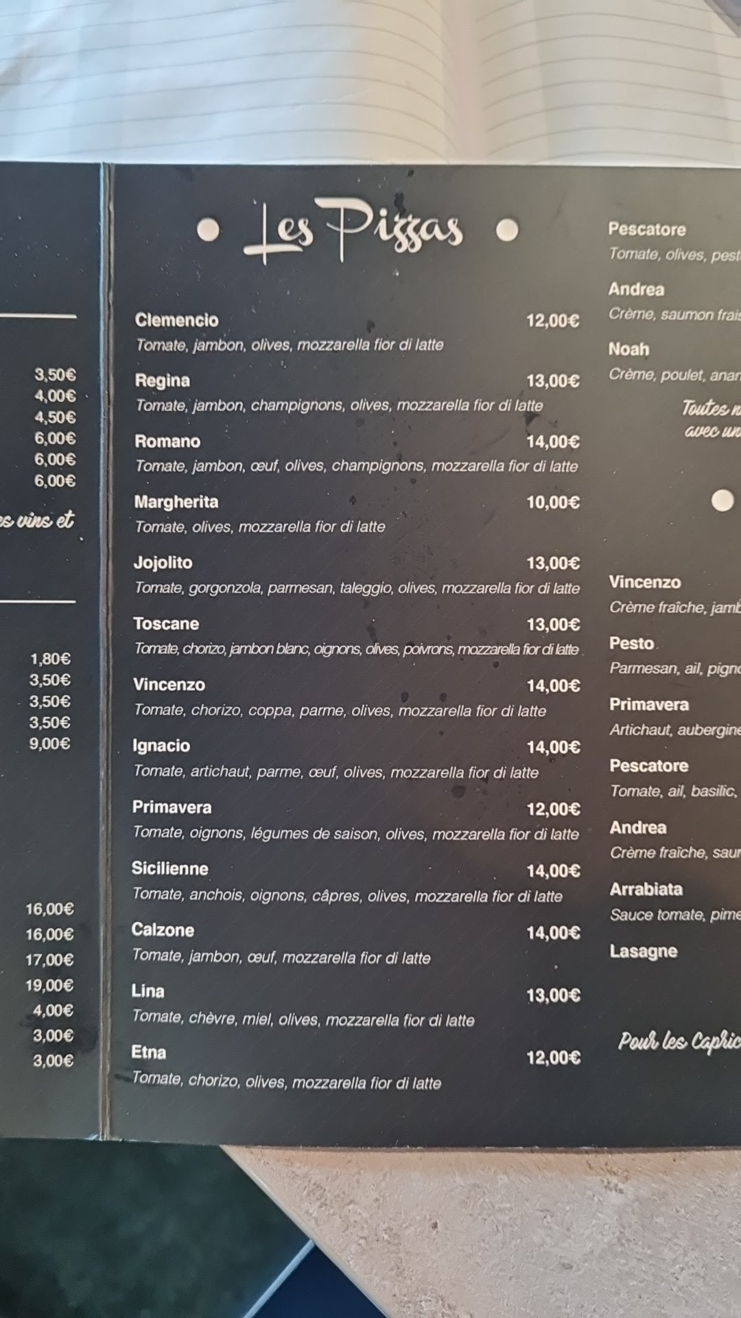 Les pizzas sont très bonnes ainsi que les pâtes. Les prix dans la moyenne. Seul bémol de taille l attente !! Arrivés à midi reparti à 14h 20 pour un apero une pizza et un dessert. Ce point doit être fortement amélioré.