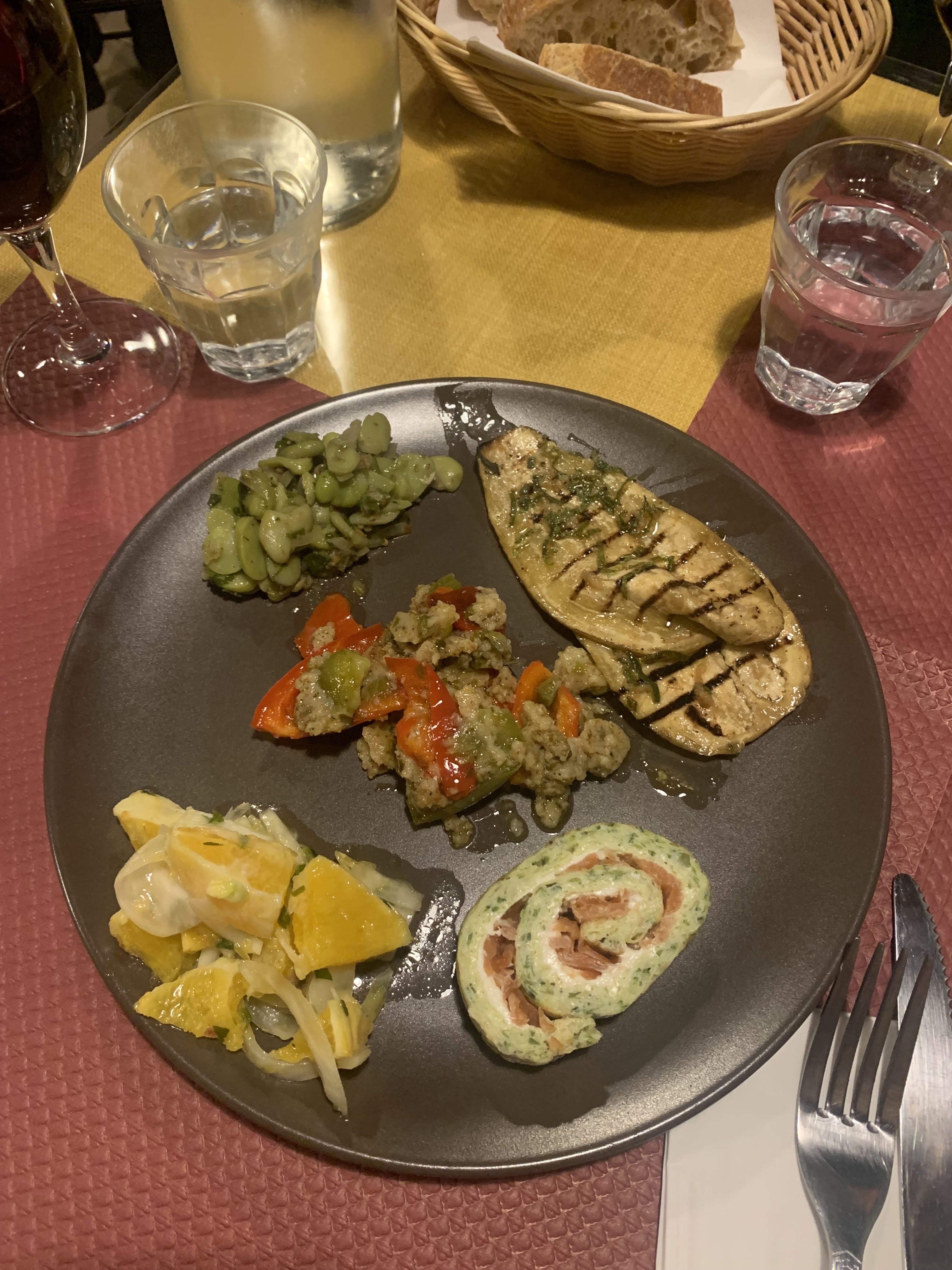 Cuisine typique sicilienne fait maison. J'ai pris des antipasti et des spaghetti au espandon et aubergines. A refaire