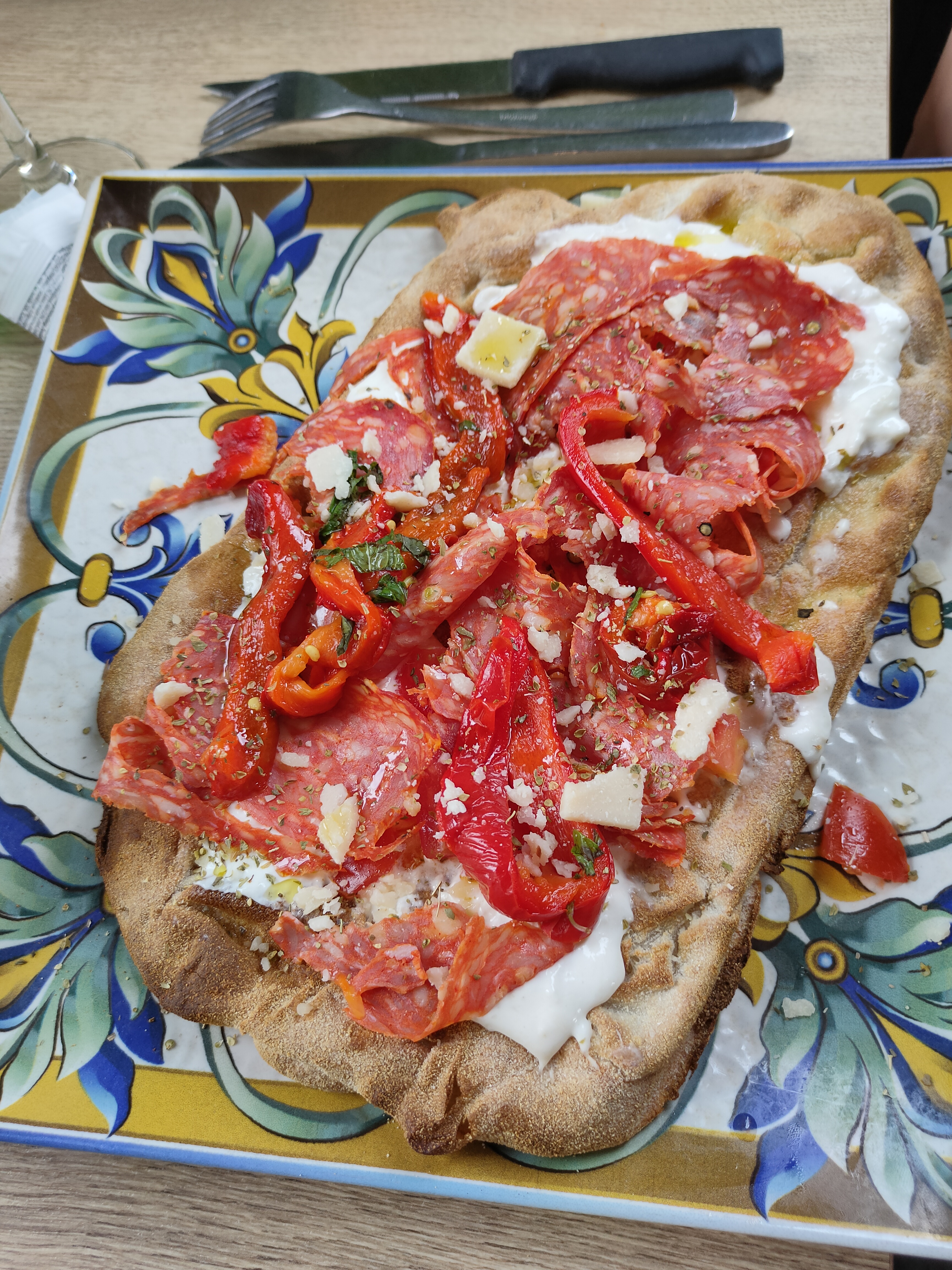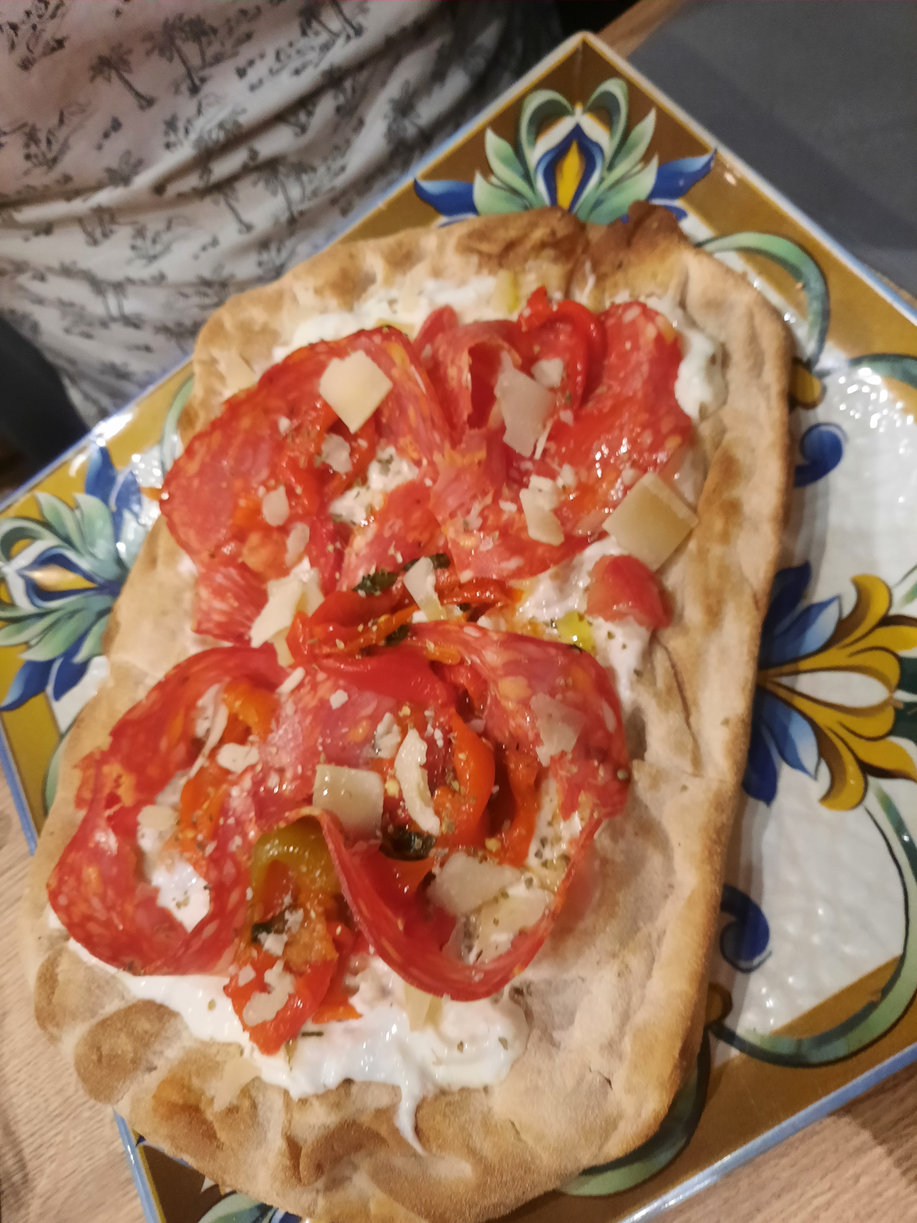 Pas de pizza ici mais des PINSA. Nom très proche pour une recette proche de la pizza mais bien avec une différence marquée. De tradition romaine il n'y a pas de tomate mais une bonne burrata étalée sur une pâte savoureuse, craquante à l'extérieur et moelleuse à coeur. Les ingrédients sont de qqualité : poivrons marinées fondants, charcuterie fine. C'est délicieux. Et l'accueil est vraiment simple, chaleureux et donc top.