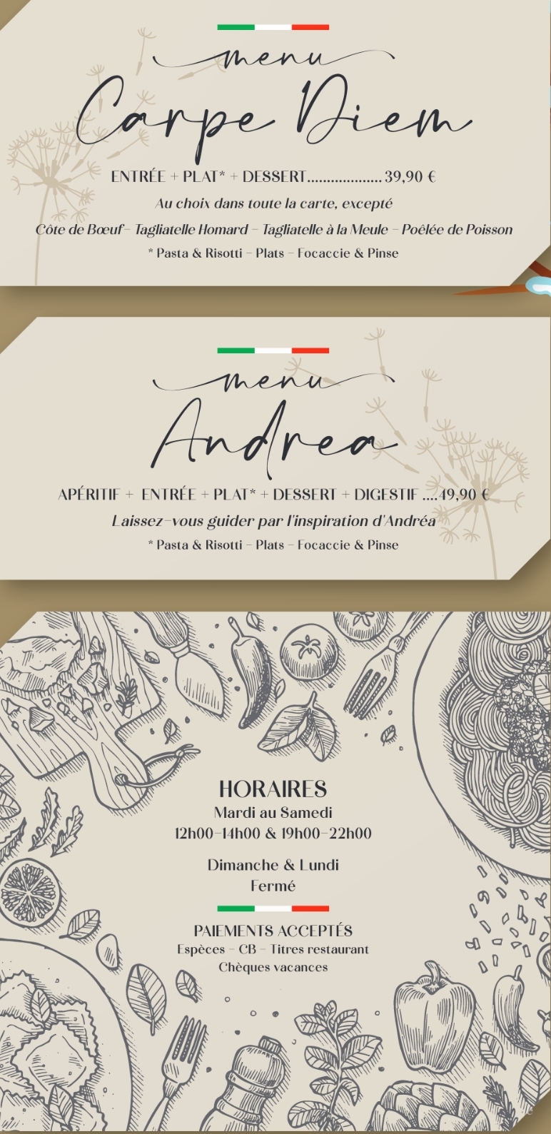 Excellent restaurant italien, produits frais et copieux. Travaillant tout près du cœur de ville, le rapport qualité prix pour la formule déjeuner est très appréciable : c’est un plaisir d’y déjeuner très régulièrement et le patron Andréa est très sympathique et très commerçant. Merci Al Carpediem ‘