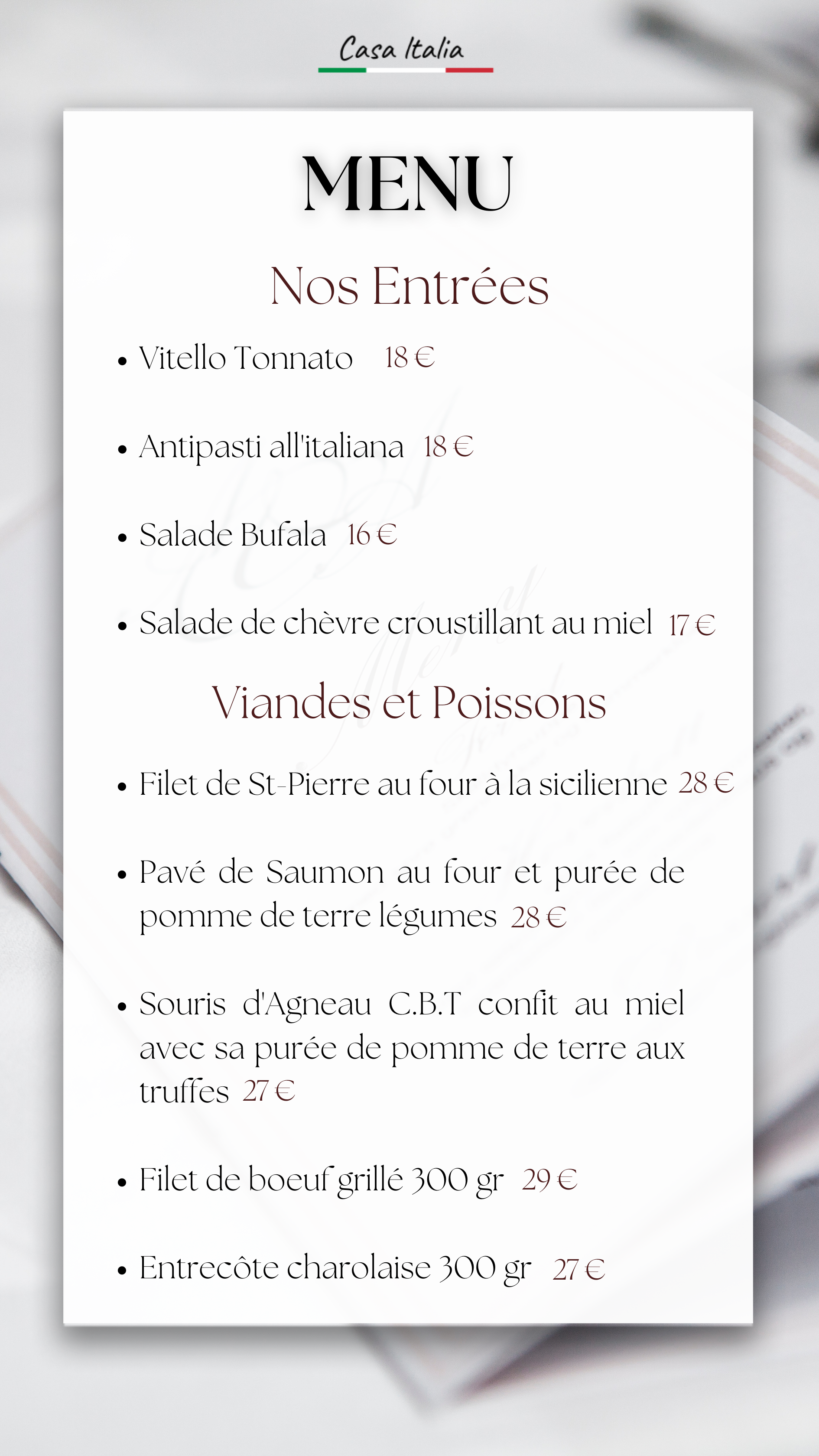 Excellent moment à Casa Italia, les plats sont délicieux, frais et de qualité bravo au Chef ! Sans parlé du service ... un pur bonheur grâce à ludo et son équipe. Nous reviendrons avec grand plaisir