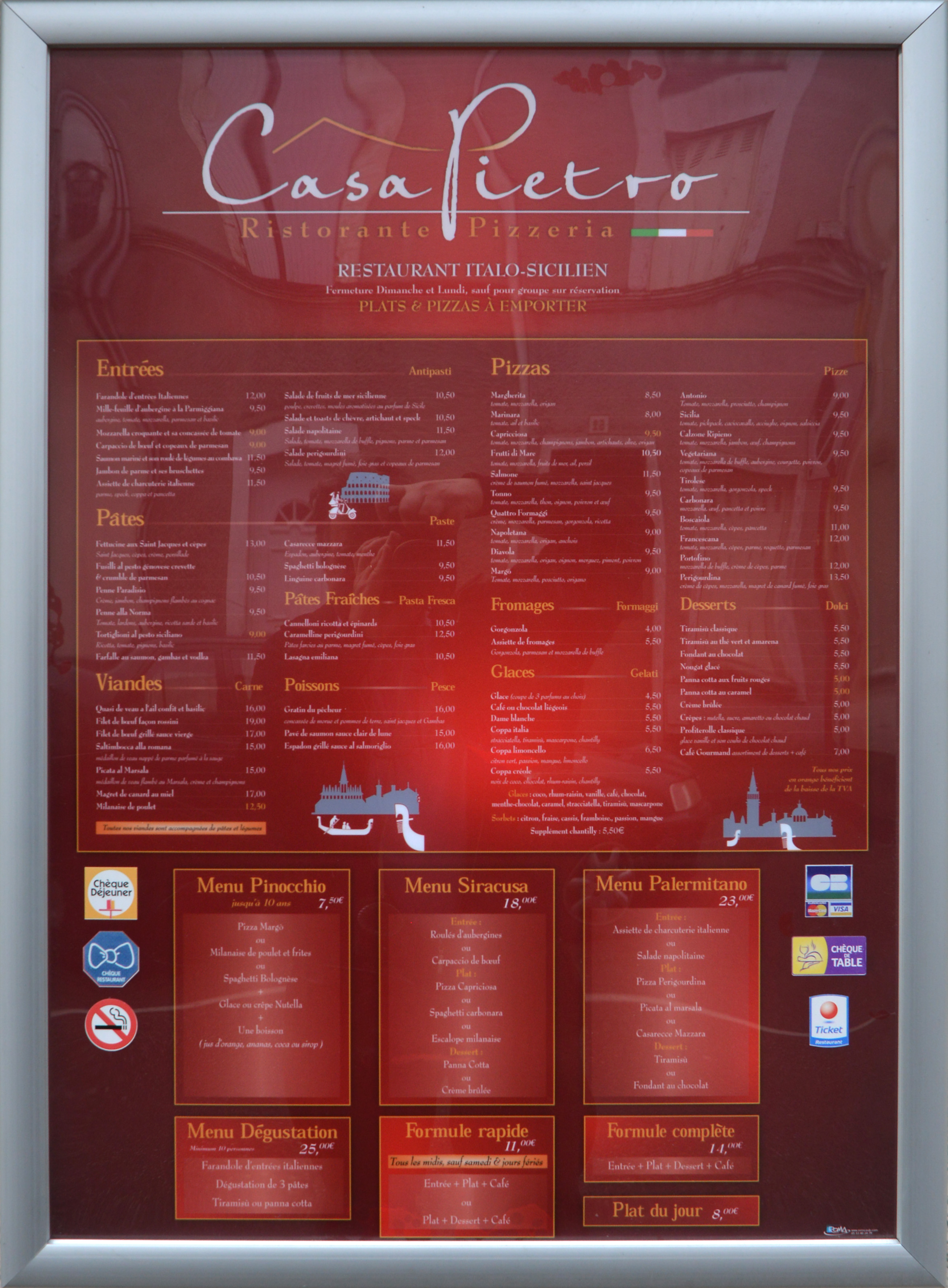 Nous étions décu par le repas á la carte, la viande était dure, pas cuite, l accompagnement légumes,médiocre,une bouchée posée sur le coté.peut étre il vaut mieux manger lá des pizzas.enfin c est une pizzeria et rien d autre, le serveur était net, on a débarassé nos plats encore remplis,sans nous demander pourquoi.c´´etait mon anniverssaire.et je n ai jamais aussi mal mangé., si j ose dire manger, sinon éssayé de manger.Nous sommse sortis et nous avons fait un sandwich dans notre chambre d hote.