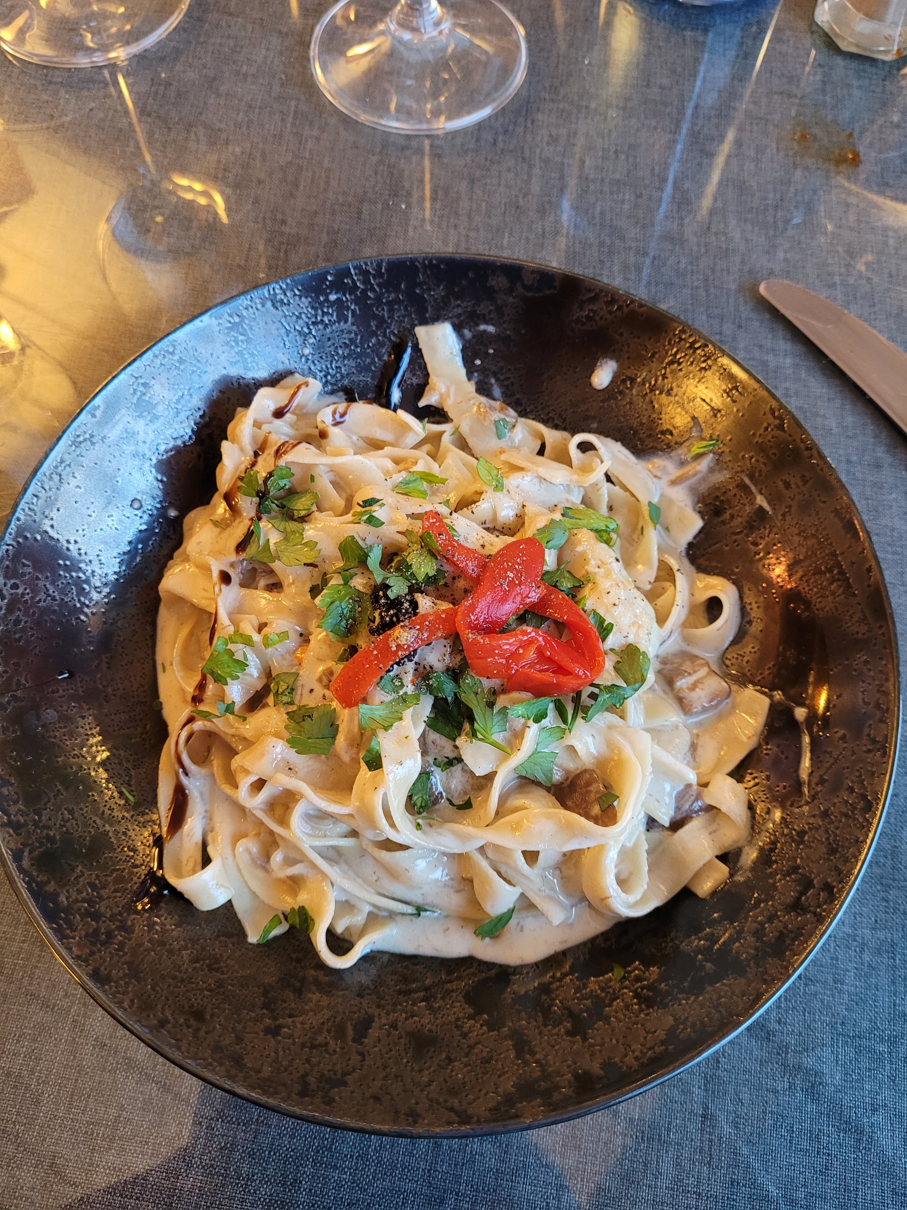 Le repas excellent mais table beaucoup trop petite pour 4 personnes.... les serveuses sont gentilles mais on voit qu'elles non pas les compétences du métier ( sourire et service) et timides. La patronne ( on a deviné que c était-elle) aurait aimer qu elle ce présente quand elle nous a demandé si tout aller bien. Les pâtes au foie gras un délice.