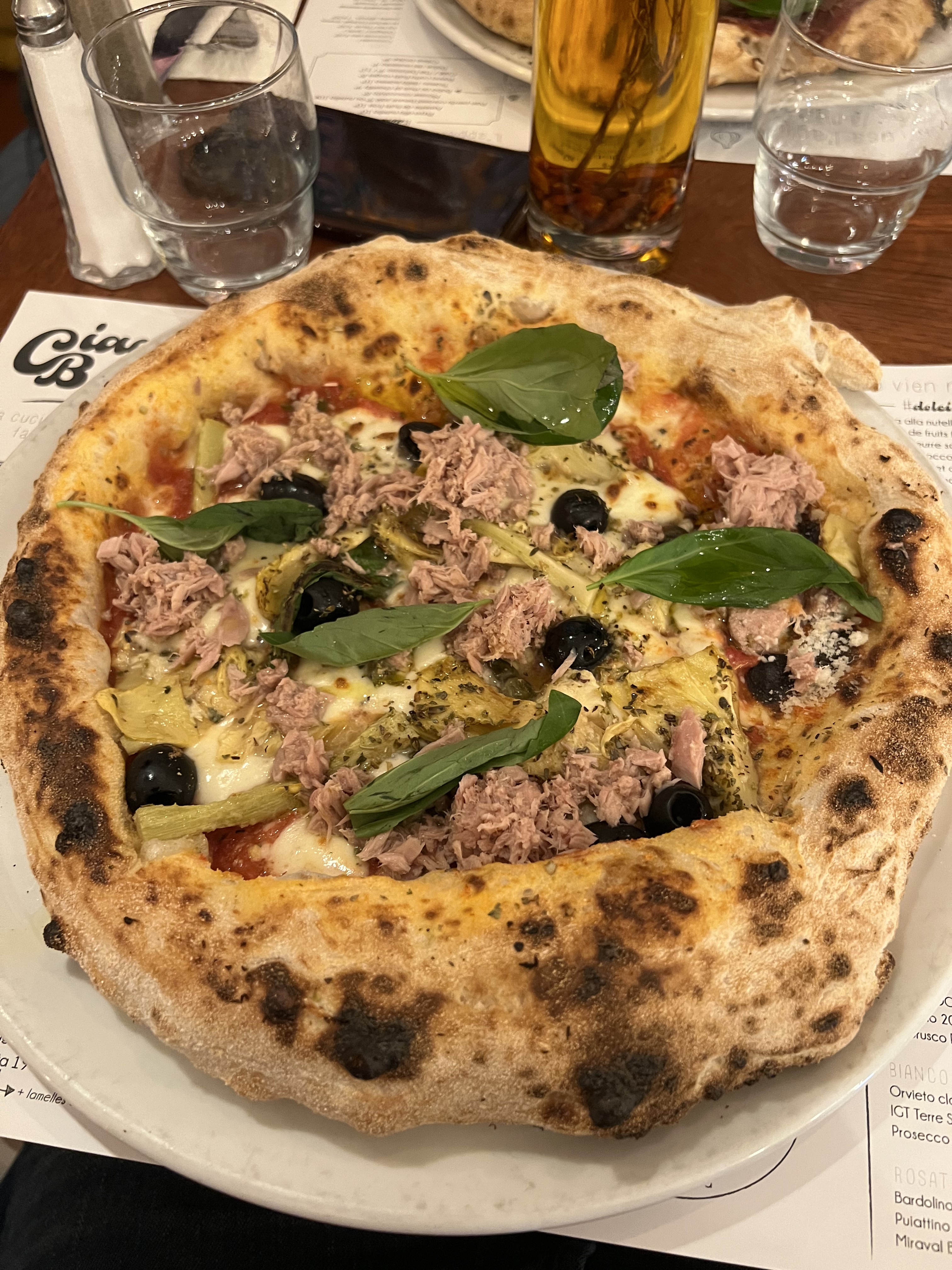 Des pizzas au cadre, tout était superbe ! Je vous conseille l’excellent tiramisu en dessert 🤤 Seul bémol : le verre de vin assez cher.