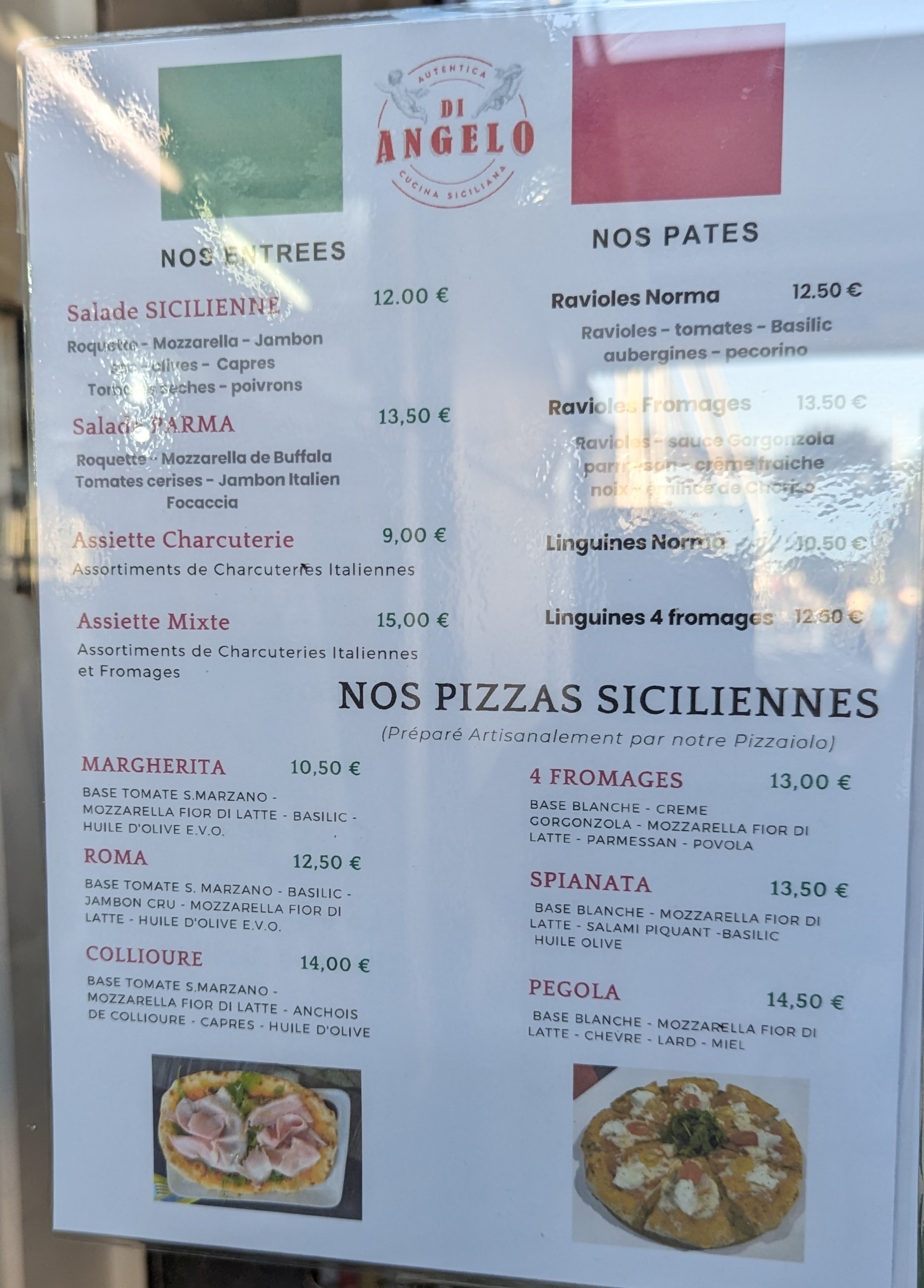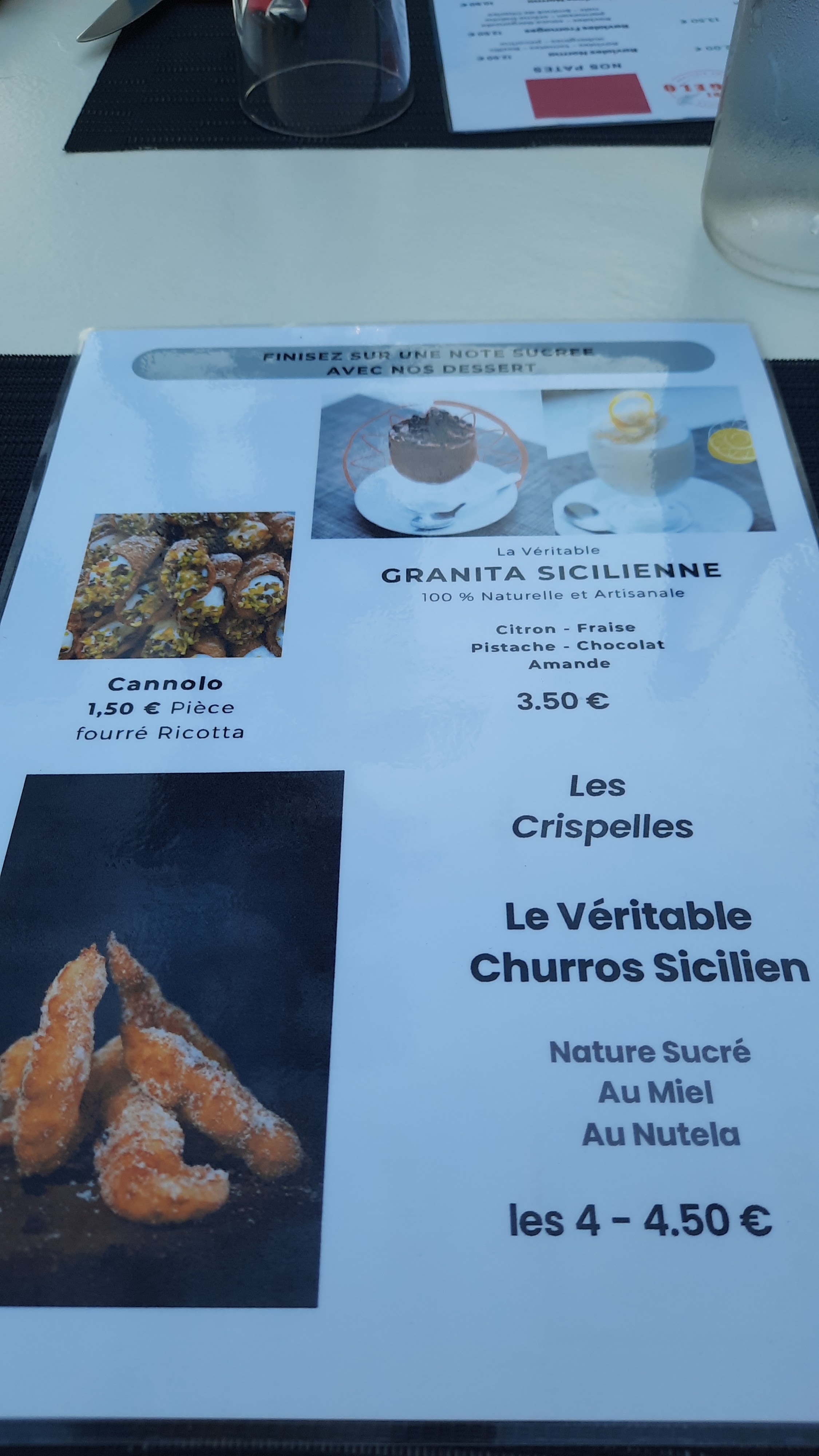 Nouveau restaurant sicilien qui propose une petite carte avec des plats typiques italiens. Les tarifs des pizzas sont ceux du sud de la France. Les produits sont de qualité. Améliorations à prévoir : avoir une carte des boissons ou une ardoise mobile.