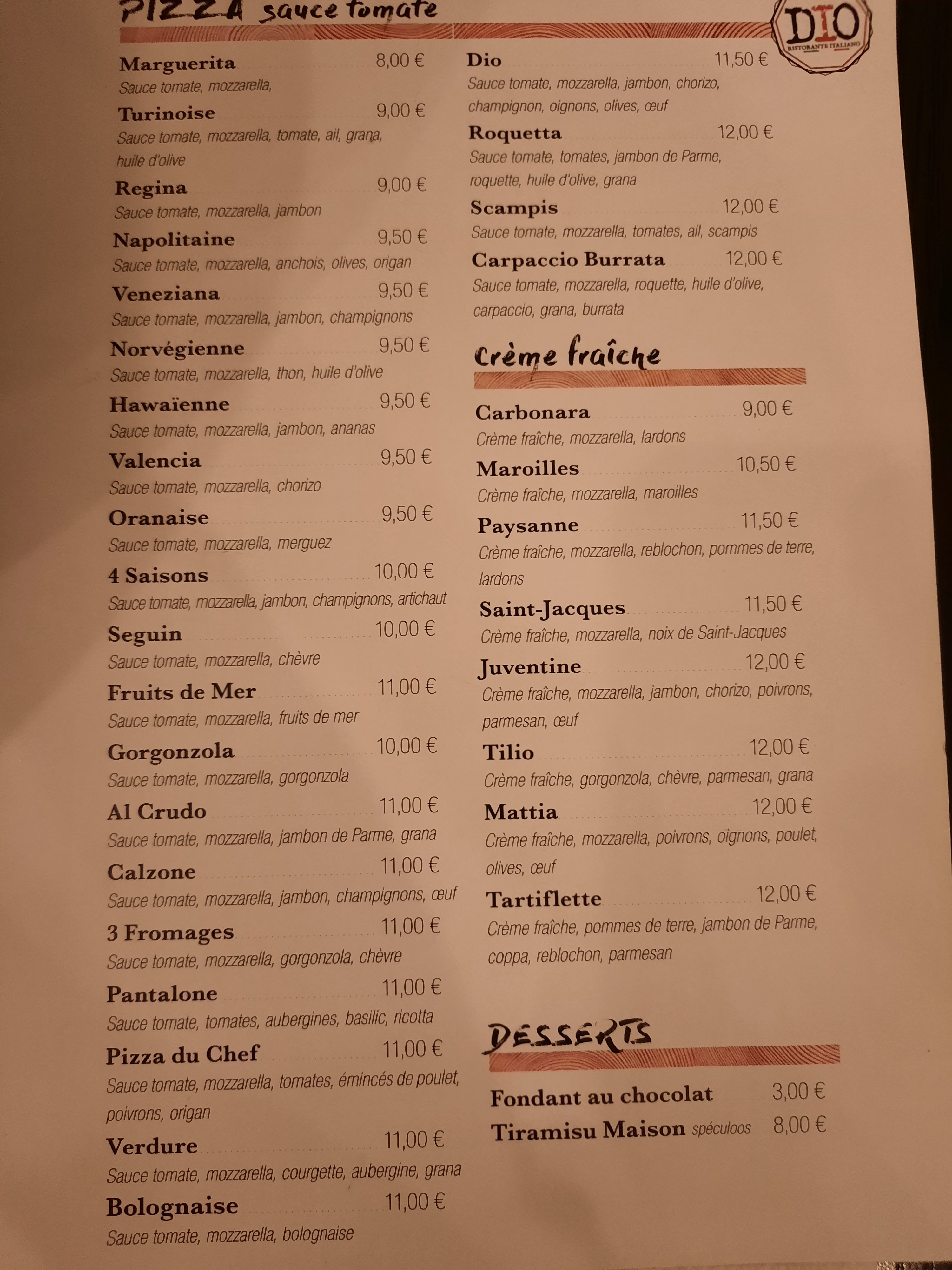 Vous voulez manger Italien et vous régaler ? Arrêtez de réfléchir et foncé chez Dio Ristorante vous ne serez pas deçu j'y suis aller une première fois par simple curiosité l'année dernière maintenant j'y vais pratiquement 1 à 2 fois par mois car contrairement au grande chaîne de restaurant ici on se régale pour UN PRIX VRAIMENT RAISONNABLE ! On a l'habitude d'y aller à 2 ! Pour 1 apéritif 1 pizza et un dessert on en sort pour moins de 50€ en etant 2. À ceux qui ne me croiront pas je vous invite à essayer vous verrez par vous mêmes.