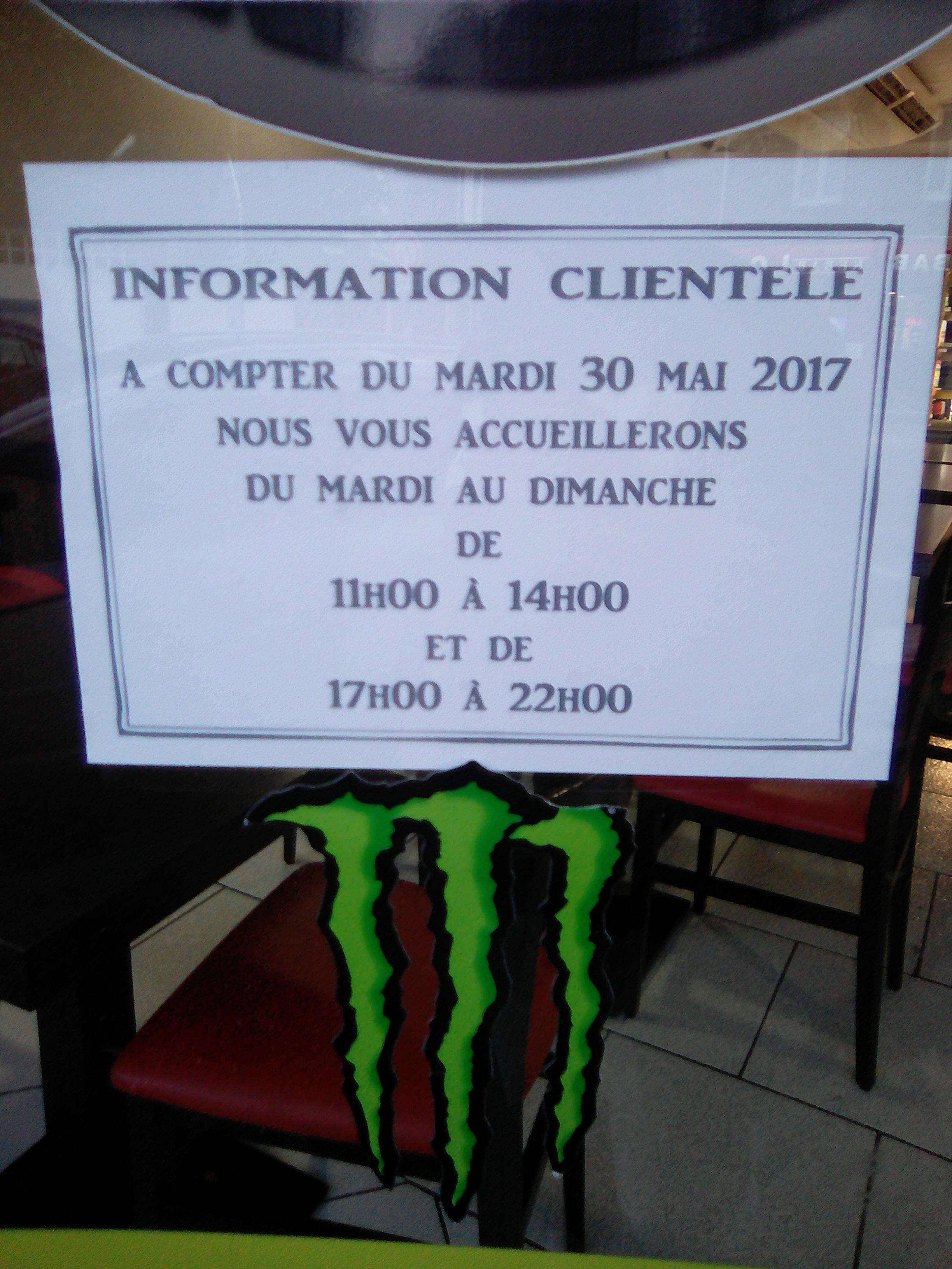j'ai trouver l’accueil très sympathique, pour mon compte j'ai goûter leur hamburger celui ci étais très bon avec un vrai steak haché frais ce qui est très rare pour une restauration rapide les frites étais croustillantes et peu grasse surement des sous vide ( frite fraîche ou faite maison). ma femme à goûter une pizza ( américaine) elle a aimé leur pâte fine, la pizza étais bien chargé, pas trop de fromage dessus comme on vois souvent. je dirais qu'elle étais croustillante et bien cuite. ce qui est regrettable c'est le manque de toilette sur place. pour mon compte j'ai pris un éclaire nutella en dessert et ma femme un merveilleux chocolat trés bon je dirais même délicieux et leur créme au beurre pas du tout lourde un vrai délice. je vous le recommande surtout que ces prix sont trés abordable. nous en avons eu pour: menu burger (original) constitué d'un hamburger type (big mac) d'une boisson au choix et de frite: 8€00 une pizza américaine: 9€50 une formule pâtisserie (constitué d'une boisson et d'une patisserie au choix 3€00) ici le merveilleux et d'un éclaire au nutella 1€80 soit un total de 22€30. accueil et sourire compris.