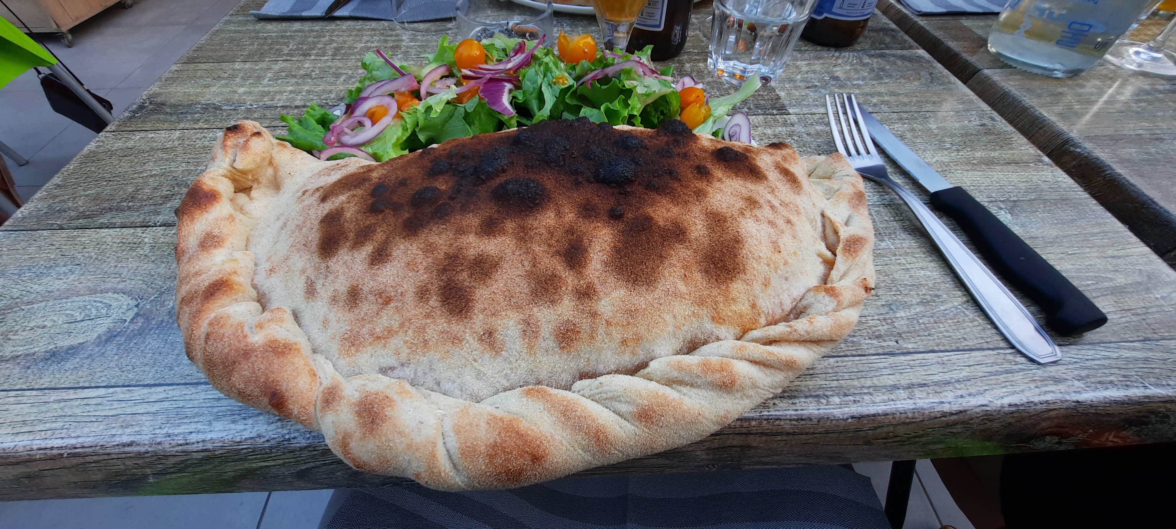 Équipe très sympathique, cadre agréable, le calzone, plus grand que mon assiette était délicieux et servi avec une généreuse salade ! Encore merci pour votre accueil.
