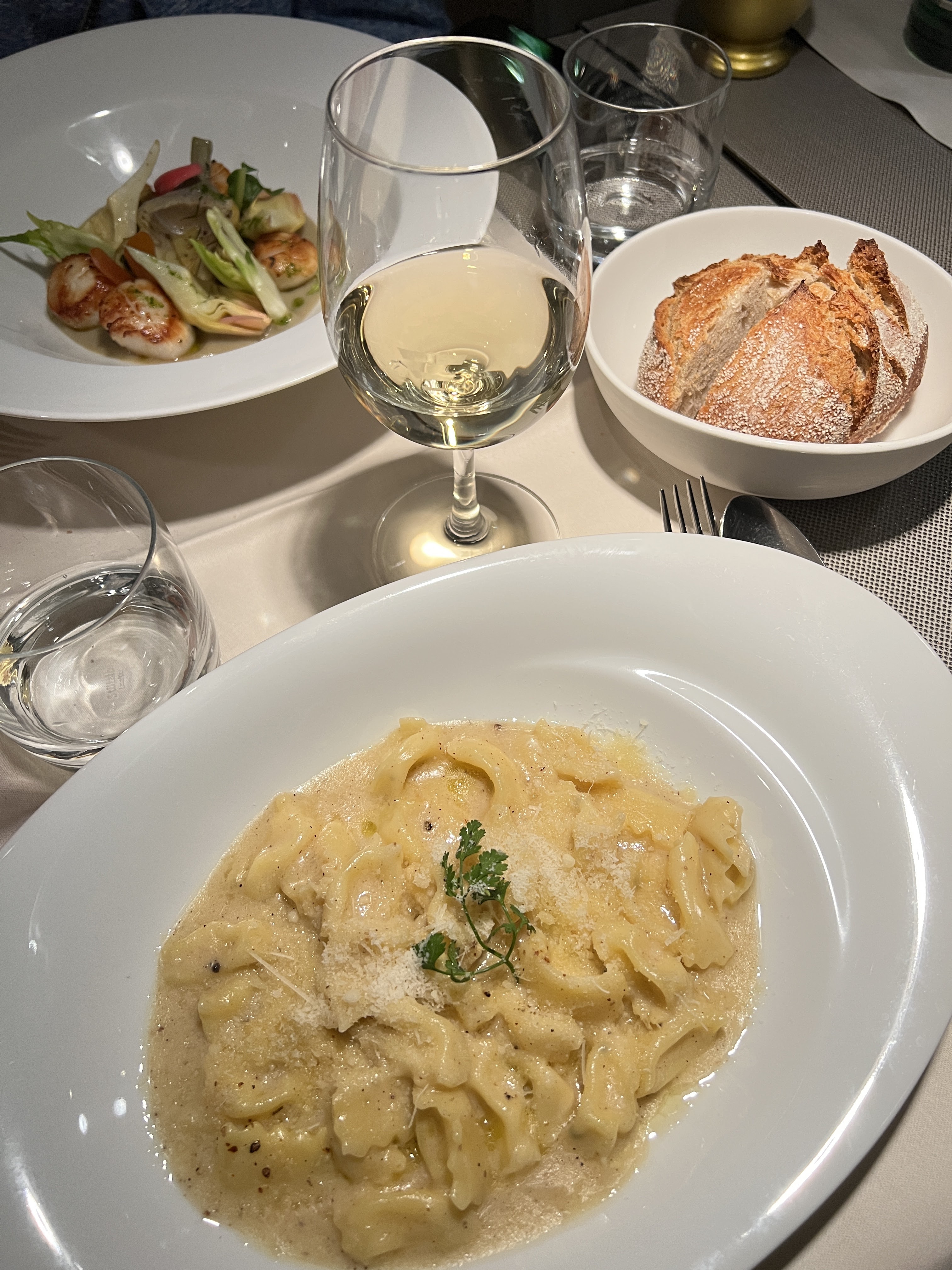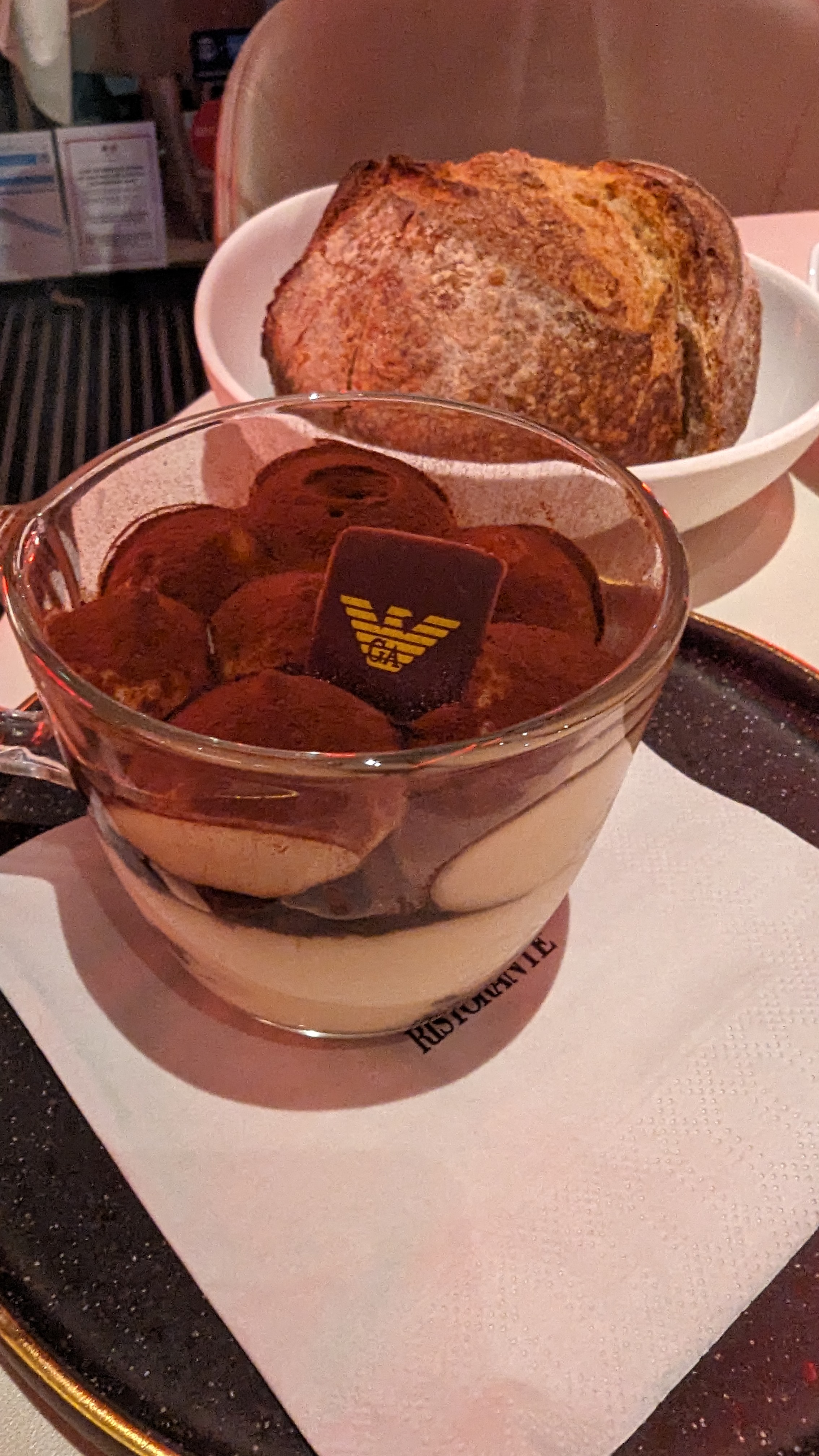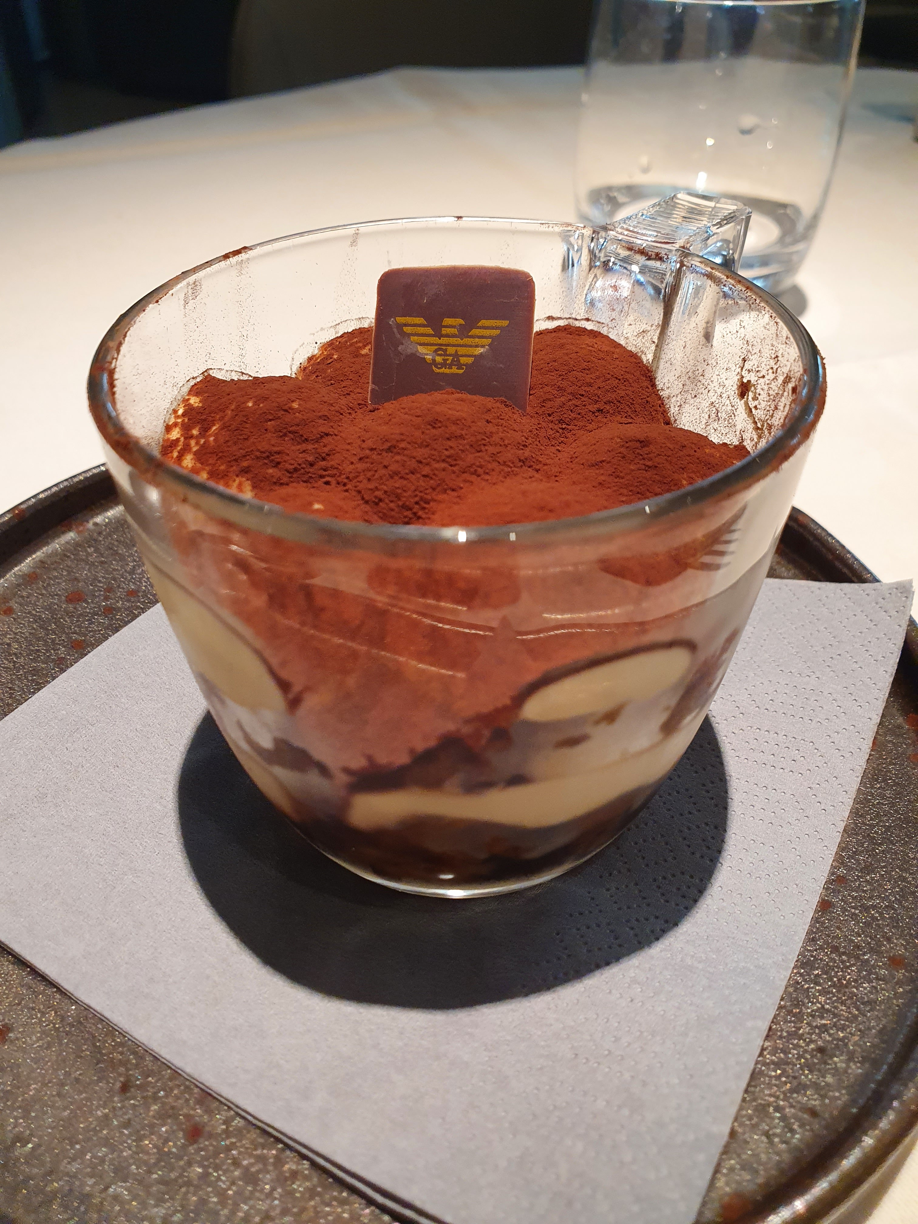 La table du Emporio Armani Caffè fut une bonne découverte. L’endroit est agréable et le service répond aux attentes, pour le niveau du restaurant. Du choix dans la carte mais pas trop. Nous avons opté pour les palourdes en entrée, osso bucco et pâtes langoustines en plats. Les plats sont généreux et savoureux. Prix un peu élevés pour la qualité de l’assiette mais on paye surtout le nom et l’emplacement du restaurant.