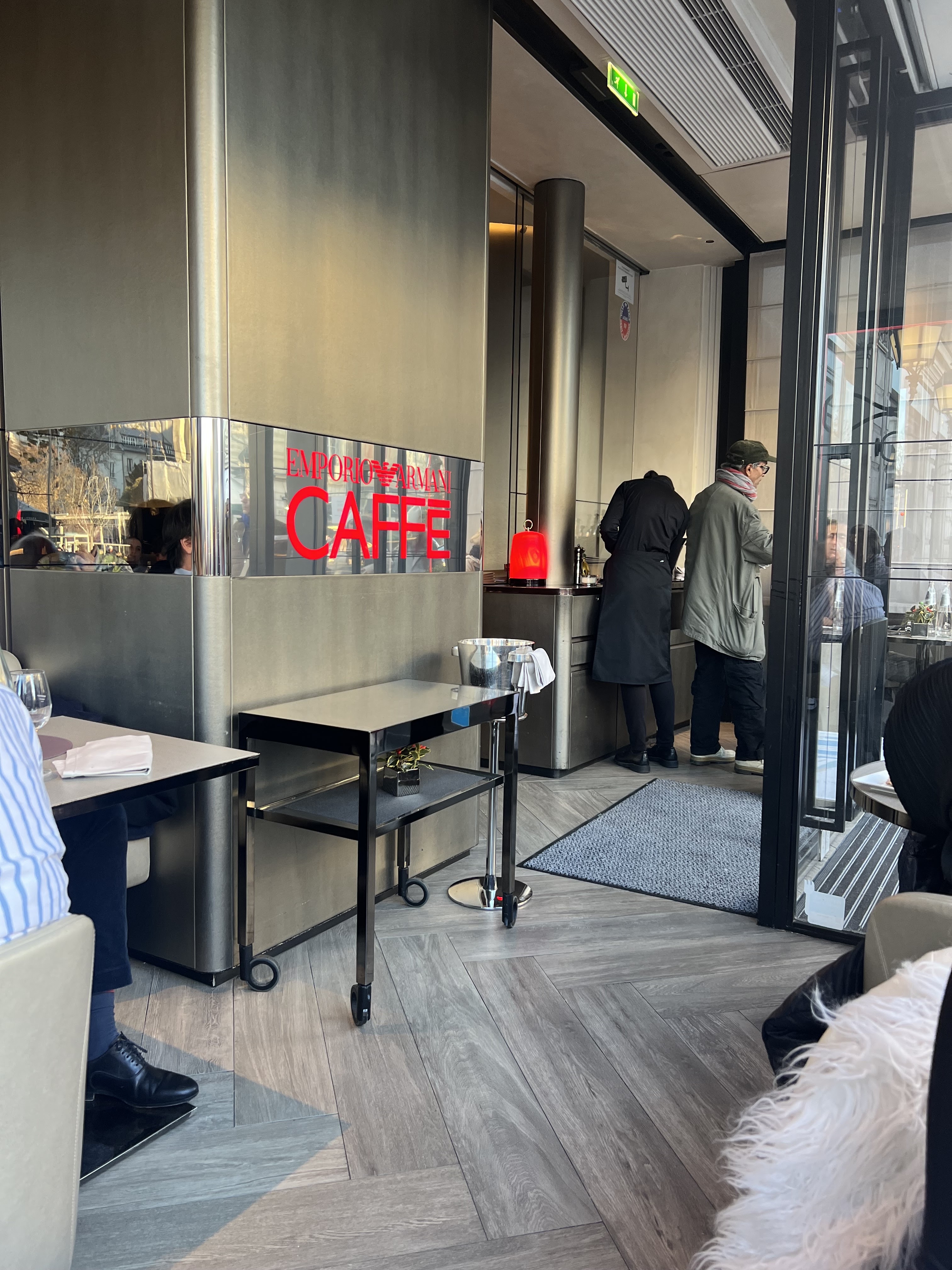Tres bonne expérience découverte dans ce sympathique et stylé « Armani café « au rez de chaussée du restaurant d’un chef italien étoilé 149 bd St Germain , PARIS près de chez LIPP Superbe table aux produits frais et justes : ( lunguines palourdes et poutargue à recommander !! .) Peu de tables donc prudent de reserver j’imagine . Prix des plats en correspondance avec leur qualite mais pas exorbitants du tout compte tenu du cadre et des services . Champagne un peu cher mais on peut s ´en passer ... Tres bon moment dans cet établissement