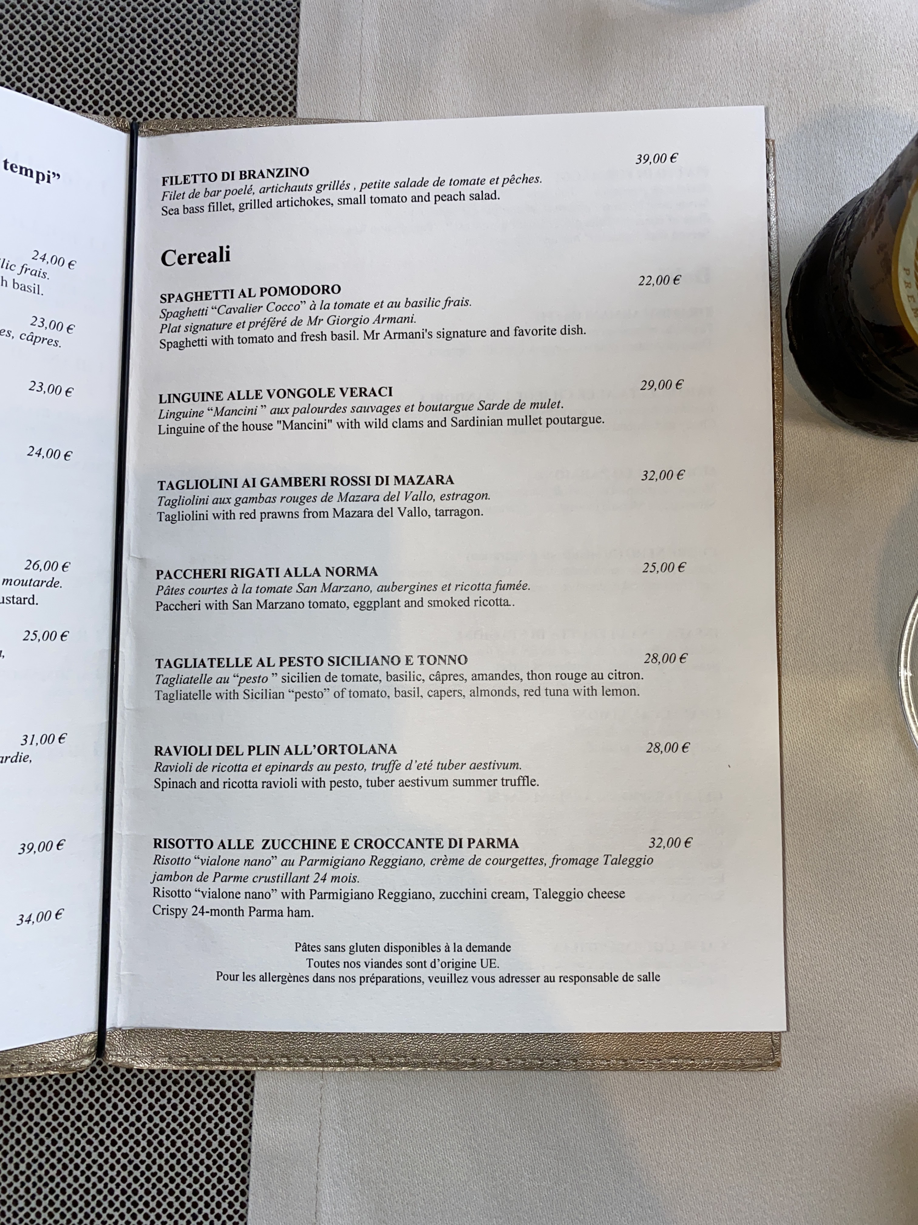 Nous y allons à chaque passage à Paris et nous sommes toujours très bien accueillis chez Armani Caffè. Personnel aux petits soins, pâtes exquises. Je vous conseille de garder un peu de place pour la glace turbinée : un délice ! 😋