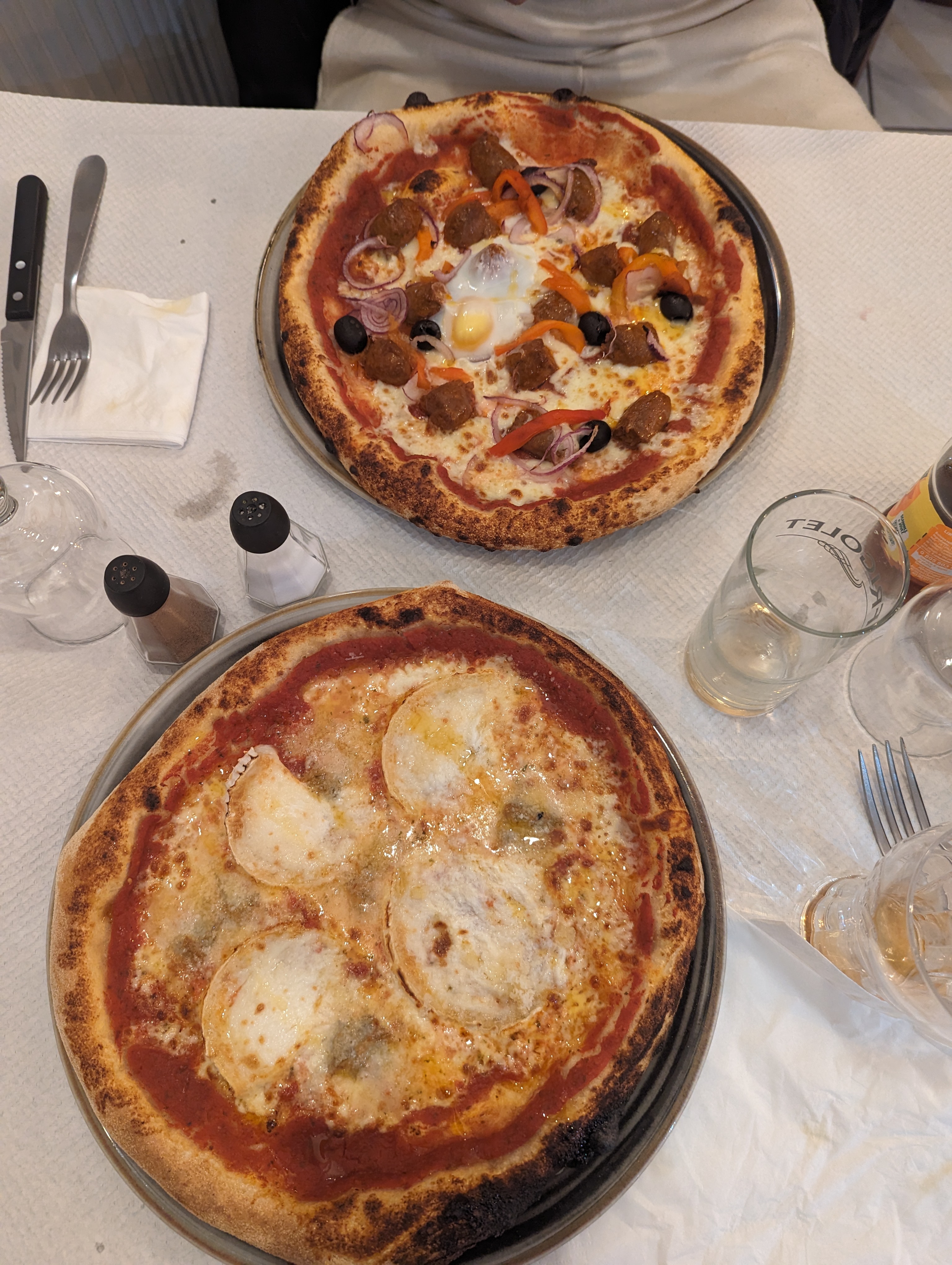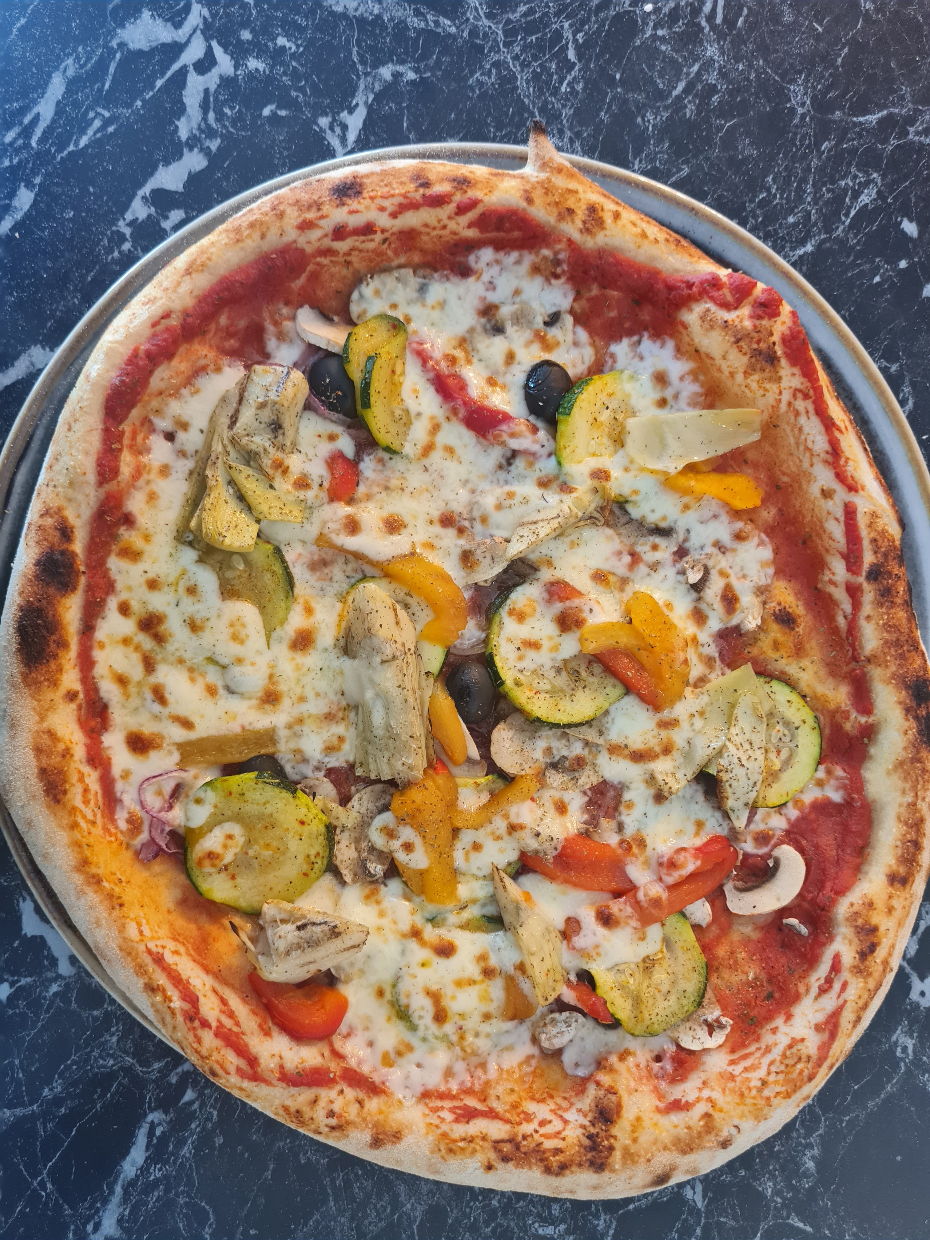 Pizza vegetarian avec des produits frais (le patron a rajouté gratieusement de la pulpe de l'ail à la demande), la petite salade en plus. Parfait pour une etape rapide! Très propre.