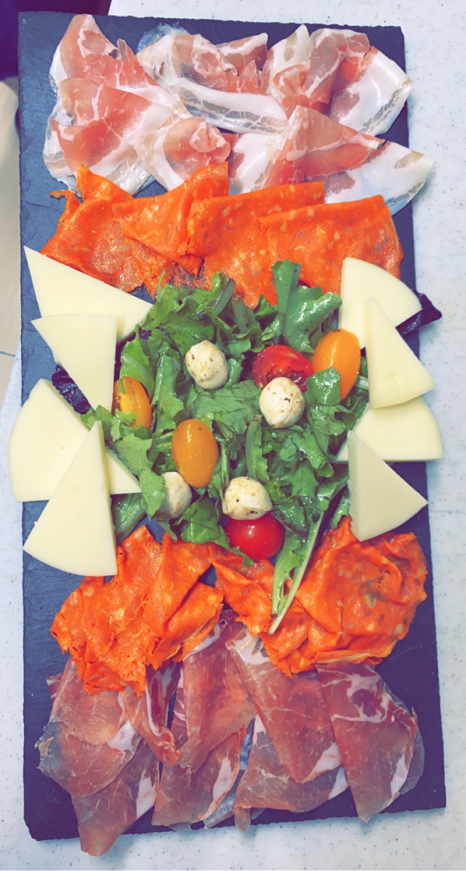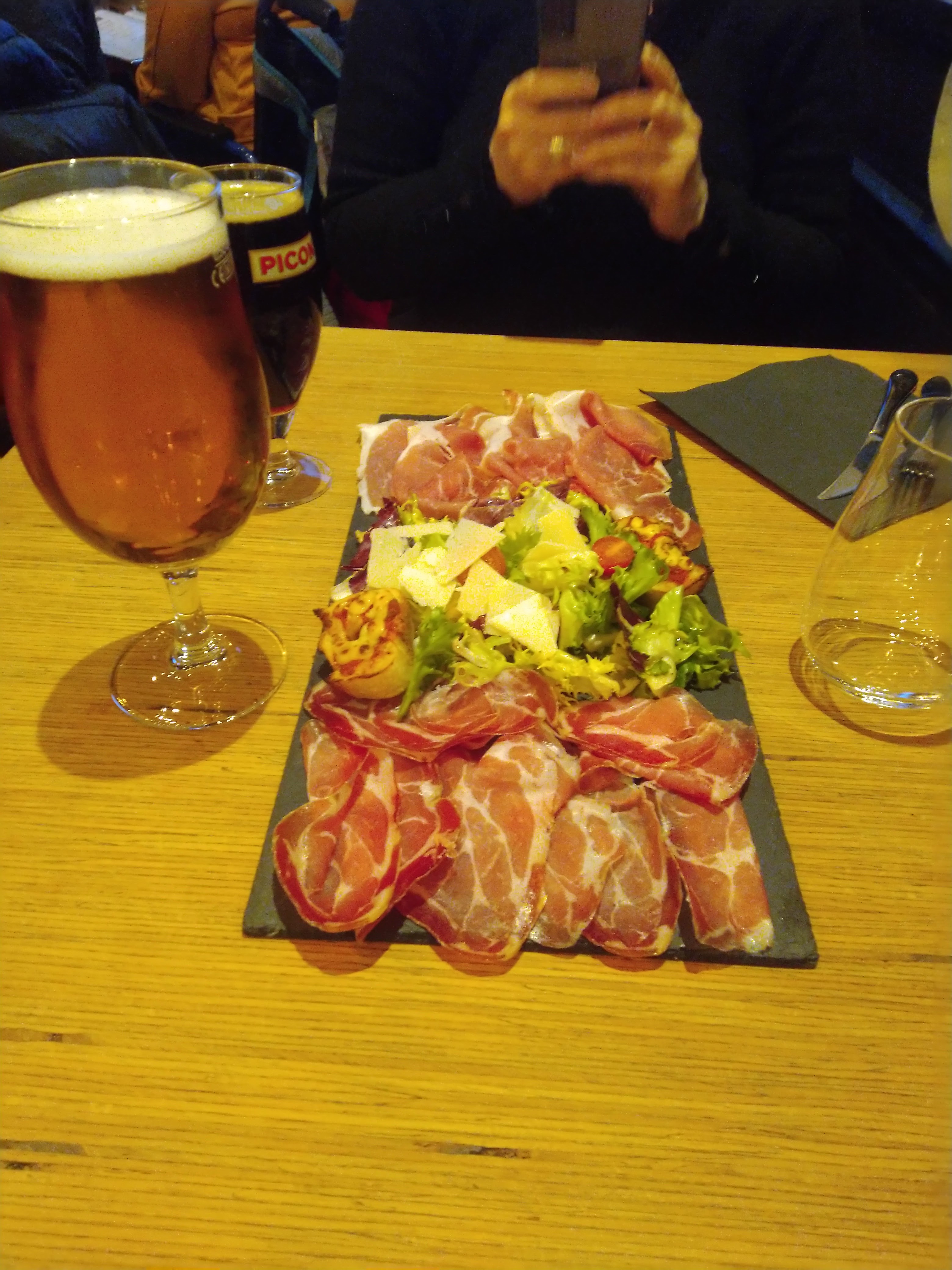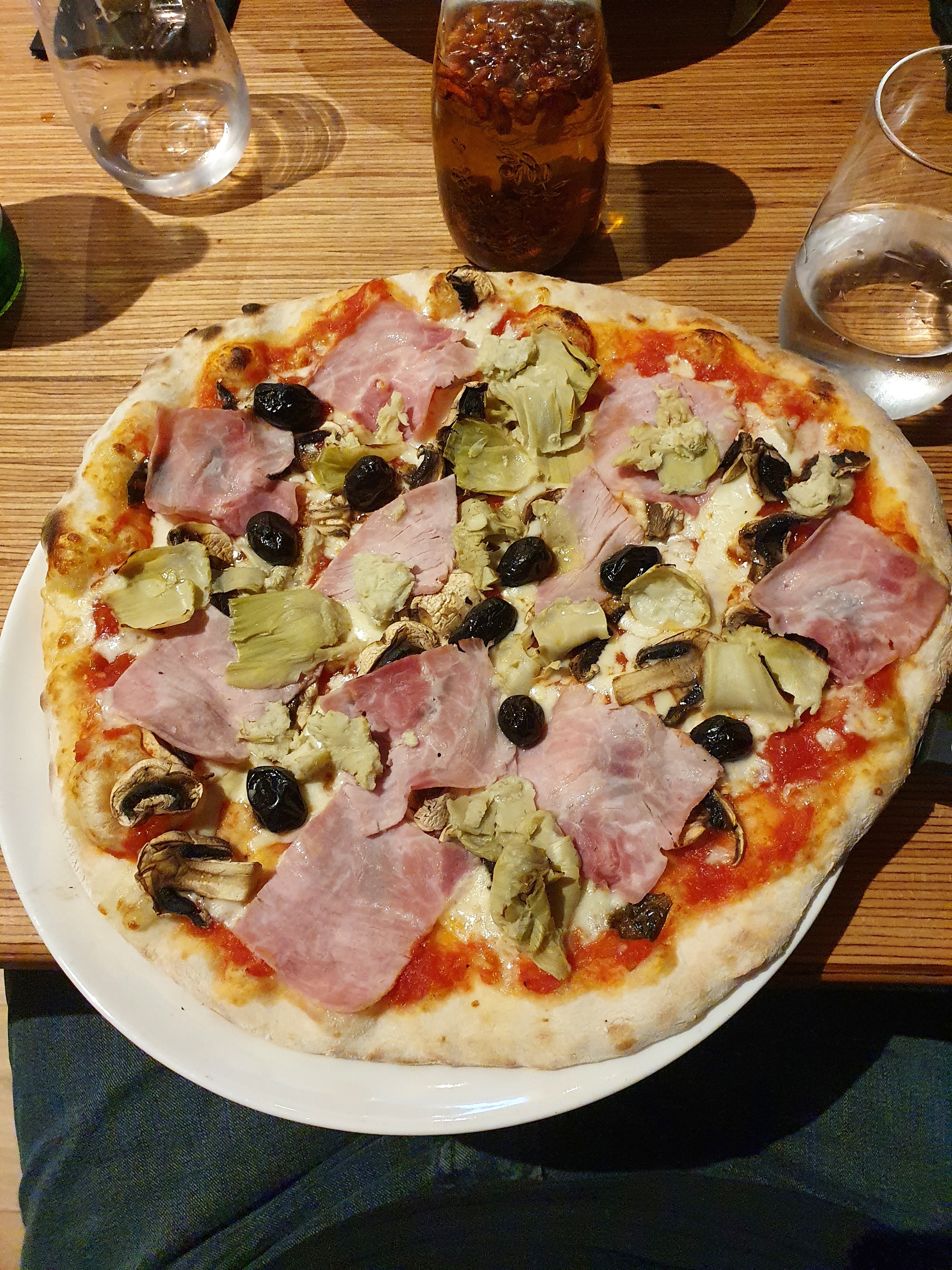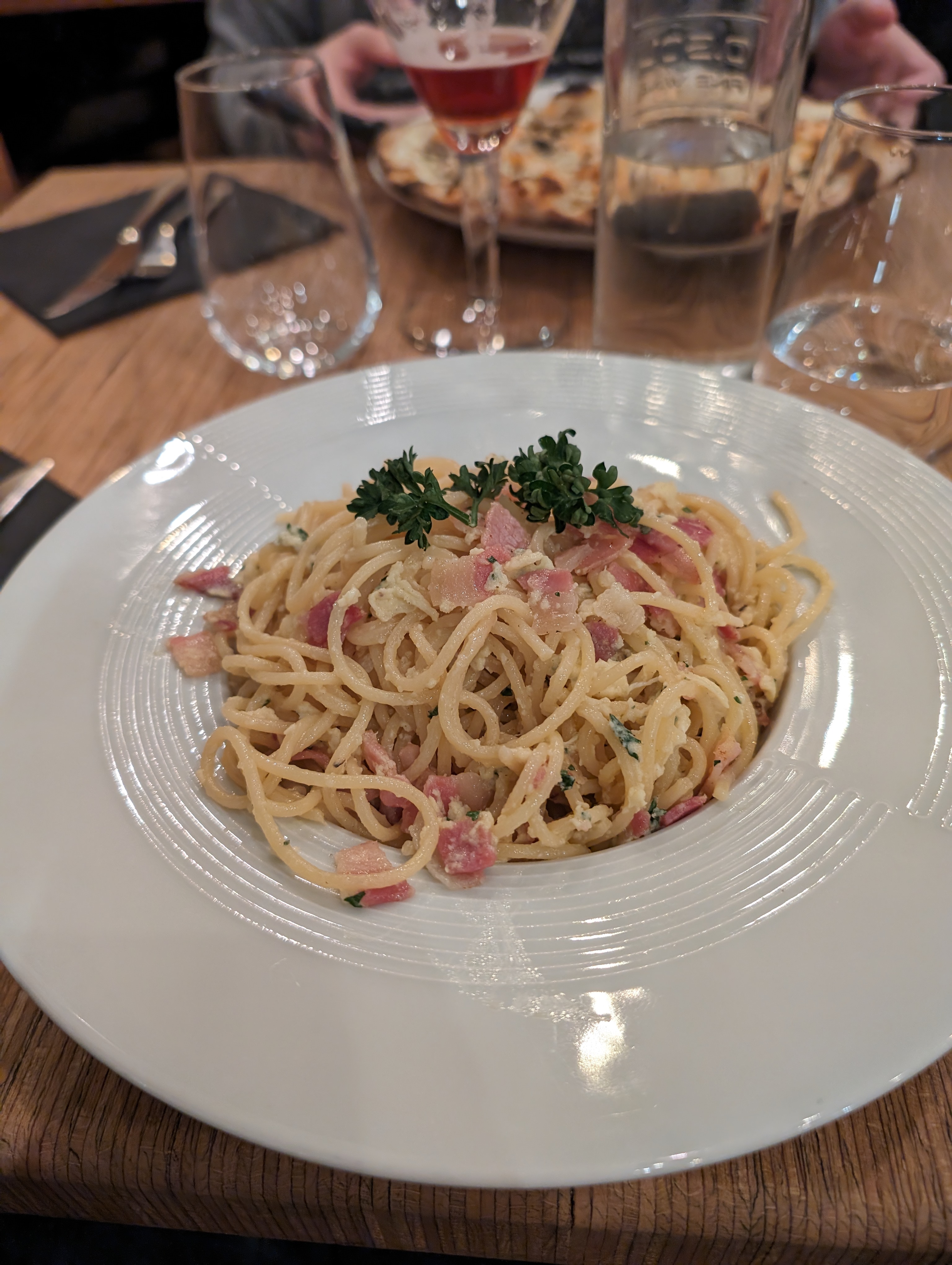 Ça passe. Salade italienne: des salades, quelques copeaux de parmesan, 4 petits bruchetta, huile d'olive, et voilà. Pas copieux pour 15€. Manque le mozarella (malgré que c'est marqué dans le menu), pas assez assaisonné. Pizza: Bon. Les olives ne sont pas dénoyautées, donc attention de ne pas casser les dents quand on croque le pizza. Et pourquoi servi dans une assiette creuse => le pizza bouge à chaque fois qu'on le coupe ? Spaghetti carbonara: Bon. Pour conclusion : le repas est OK mais ne justifie pas le prix.