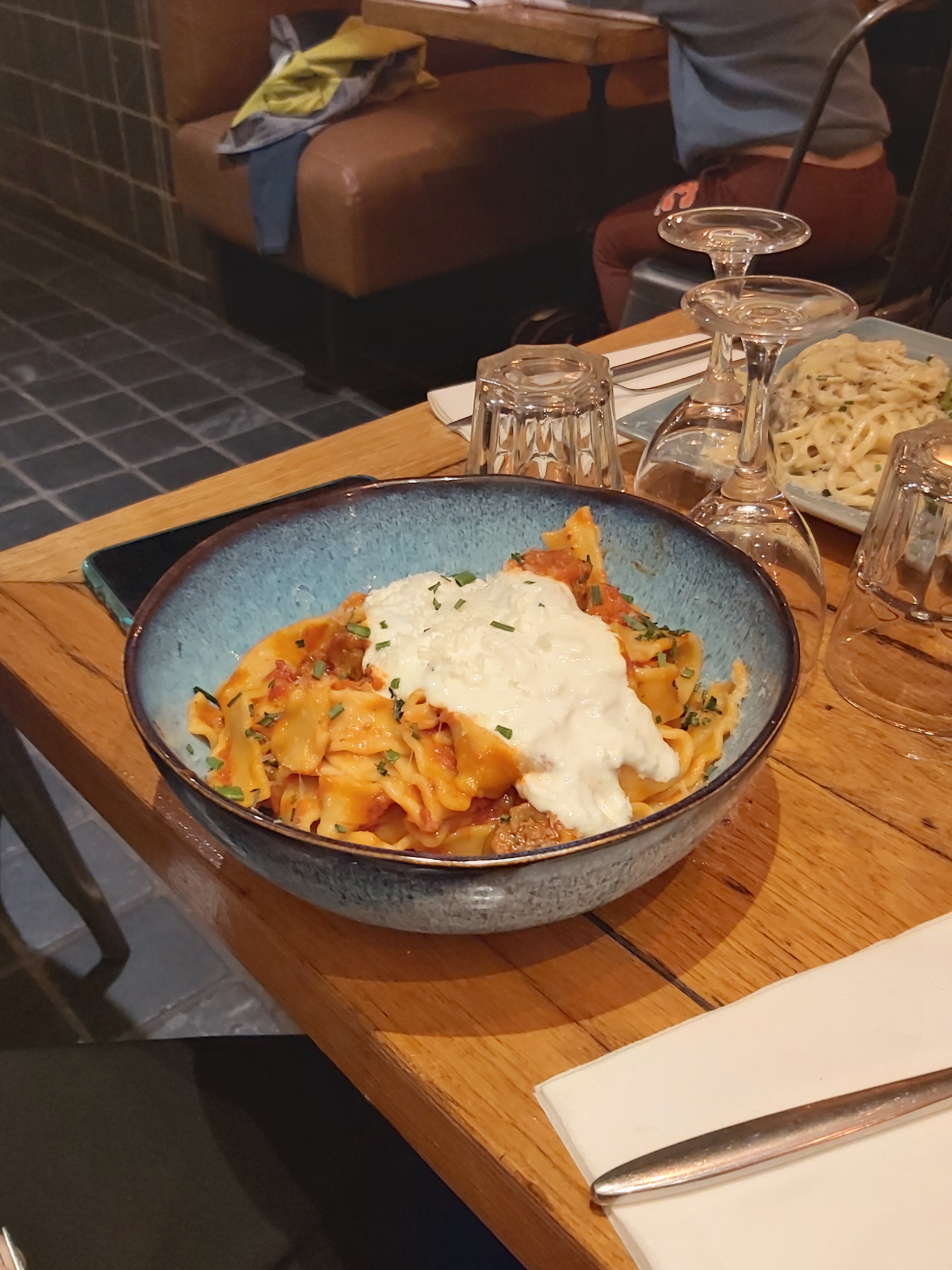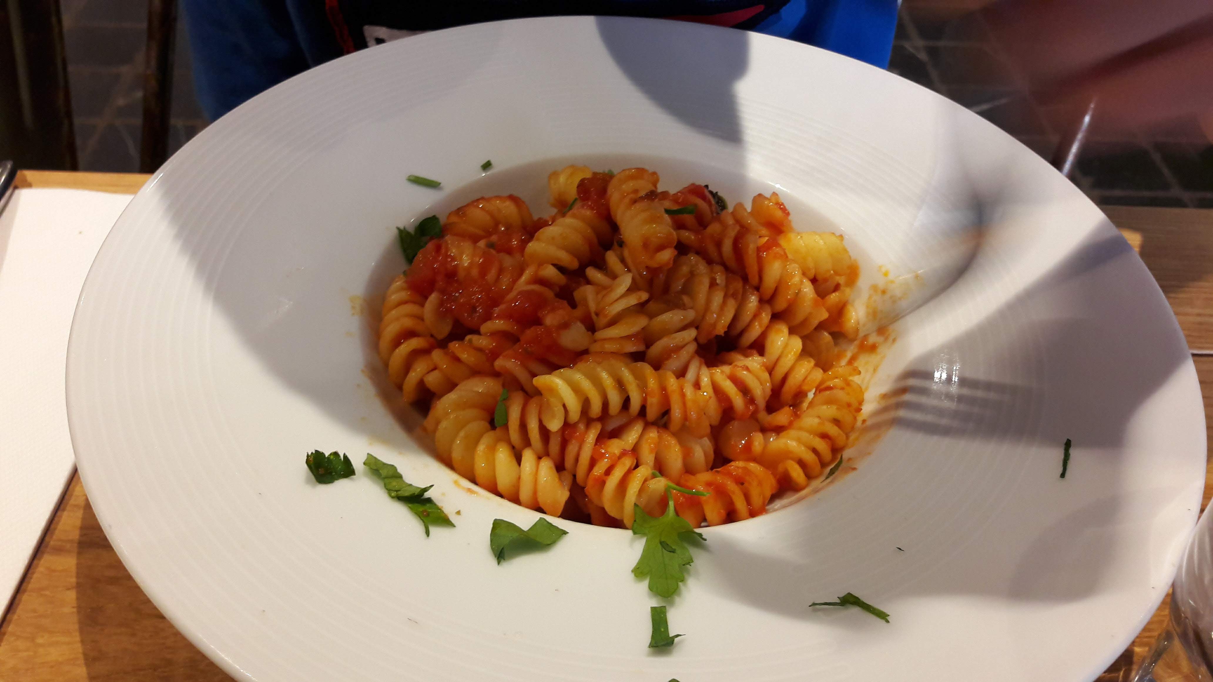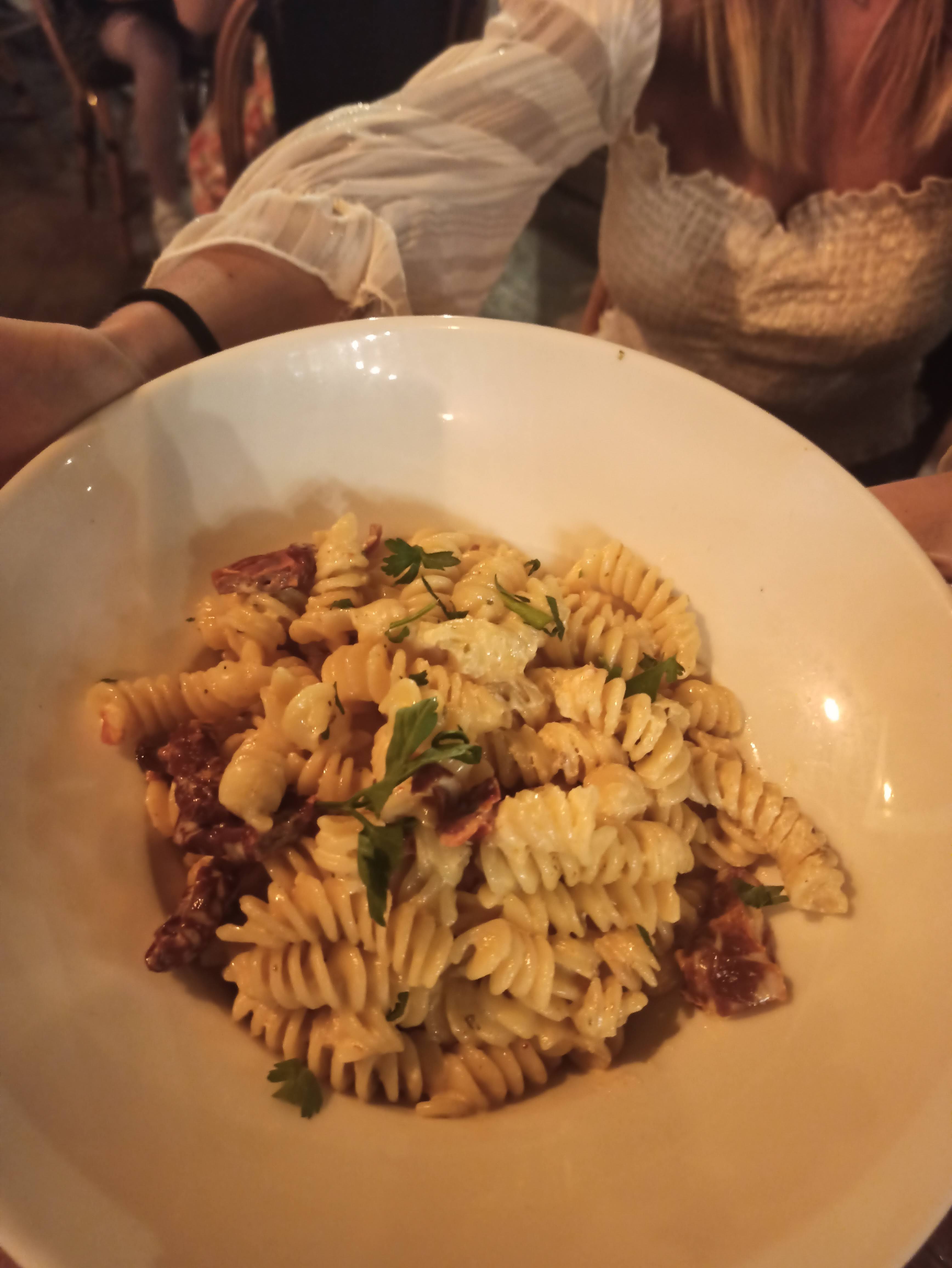 Nous avons pris en entrée une stracciatella qui était très bonne même si elle manquait légèrement de sel. Ensuite, nous avons goûté les fusilli au chèvre miel et les rigatonni à la sauce tomate et aux aubergines. Nous nous sommes régalées. Les assiettes sont copieuses et la cuisine est très bonne pour le prix. De plus, le service etait top avec des serveurs tres souriants et agrebales. Nous sommes venues un samedi soir et avons attendu 30min donc pensez à réserver.