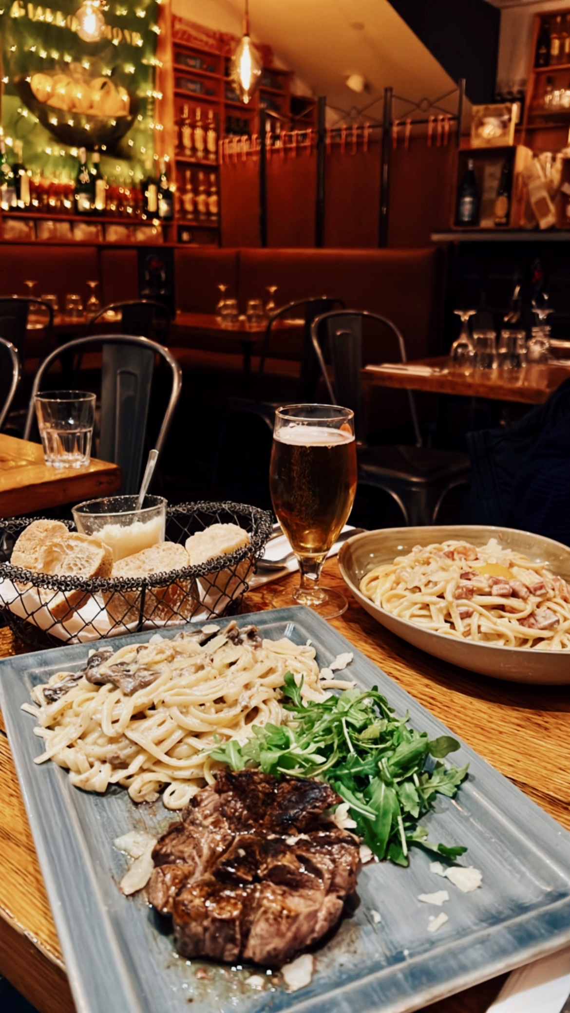 Arrivée à 21h30, prise de commande à 21h50, servies à 22h25. Plus d’une heure pour avoir un plat, nous avons dû demander plusieurs fois du pain et du parmesan, on a dû finir par se lever pour aller le chercher nous même (on était déjà à la moitié de notre plat). Les plats sont normaux en terme de quantité mais 3h après j’avais très faim par contre. À 21€ un plat de linguine avec 6 petites palourdes, ça fait un peu mal quand même. Le plat manquait d’assaisonnement, j’ai goûté ce type de plat dans d’autres restaurants et c’était nettement plus savoureux. L’ambiance était bonne, par contre impossible de s’entendre parler. Tout le monde crie dans ce resto, on a vite mal au crâne. Le service : je pense qu’ils se sont laissés déborder quelque part. Car quand je me suis levée pour avoir du pain, après que nous ayons attendu 1h nos plat, j’ai pu constater 5 serveurs en train de blablater. Restaurant qui promet beaucoup de belles choses, mais les plats ne sont pas extraordinaires ils sont bons, et soyez prêt à attendre au moins une heure.