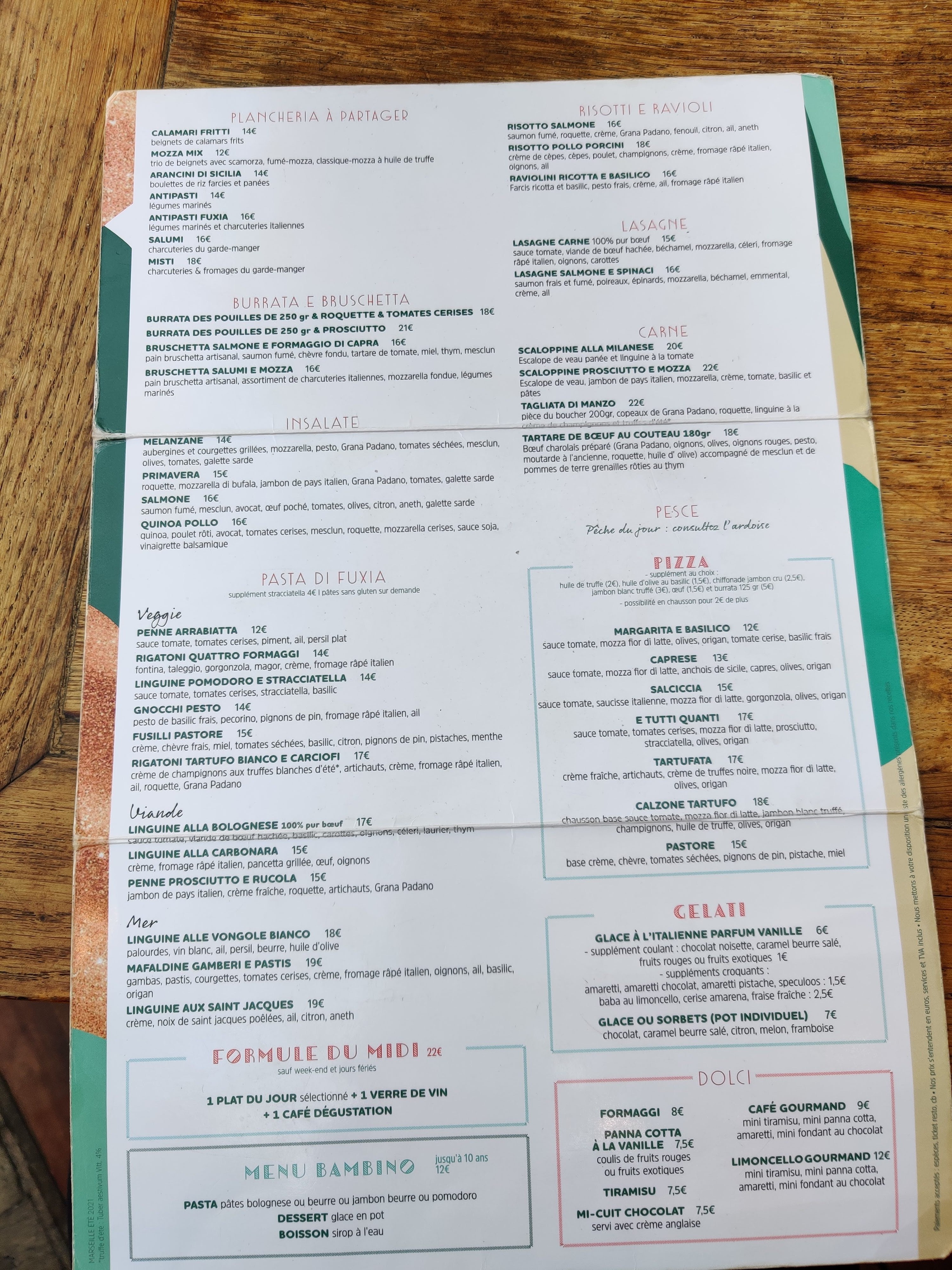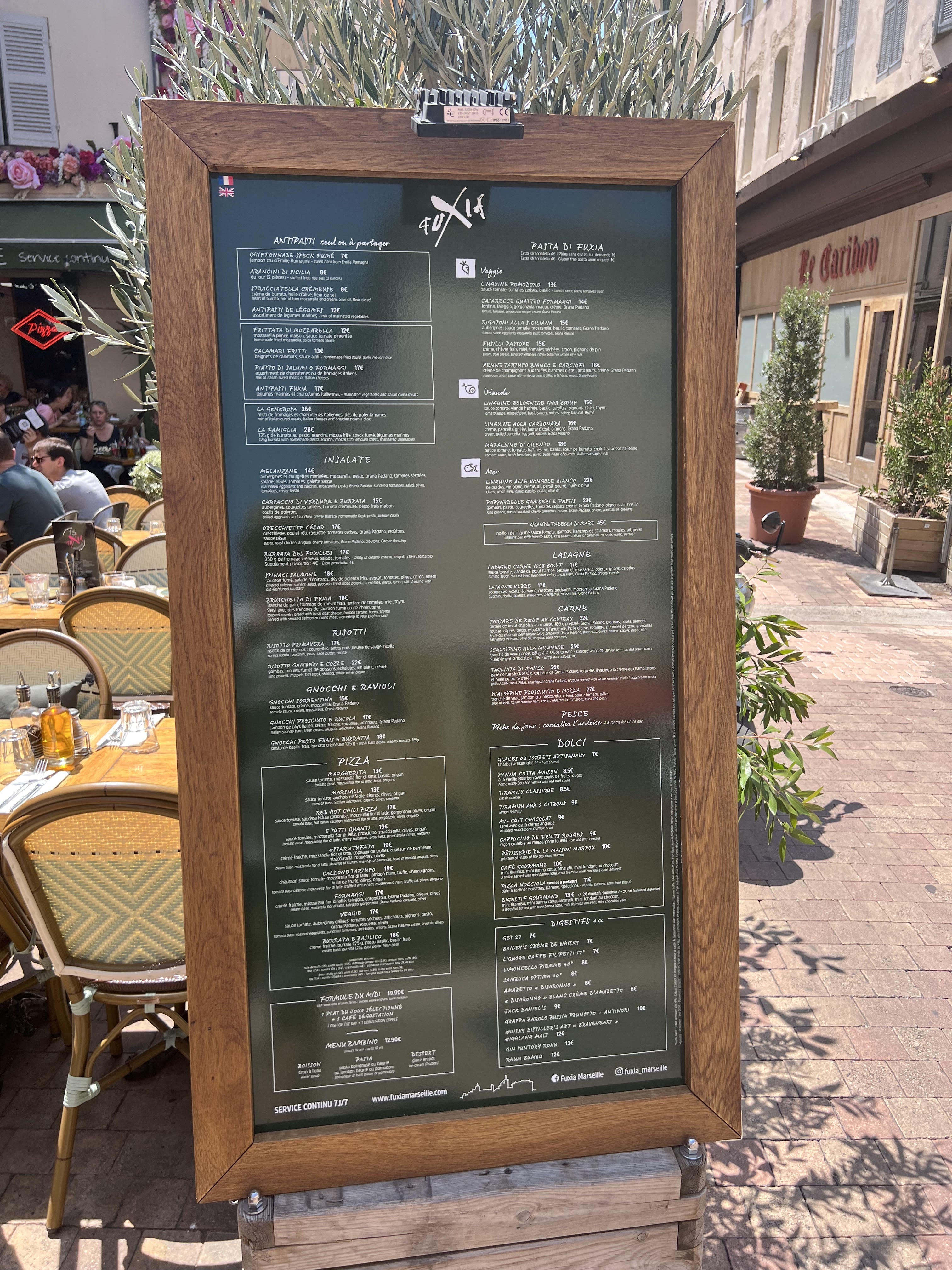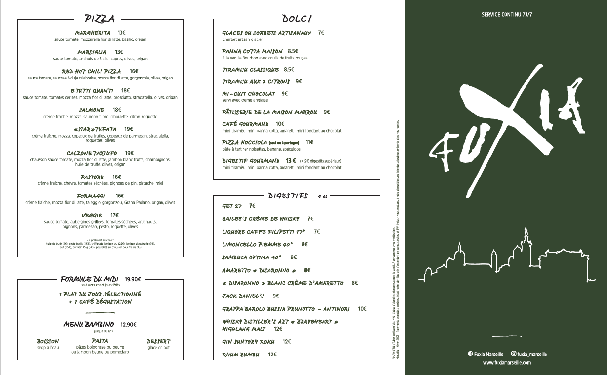 Une virée à Marseille ?! Arrêtez- vous au Fuxia. Restaurant terrasse au Vieux Port, très convivial. Accueil très chaleureux (sourire, bienveillance) par une équipe bilingue. Carte riche, en choix. Plats copieux, savoureux; bon rapport qualité prix. Par contre, y aller quand vous n'avez pas d'activités ou de rdv après, car il y a un peu d'attente. Mais c'est la contrainte pour avoir un bon plat. Je recommande à 200 % Le petit plus, c'est la petite épicerie fine made in Italia sur place.