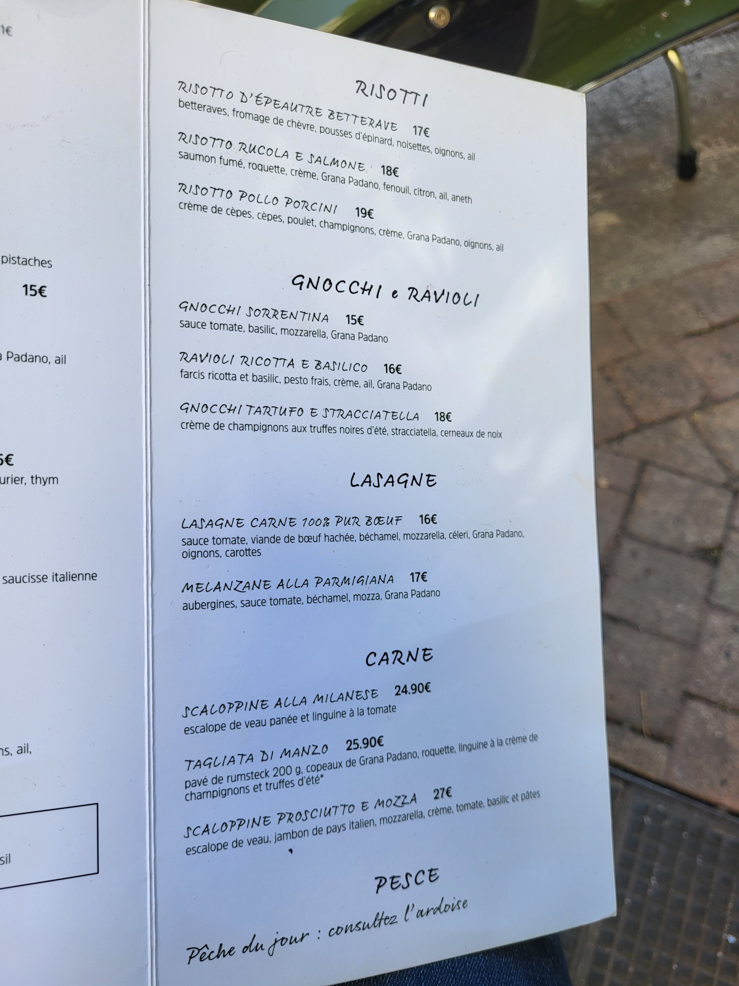 Déçu de mon dîner d'hier soir. J'ai commandé le tagliata di manzo à 26€, les tagliatelles d'accompagnement étaient bonnes mais je n'ai pas aimé la viande. Elle avait un goût acide et une l'odeur de la viande pas fraiche. Je n'ai mangé que la moitié de la portion ce qui m'arrive très rarement. Je l'ai signalé à la serveuse et elle m'avait dit qu'elle allait le signaler à la cuisine. C'est tout, aucun retour. Personellement, je ne prendrai pas le risque de revenir.