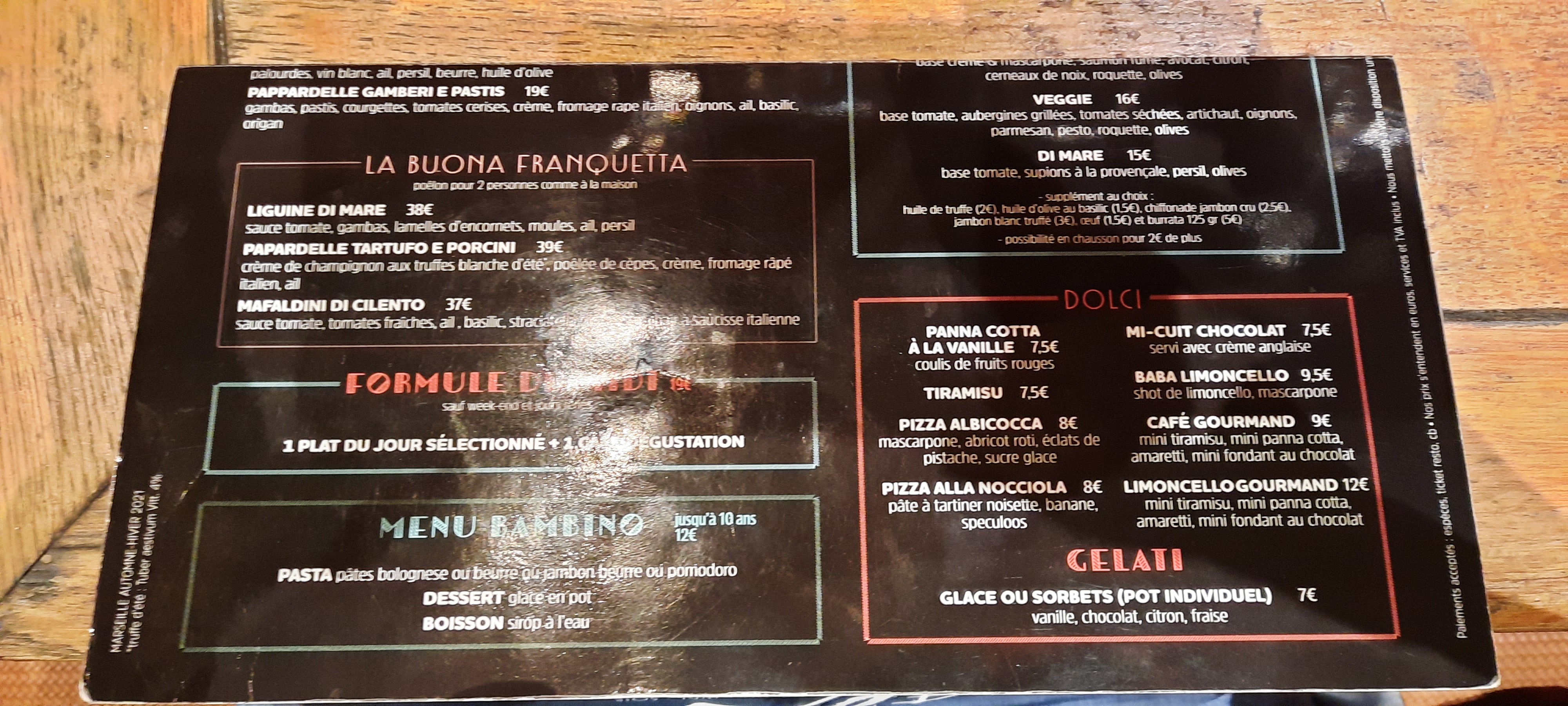 Belle découverte, nous nous sommes régalés. Restaurant au cadre tres sympa, serveurs et serveuses tres accueillants. Service rapide et soigné. Nous etions 3, trois plats de pates differents. Assiettes copieuses. Nous avons égalemenr gouté le tiramitsu, excellent egalement. Je n etais que de passage sur Marseille, mais j y retournerai volontiers, et je recommande vivement cette adresse. Merci à toute l equipe pour ce petit moment de bonheur.
