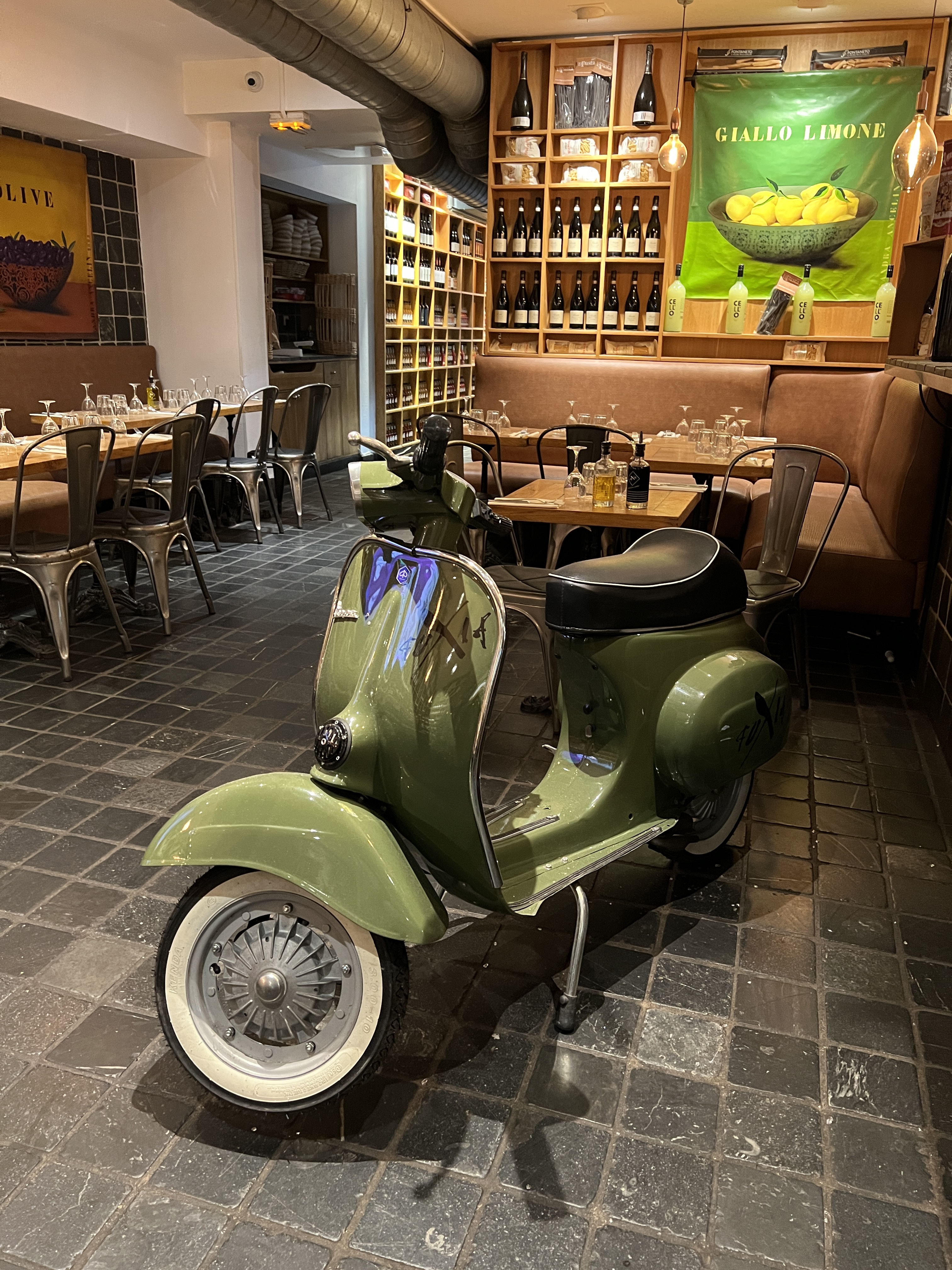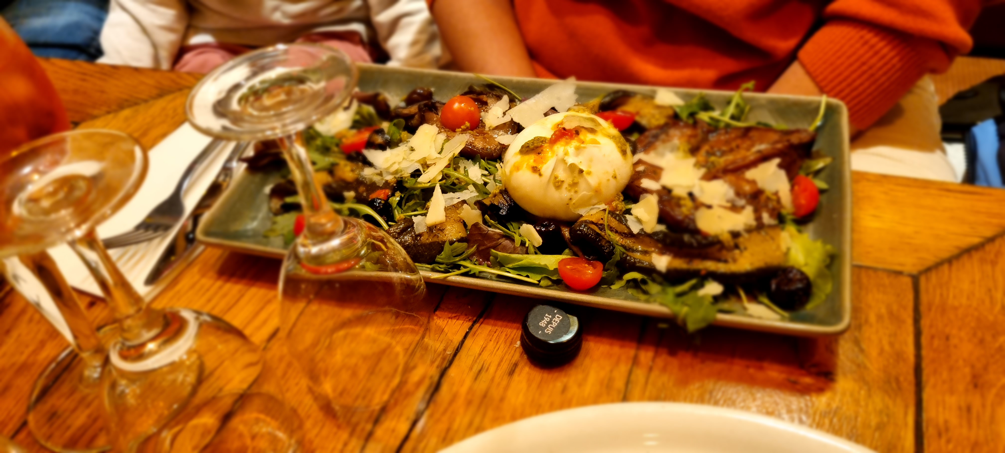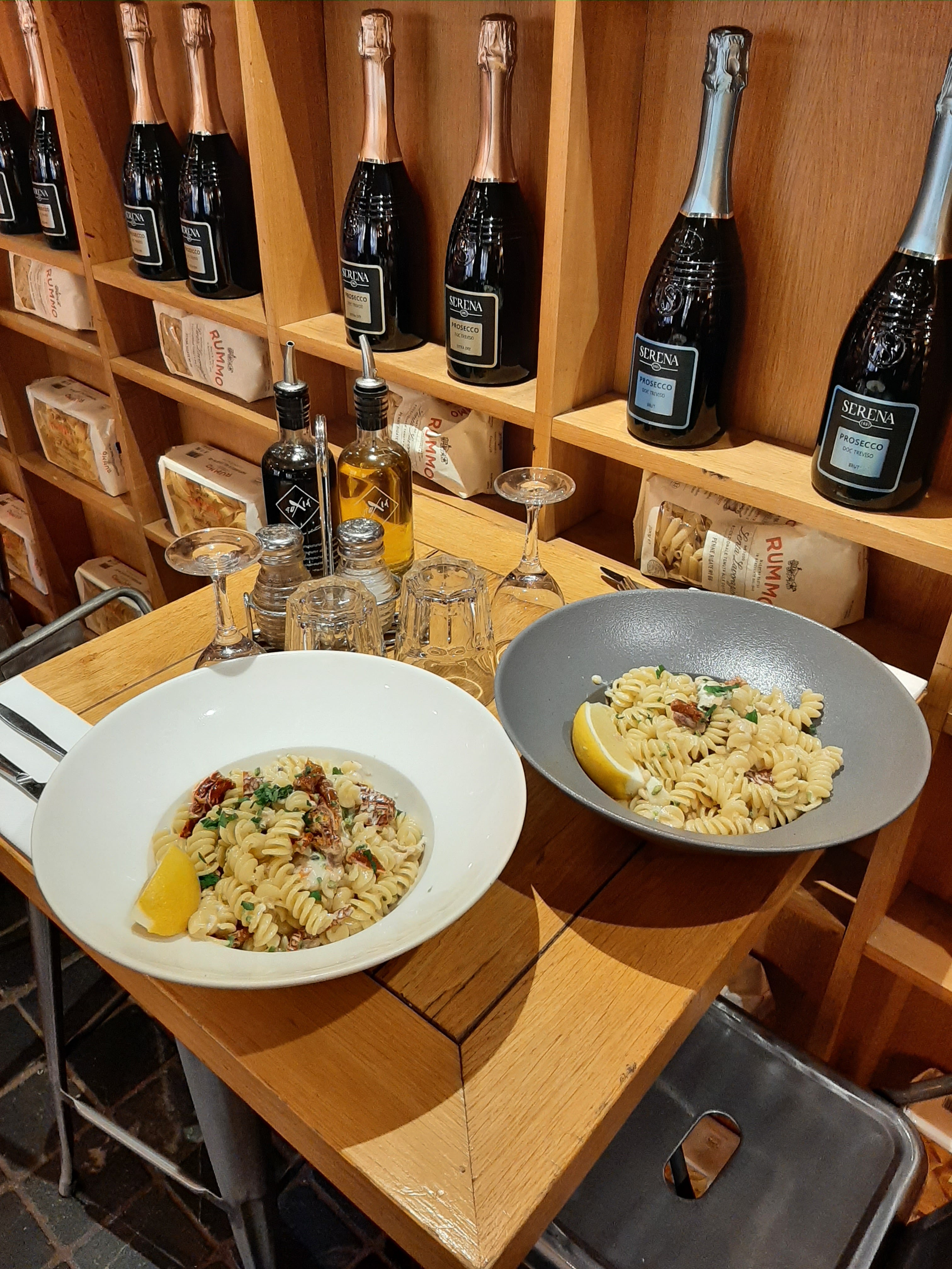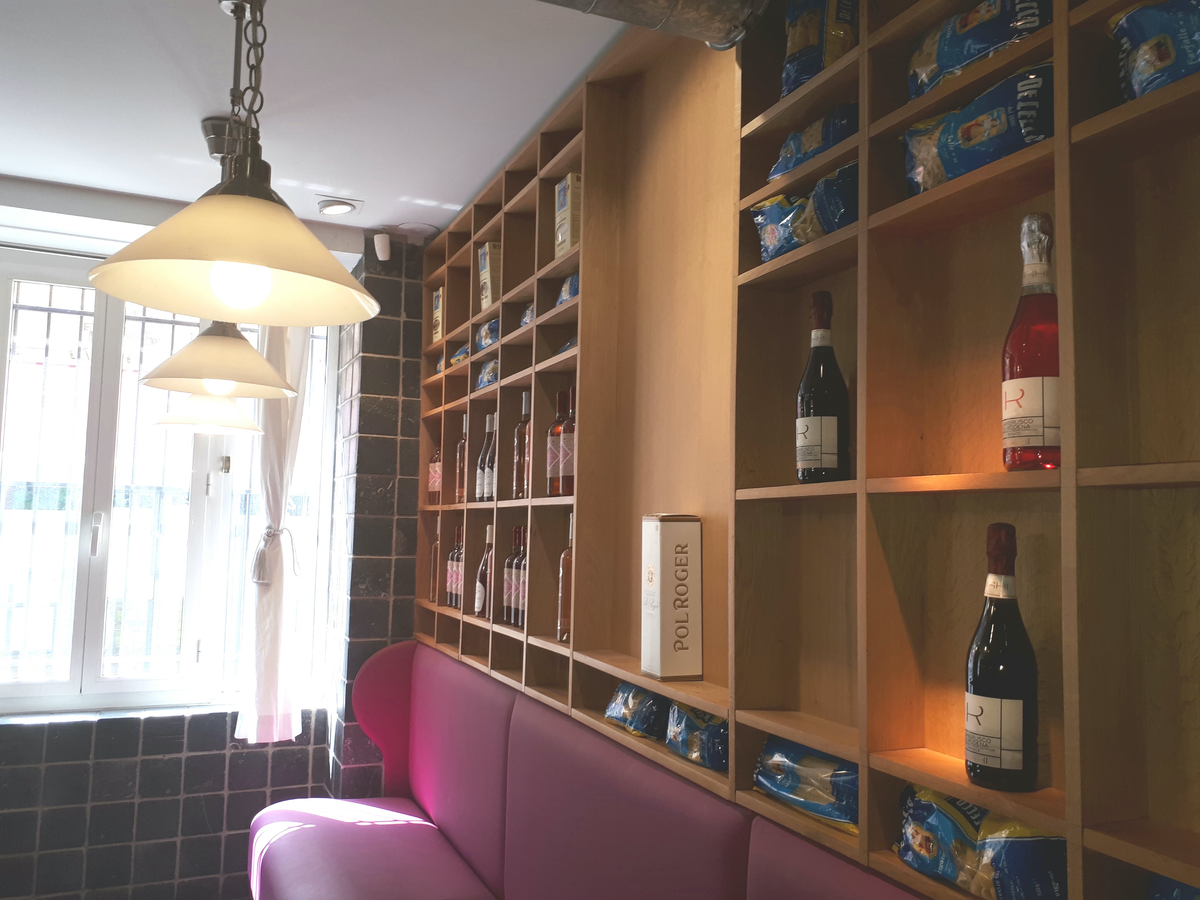 Escalope creme champignons, calamar Campo ou lambrusco. Dans un décor épicerie fine. Les saveurs de l'Italie avant de prendre le métro direction stade velodrome.