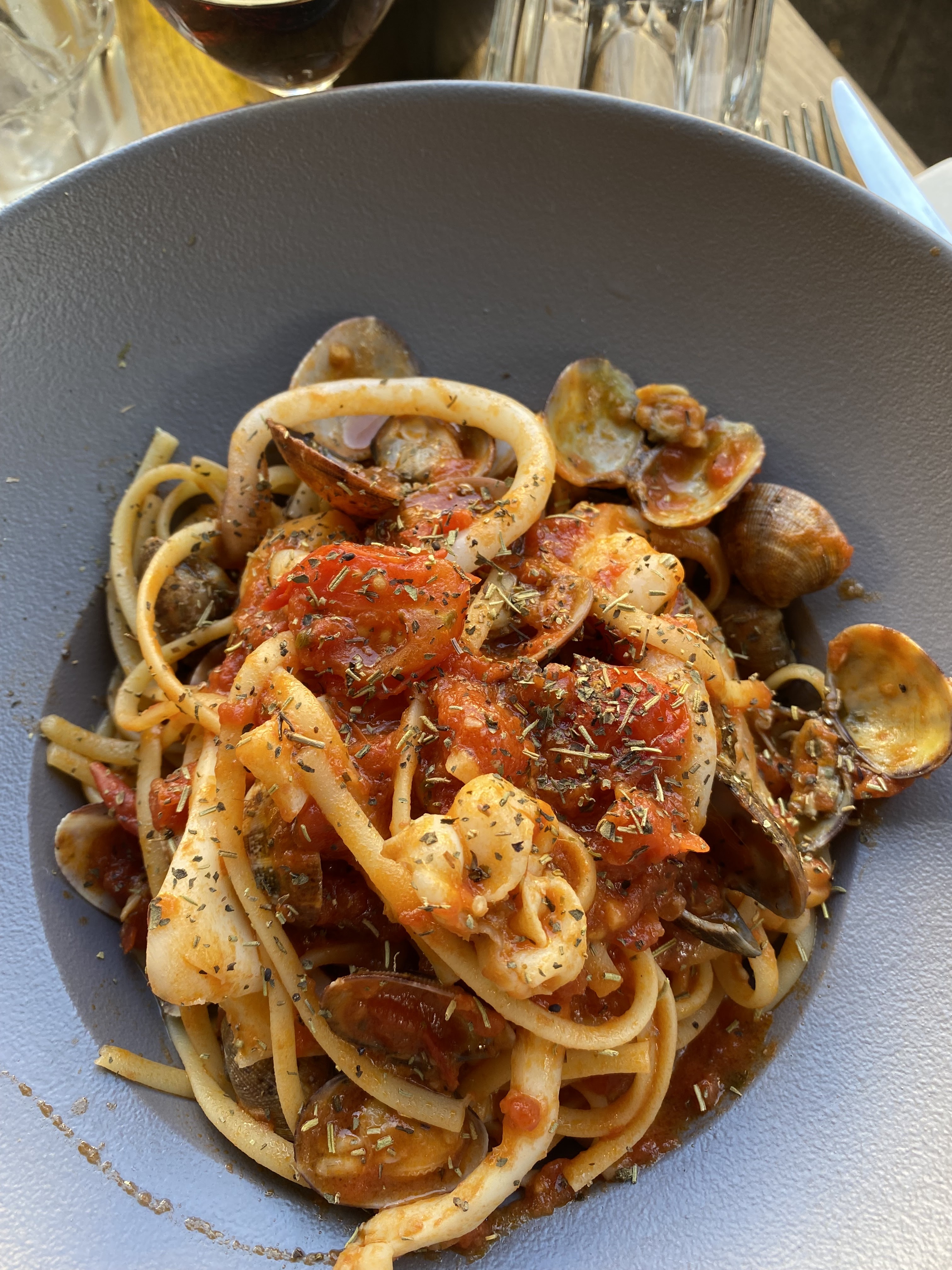 Beau restaurant italien à proximité du vieux port. Situé sur une belle placette. Nous étions une table de 16 (réservé la veille). Tout à été quasi parfait. La serveuse a été très agréable et à l'écoute. Service rapide. Nous nous sommes tous régalés ! Mention spéciale pour le vin des Pouilles. Merci pour les petites lunettes offertes aux enfants. Je conseille fortement ! Gros +, service non-stop.