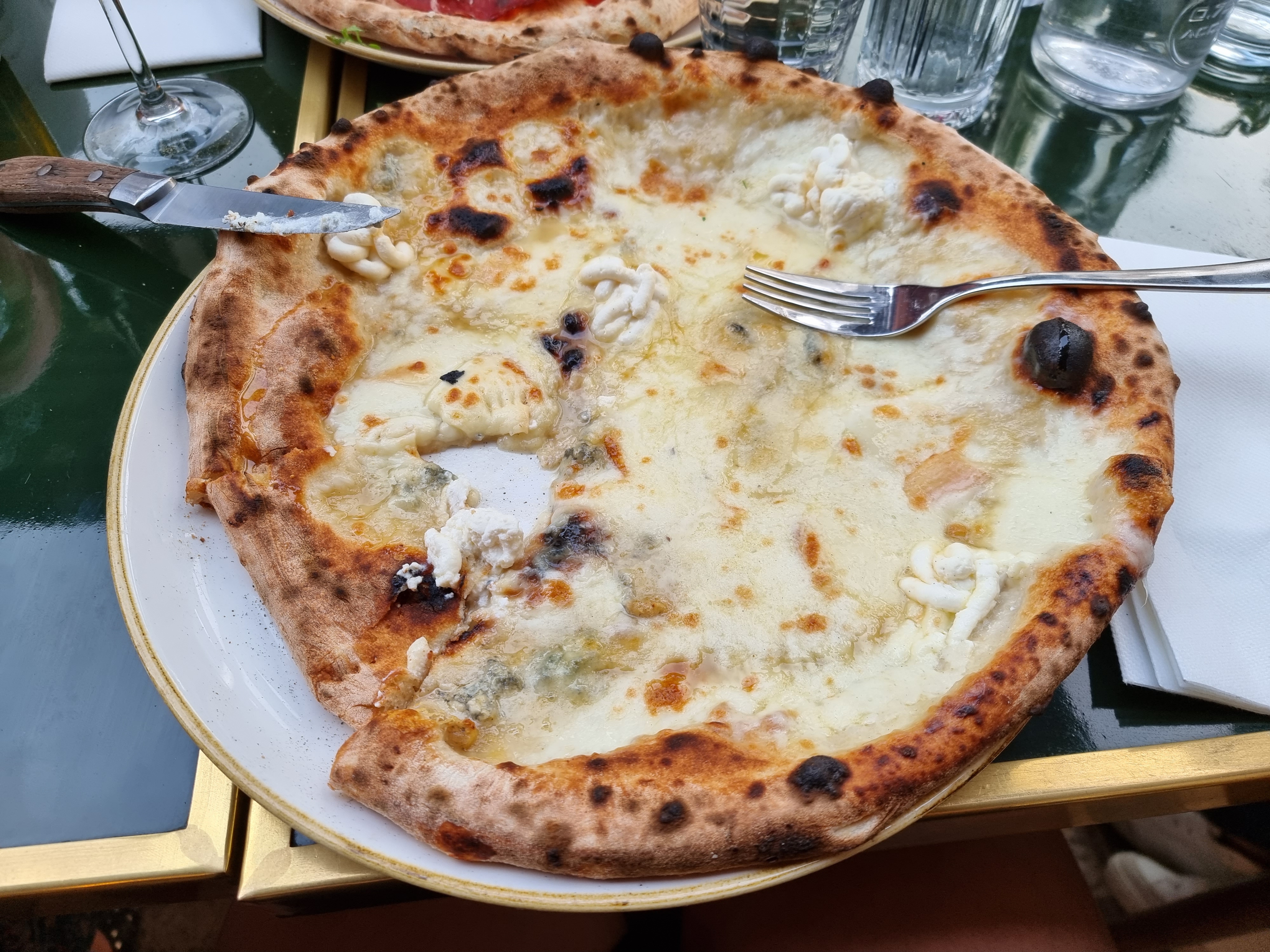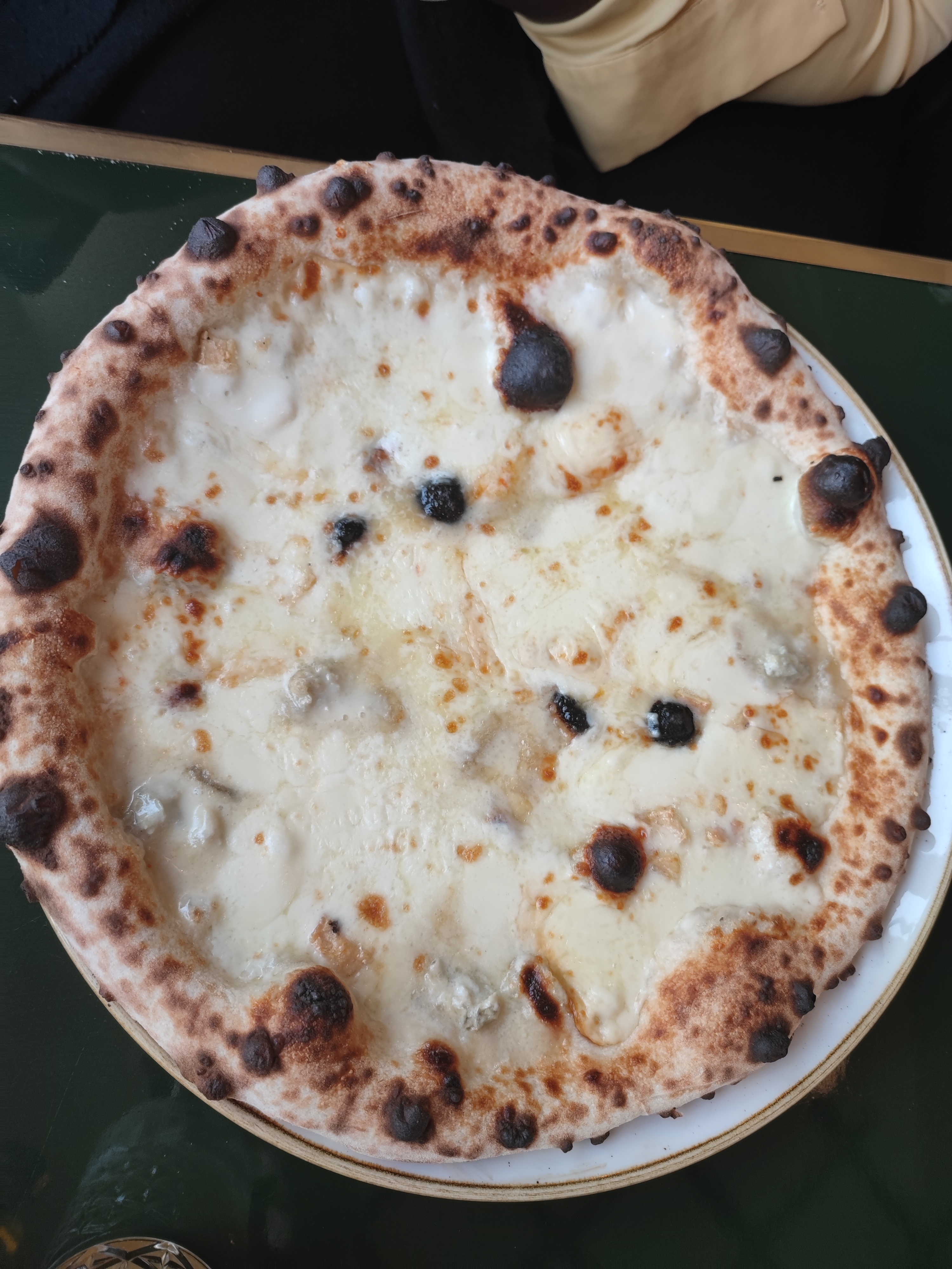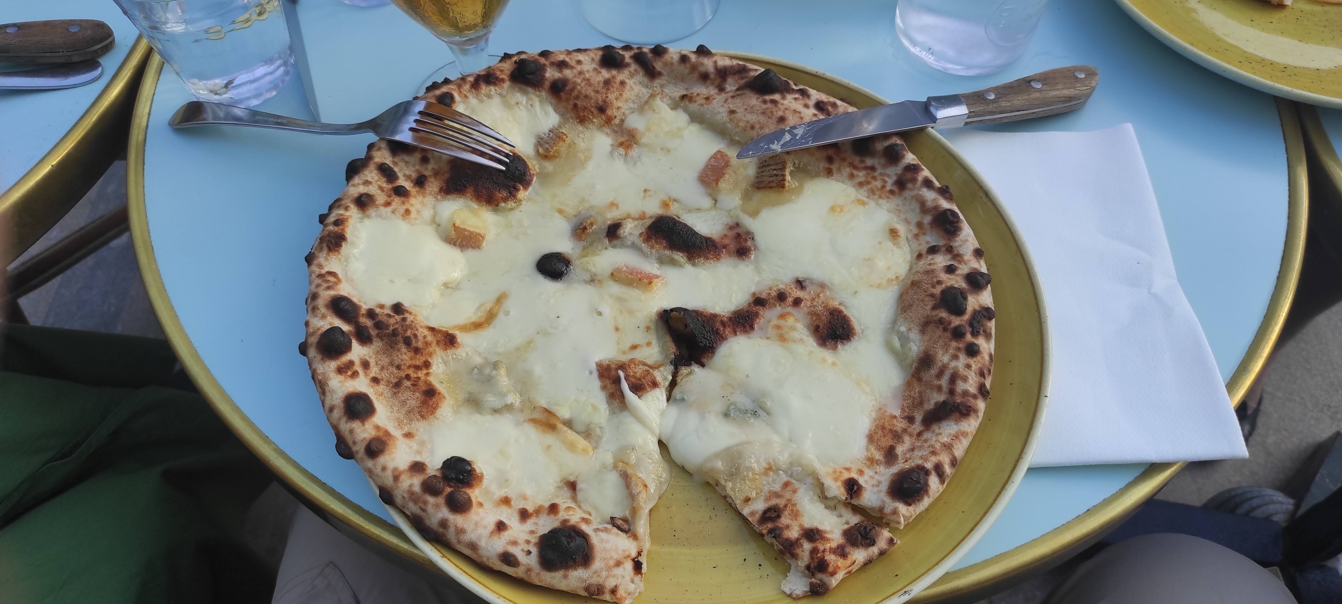 une nouvelle pizzeria, conviviale qui doit beaucoup à une décoration réussie, sa luminosité, une cuisine ouverte sur la salle, un personnel efficace et attentif, et même le pizzaïolo qui discute avec les clients en fin de service. Et il discute de la cuisson des pizzas qui est n'est pas encore entièrement maîtrisée, la faute au four à feu de bois. Alors certes ils font des pizzas à la mode napolitaine, avec le masque de léopard comprendre du brûlé, mais pour moi c'était vraiment trop brûlé. Mais je reviendrai pour prendre des pâtes qui sont très bonnes d'après nos voisins de table. Pour les desserts, je recommande le café gourmand, un échantillon de ce qu'ils font, et ils le font maison et très bien dans 4 petites verrines à la bonne taille.