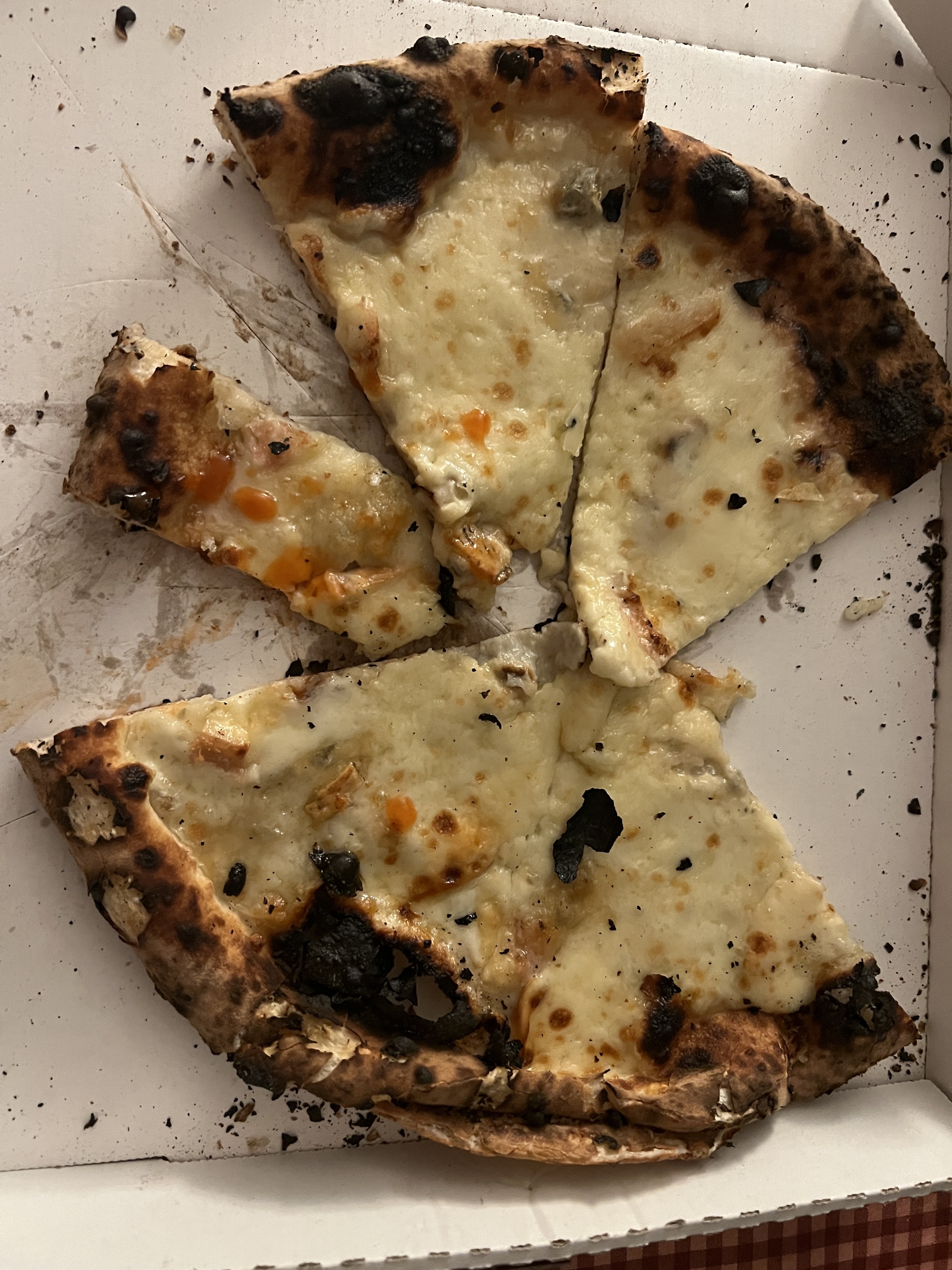 Pizza froide, carbonisée, dommage car les produits sont de qualité. Mais a fuir concernant la livraison, minimum 1 heure pour livrer 2 pizzas à chaque fois, et c'est jamais de leur faute. Je déconseille fortement, trop cher pour ce que c'est.