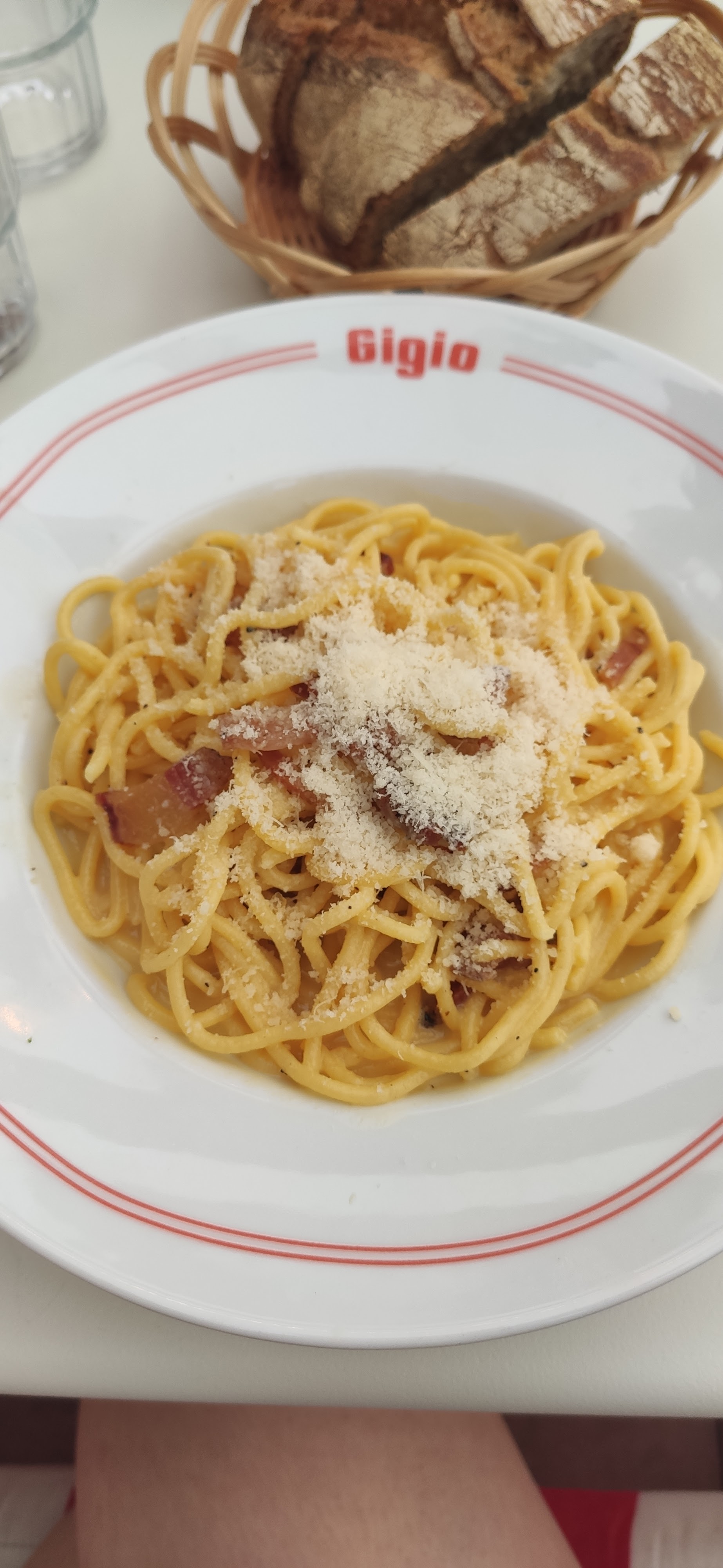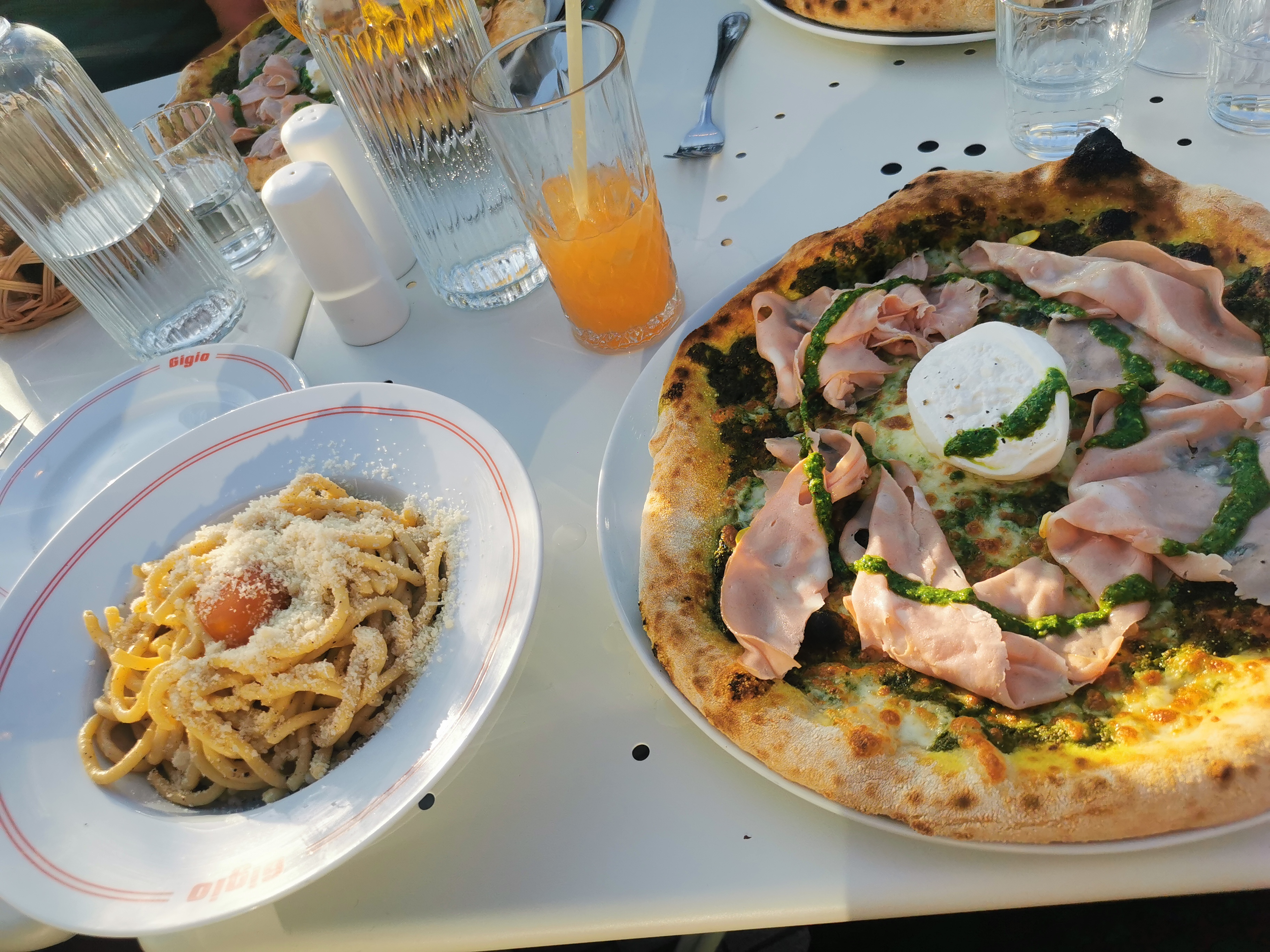 Très bonne expérience car même sans avoir réservé et en plein mois d’août, le personnel a réussi à nous trouver une table en terrasse. Tout le monde est au petit soin, l’ambiance est très bonne, musique italienne et déco à l’italienne. On s’y croirait Concernant les plats, très bon, nous avions pris des pâtes à la carbonara à l’italienne sans crème et une pizza base crème ci jointe en photo.