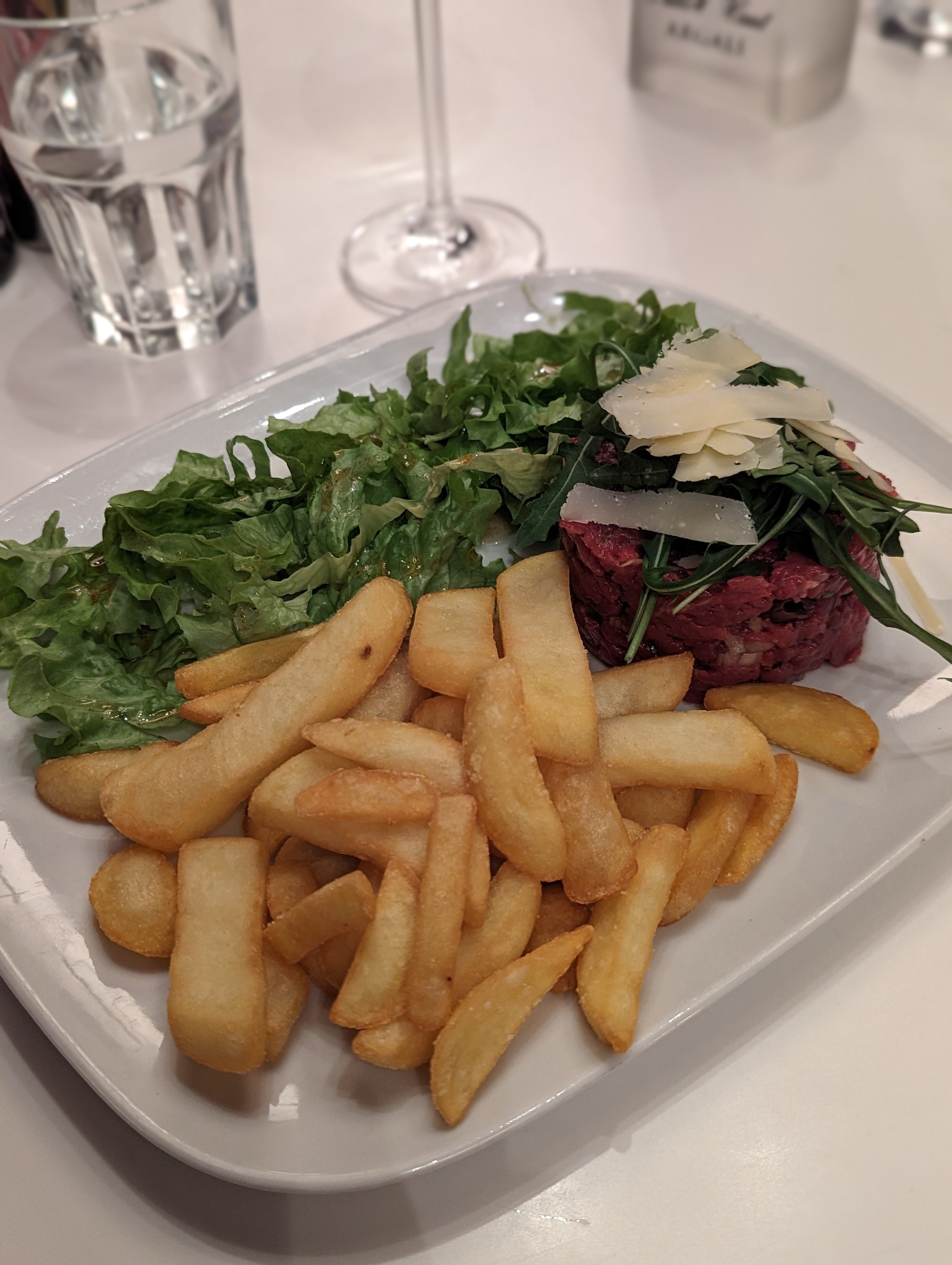 Tres longue attente même si on precise qu'on qu 1h, service perdu. Les gens arrivés 15 mn apres nous on eu leur commande avant. Pas sorcier de sortir un steak frites eux c'était pizza, et comme nous steak frites. Serveuse spéciale sans humour, donc pas pris de dessert car 1h pour manger un steak frites plus de temps pr 1 café ou 1 dessert.