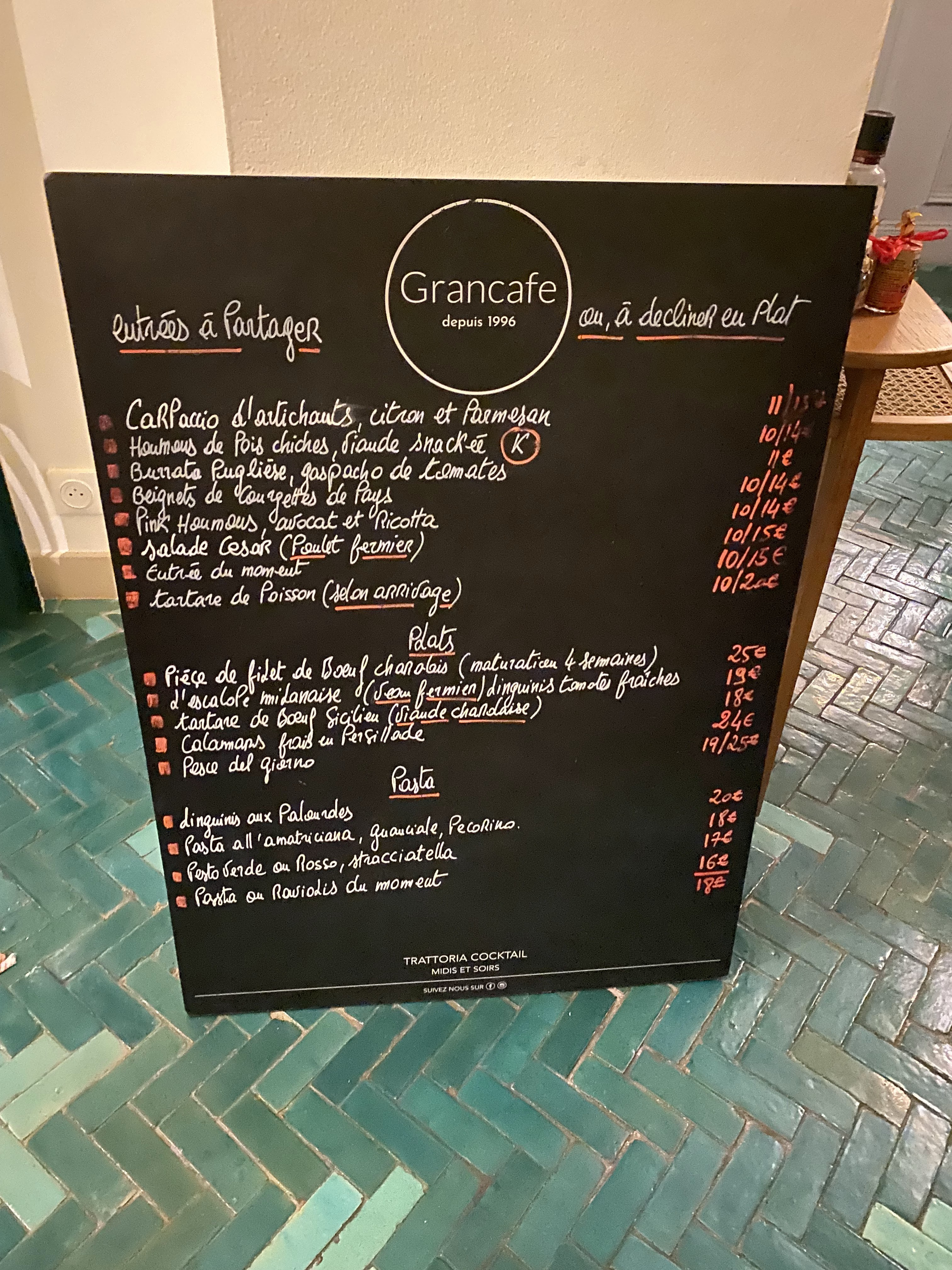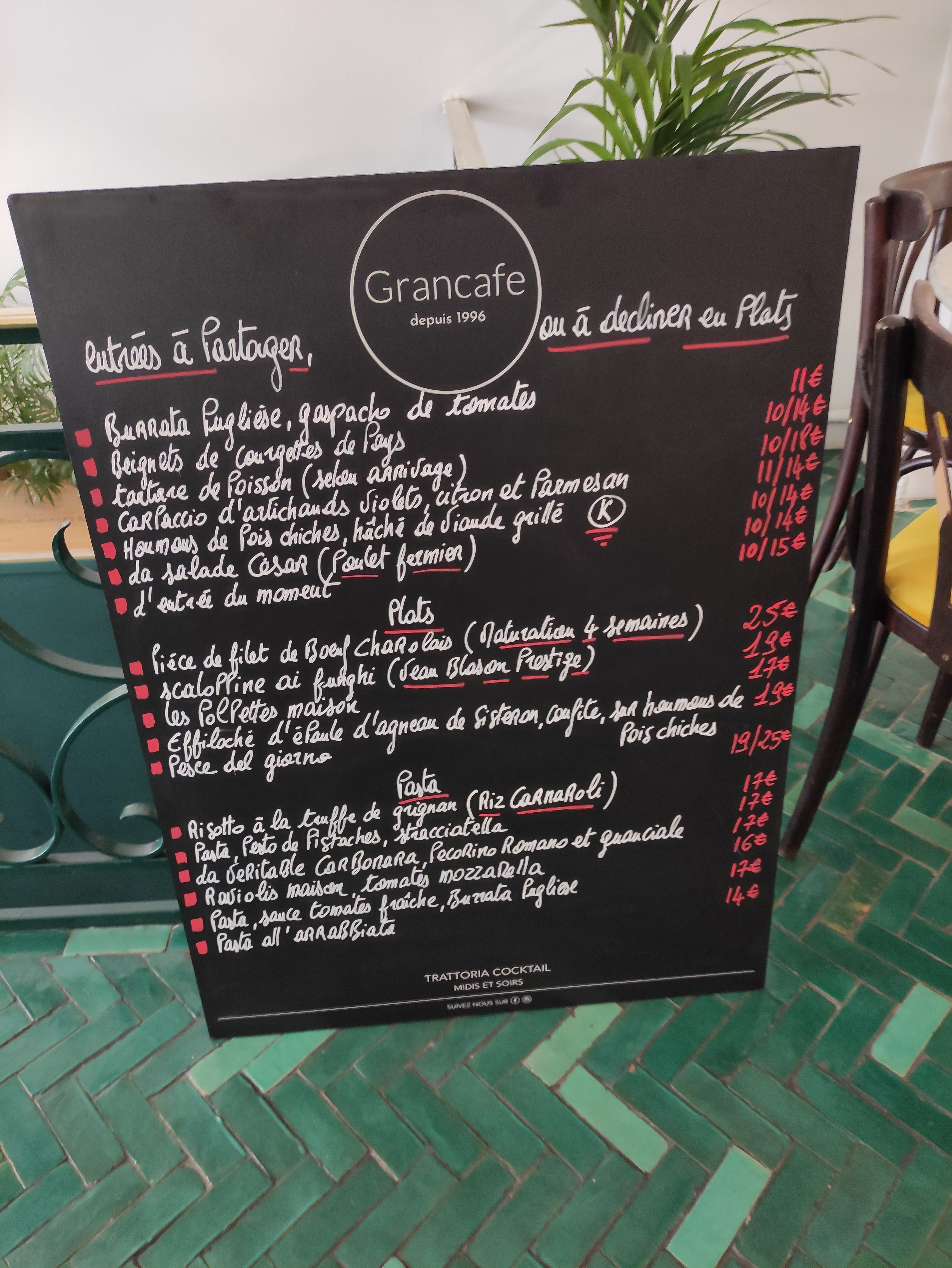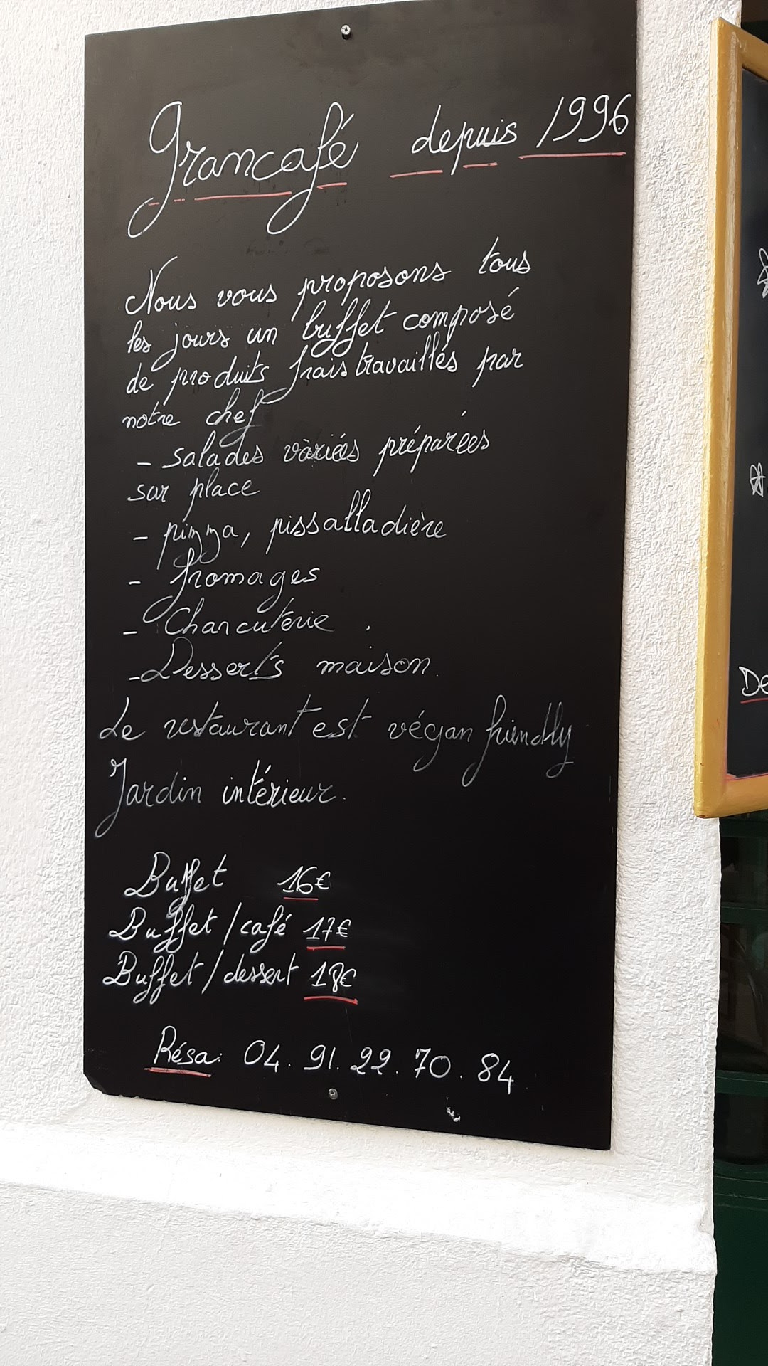 La seule raison pour ne pas donner 5xxxxx à cette excellente adresse est l'incohérence entre le NOM (consonnance ibérique, évoquant le bar espagnol à tapas et avec comptoir au bar) et ce qu'est le Gran Café : un restaurant à la déco agreablement provençale, à la cuisine inventive et joliment maitrisée, à un accueil de bonne facture (elegance et affabilité), à un espace dinatoire elegant (noter la presence d'un patio), le tout à des prix acceptables. Une adresse gustative vraiment seduisante. Allez-y !