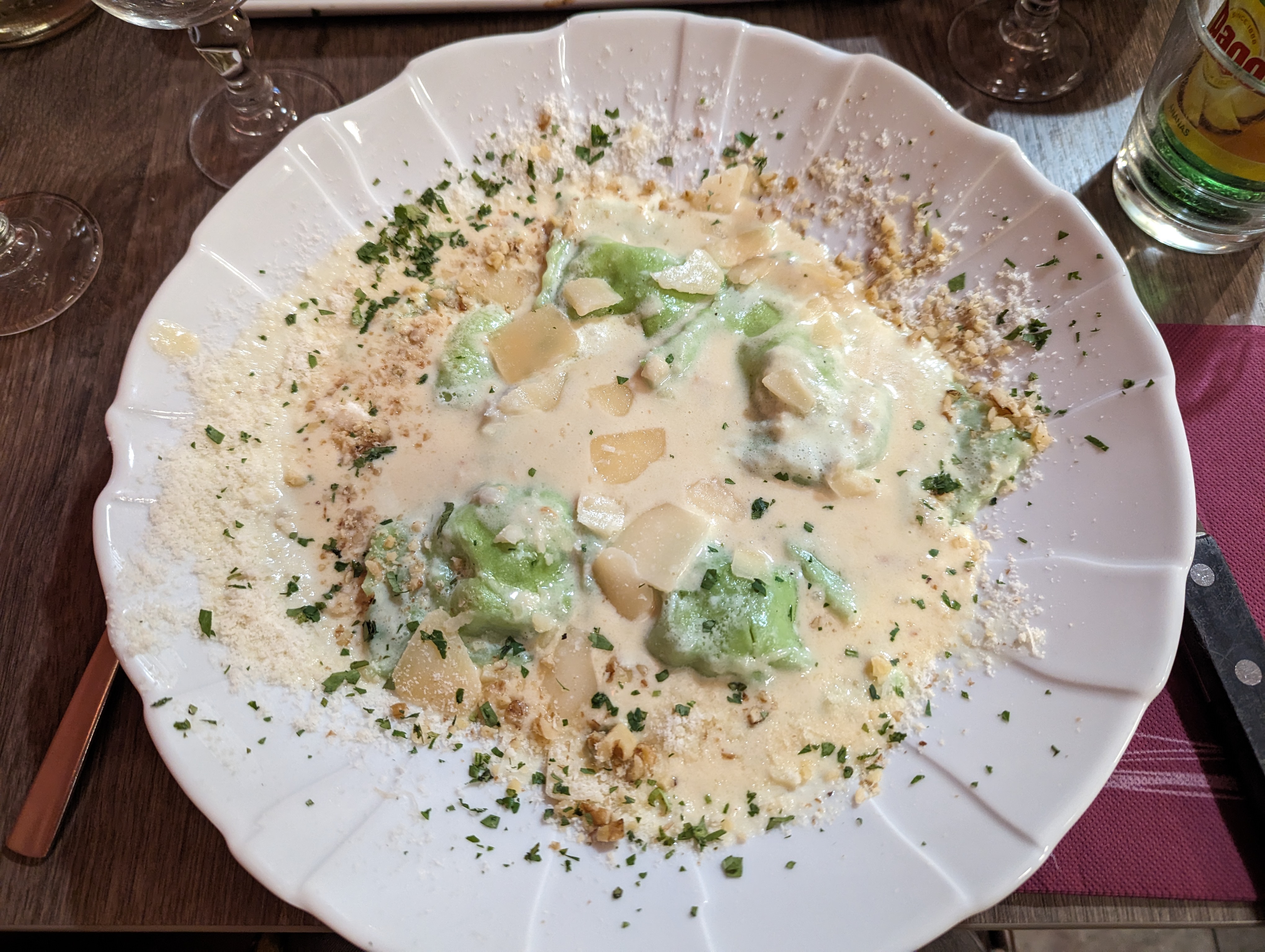 Une excellente adresse. Du fait maison, des saveurs délicieuses pour le palais, copieux et fraîcheur des produits. Nous nous sommes arrêtés par hasard et je découvre avec les avis, la notoriété de l’établissement. Le pesto mais quel bonheur ! Le carpaccio de poulpes raffiné et délicieux, les raviolis fourrés aux poires, noix et sauce gorgonzola sont excellentissimes. Le spritz est bien dosé, parfait. Le service est rapide très pro, avec le sourire et bienveillant. Merci à la patronne et jeune homme hyperprésents et investis dans leur métier. Bravo au chef et son équipe. Nous sommes de passage mais on fera le bouche à oreille