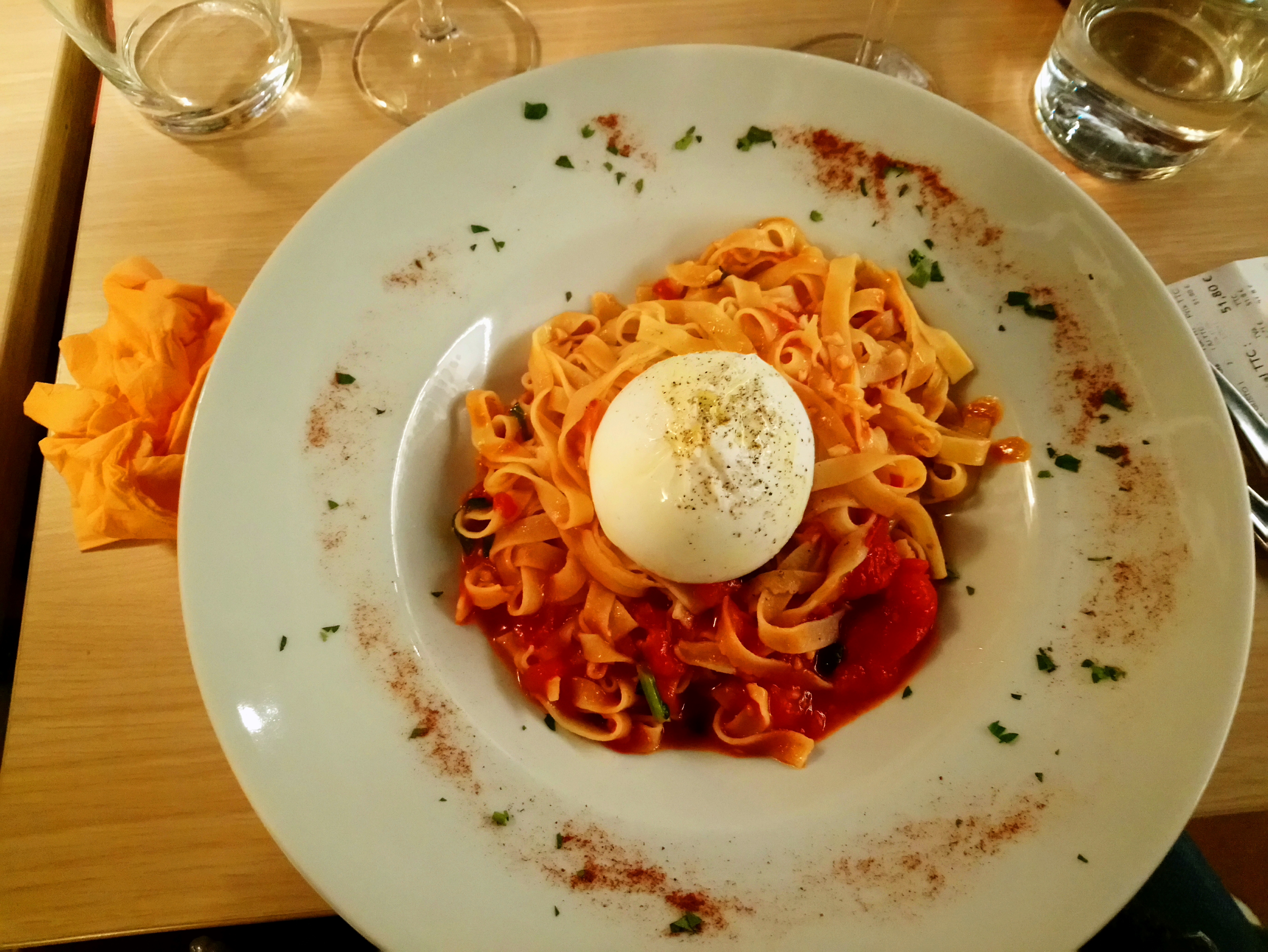 les pâtes fraîches faites maison sont top. dommage qu’il n’y ai aucun plat de pâte servit avec de la viande. en revanche le service est malheureusement déplorable, responsable mal aimable et serveuse peu à l’écoute et ne connaît pas sa carte.. bien triste (je demande un verre de vin dont je n’ai jamais vu la couleur)