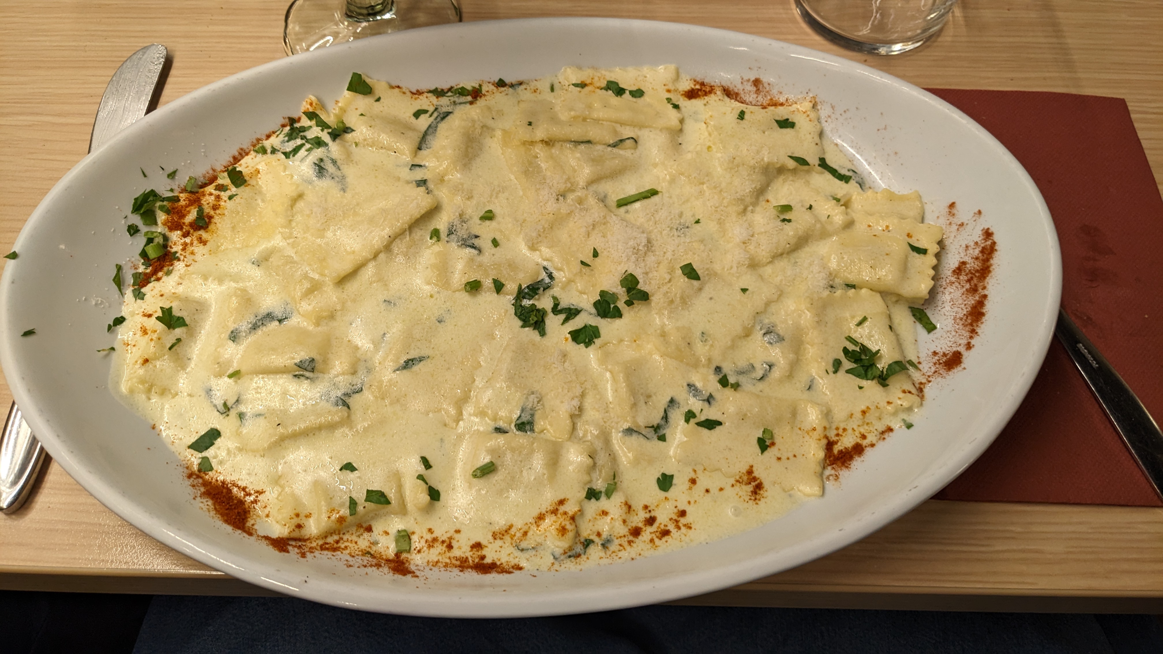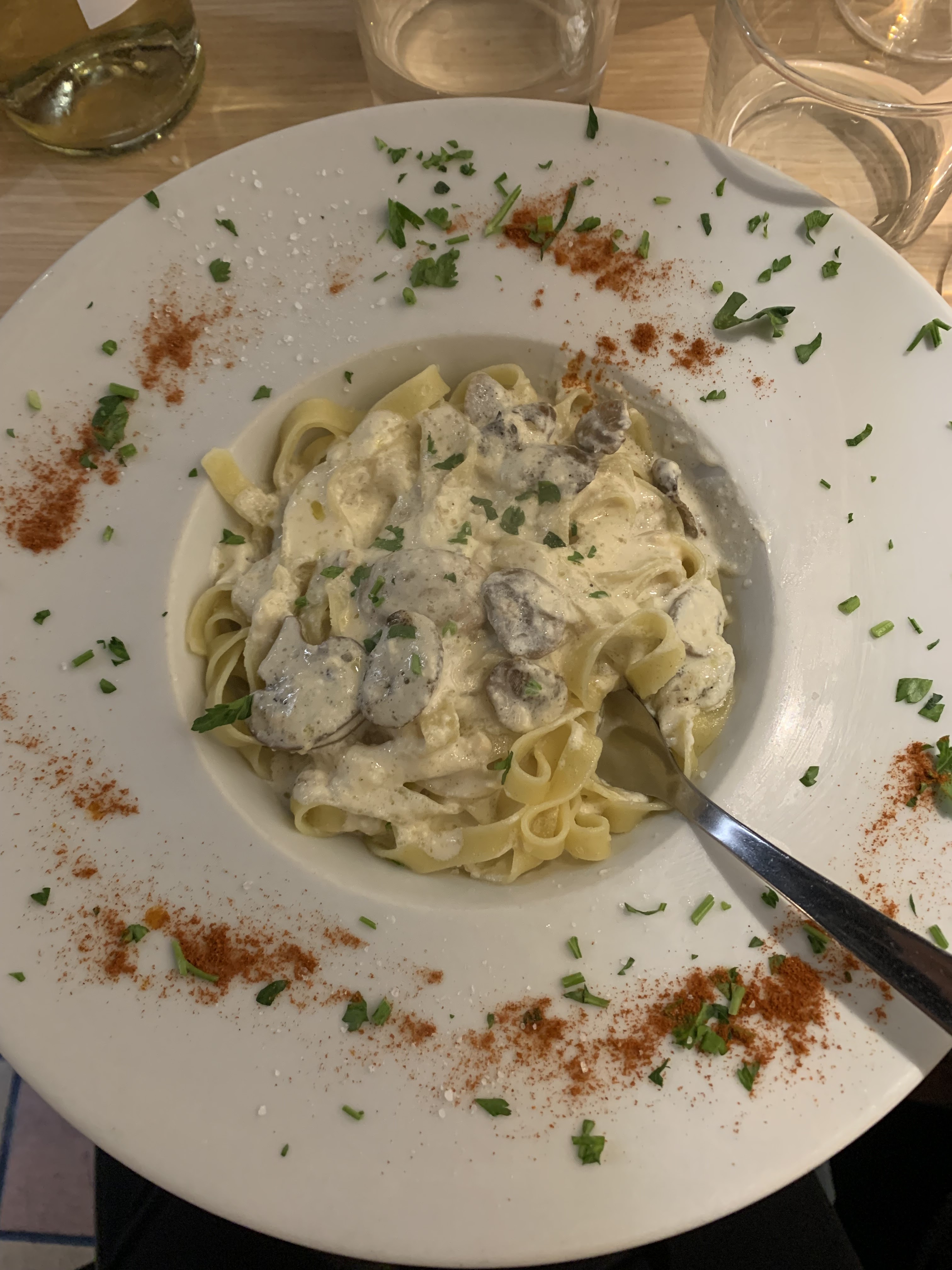 On s’attendait à réellement mieux, le restaurant est tellement bien noté, on se demande si ce sont de vrais commentaires ou non. Nous sommes arrivés, on nous a placés et on nous a fait se déplacer parce que soit disant la table de 4 personnes pouvait se séparer en deux au cas où. Pour finalement placer quelques minutes après une autre famille de 4 à cette même table. Puis, on commande une bouteille de vin avec 3 verres et on nous ramène un verre de ce vin, juste ça. On réclame donc la bouteille et les 3 verres, la serveuse nous les ramène dont un avec des traces de rouge à lèvres dessus.. On demande si c’est possible d’avoir une pizza (de l’extension « Di Gusto » juste à côté : même patron mais pas même cuisine), qu’on nous refuse. Quelques minutes plus tard, à la table d’à côté, ils demandent exactement la même chose, et on leur accepte à eux. Légèrement injuste, non ? Les raviolis dites « truffées » n’ont aucun goût de truffes.. Enfin bon.. Dommage pour un cadre aussi sympa.