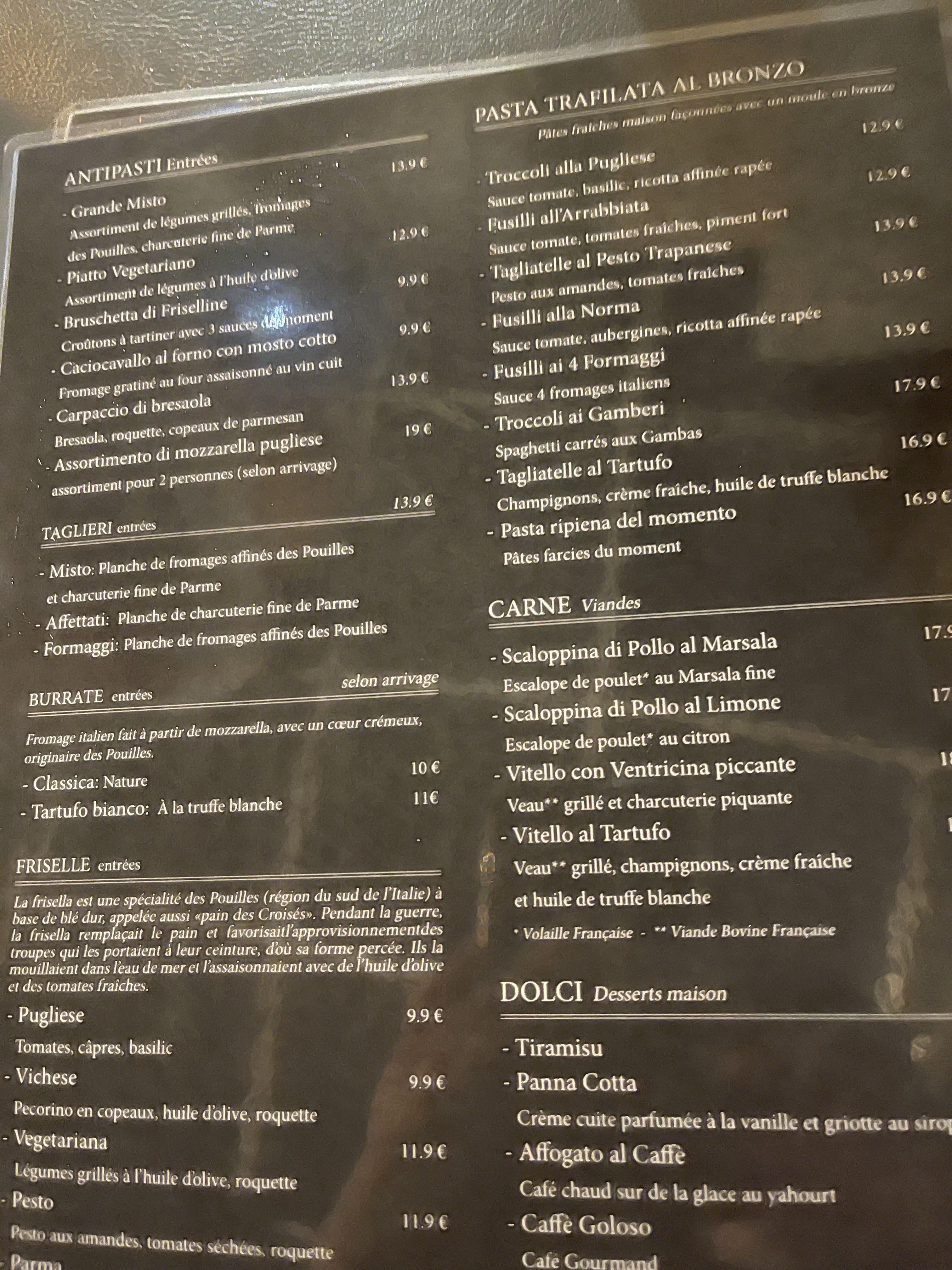 Tres bon accueil Tres bons conseils Tres bons plats italiens par un chef provenant des Pouilles Donc on très bon moment à goûter de la burrata à la truffe blanche des pâtes tres bien cuites une sauce tomate excellente le tout accompagné de rosé des Pouilles A essayer sans hésiter