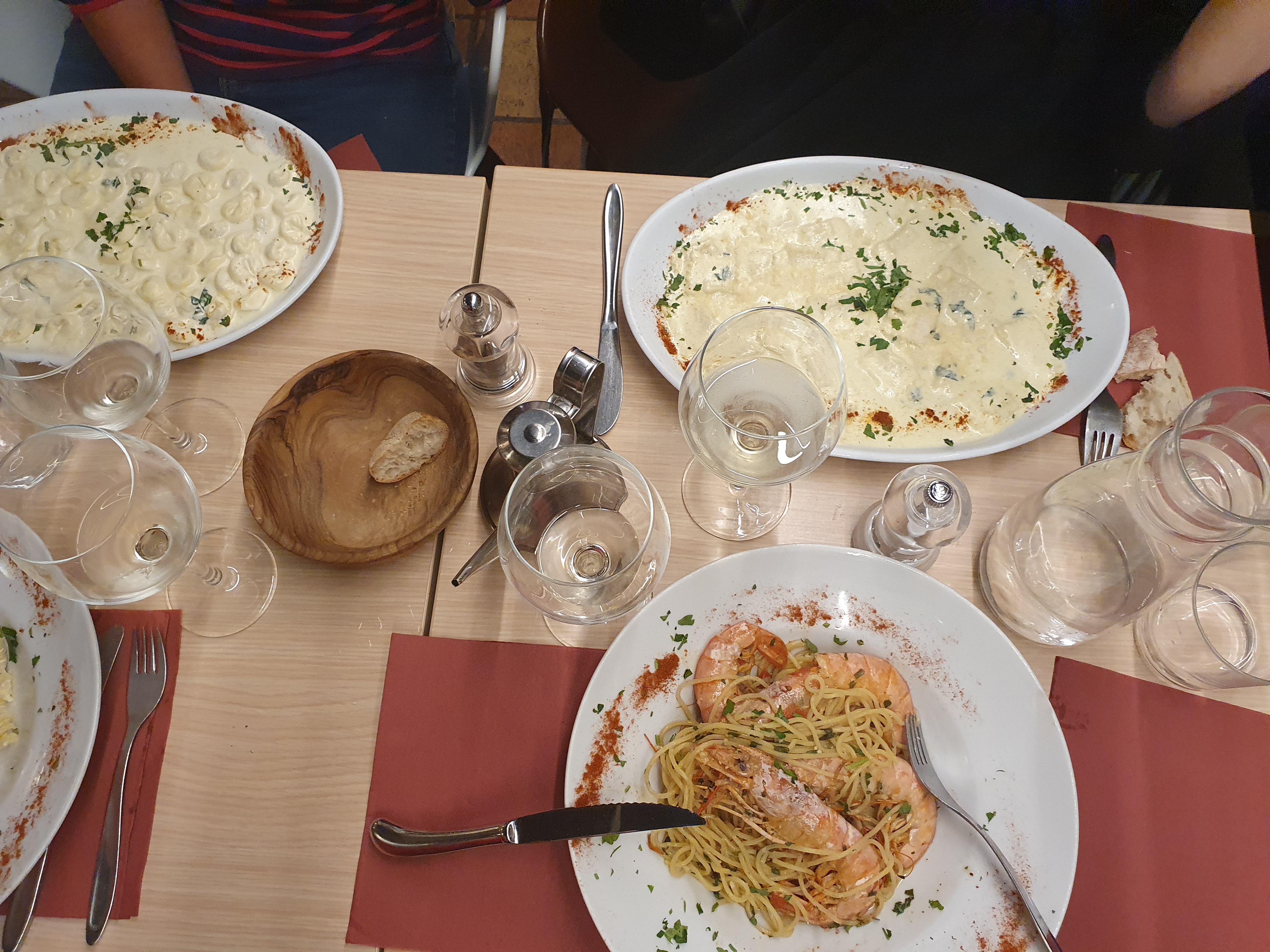 Très déçue par notre repas chez Gusto. Nous avions réservé à 21h30, installés seulement 20min plus tard, nous avons appris que les restaurants de pâtes et de pizzas étaient dissociés, donc impossible de commander des pizza … (lors de votre réservation il faut préciser si vous voulez pâtes ou pizza). Très bonne burrata, en revanche les plats de pâtes étaient fades et peu assaisonnés (pâtes aux gambas).