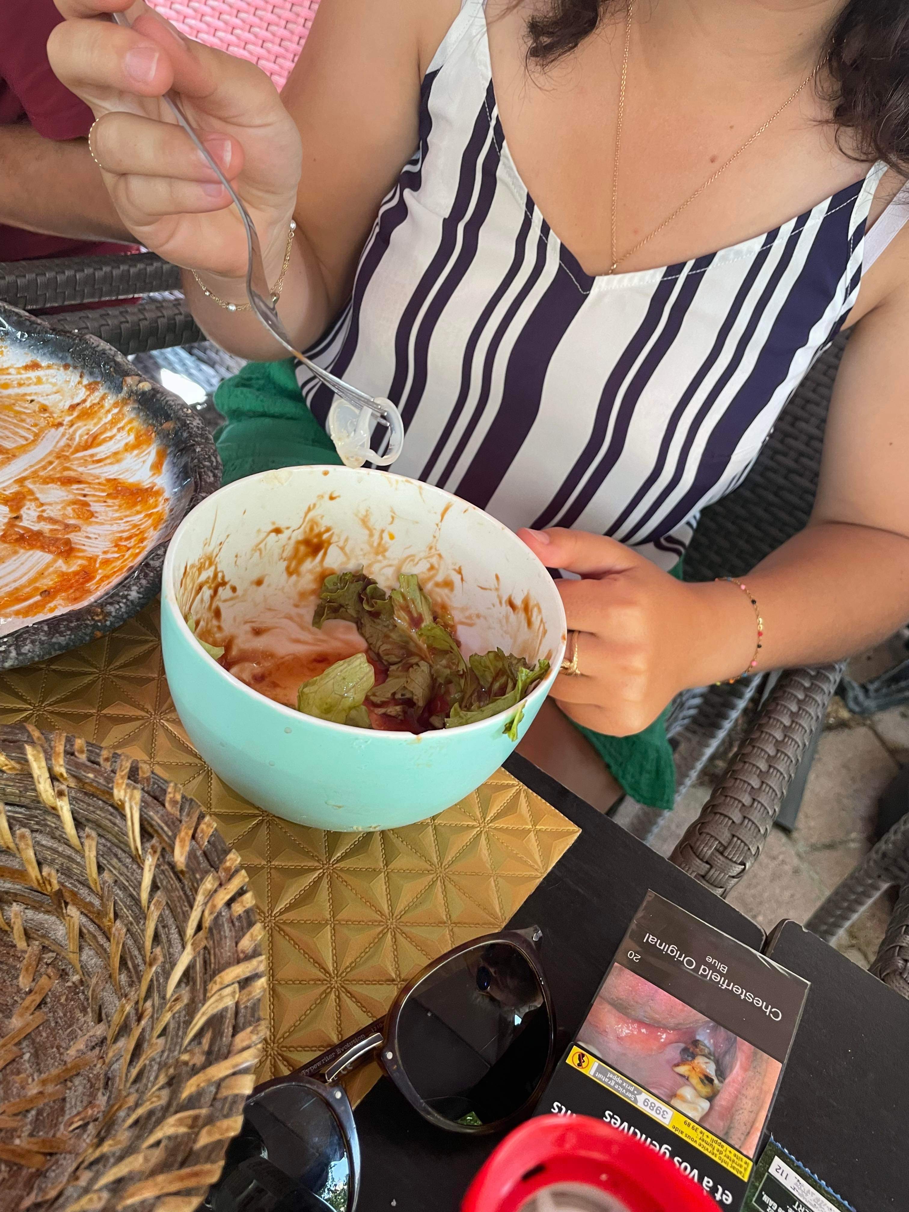 On a retrouvé ça dans notre salade.. seul réaction : « wallah ils sont sérieux » avec des rires… La seule étoile est pour le serveur qui nous accueillis ! Pour le reste restaurant à bannir, la chasse d’eau des toilettes ne fonctionne pas avec des petits cadeaux au fond des WC… dommage.